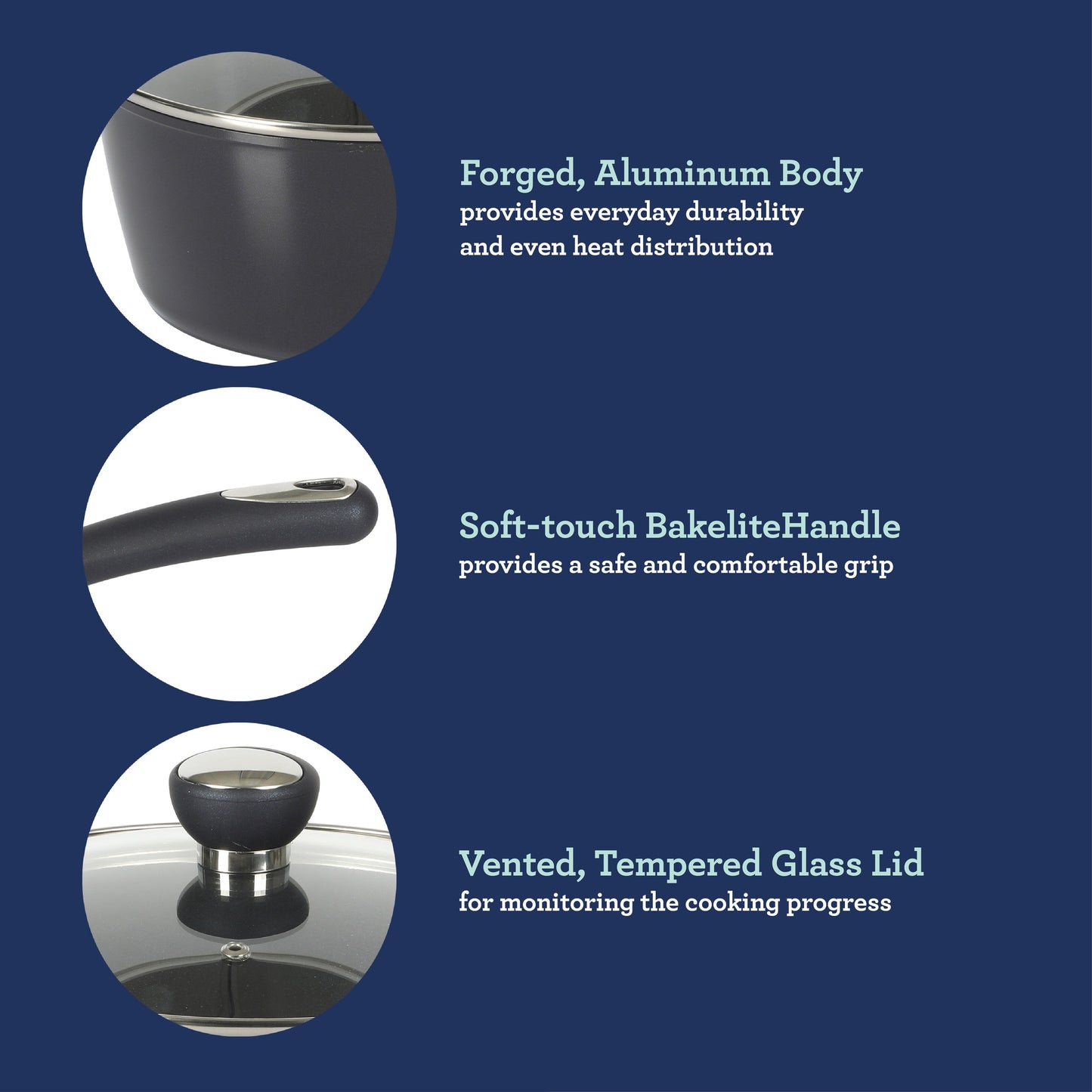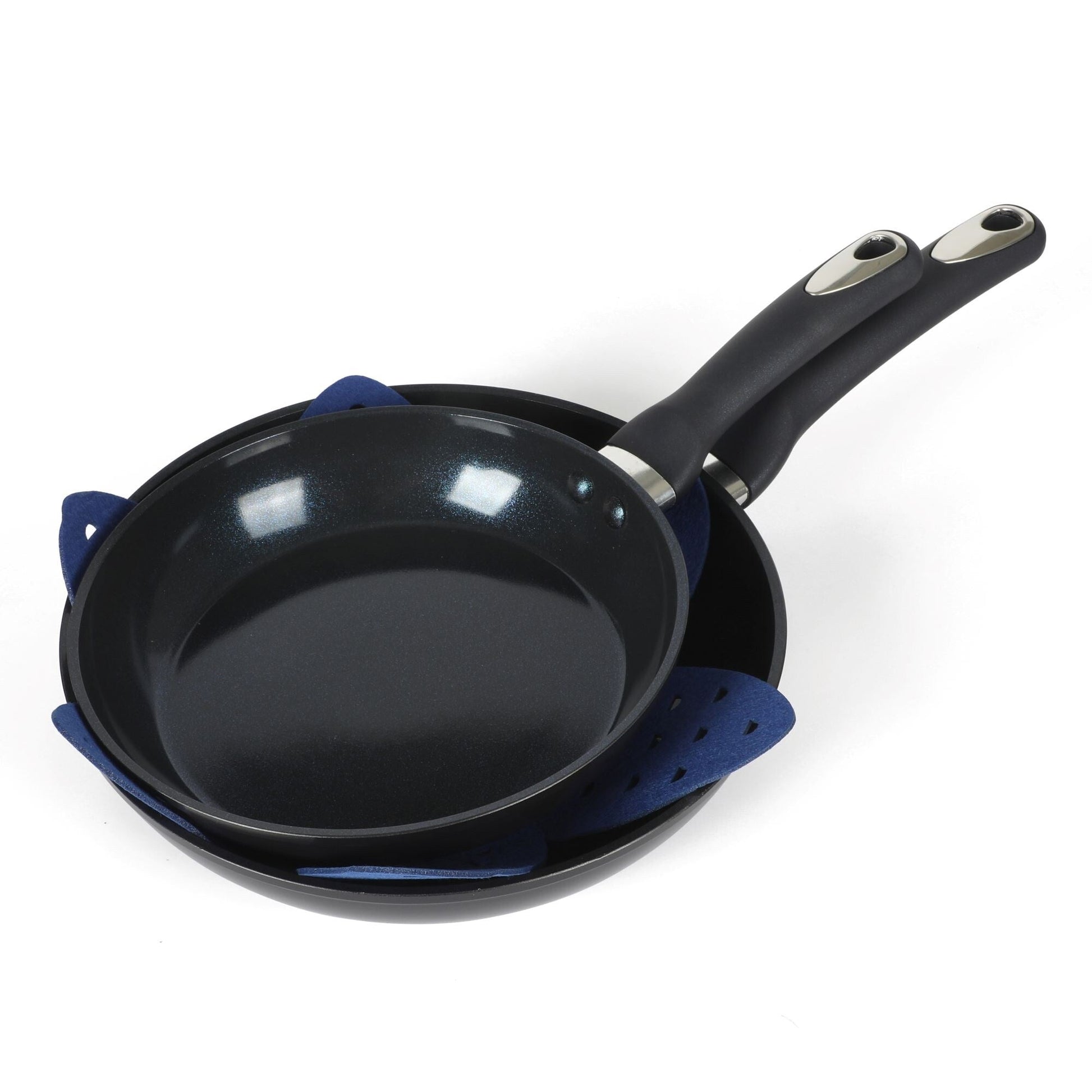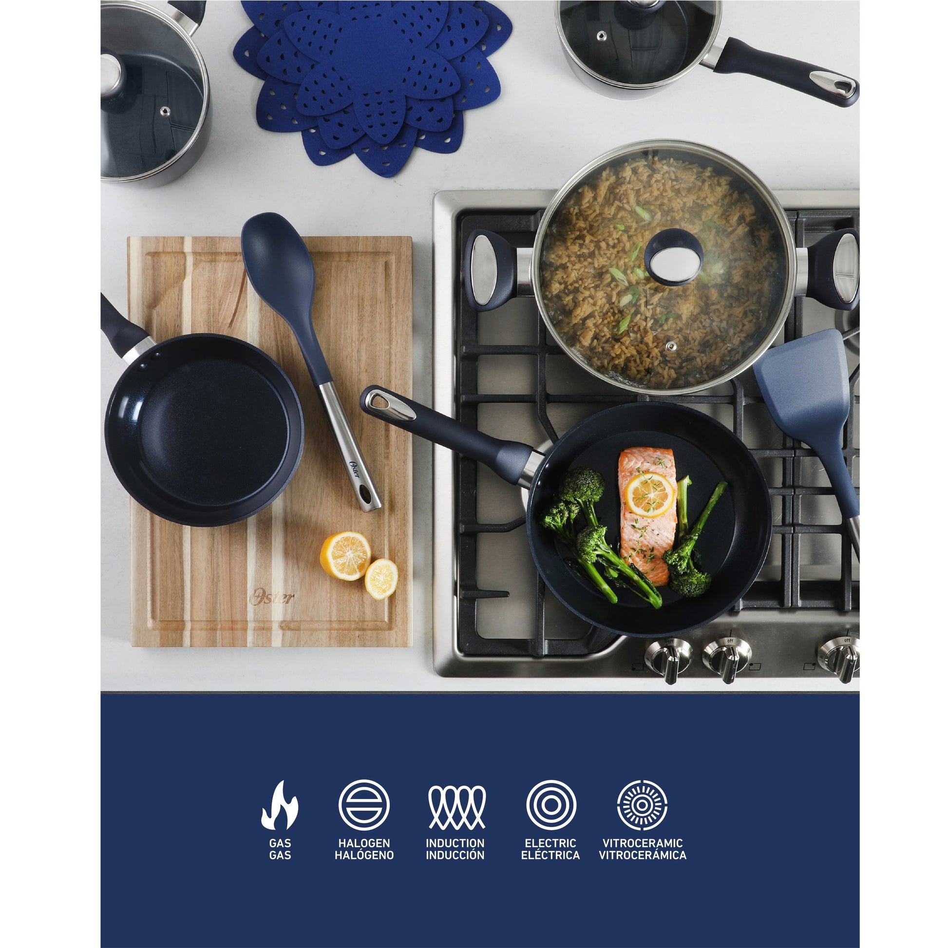 * CERAMIC NONSTICK INTERIOR: Beautifully coated with a shimmering, sapphire blue finish, the ceramic nonstick interior is the preferred option for safer and healthier cooking. Made without PFOA and PTFE, these nonstick pots and pans help eggs, omelettes and other dishes slide off without effort. Less food residue is left on the cookware, making them easy to clean.
