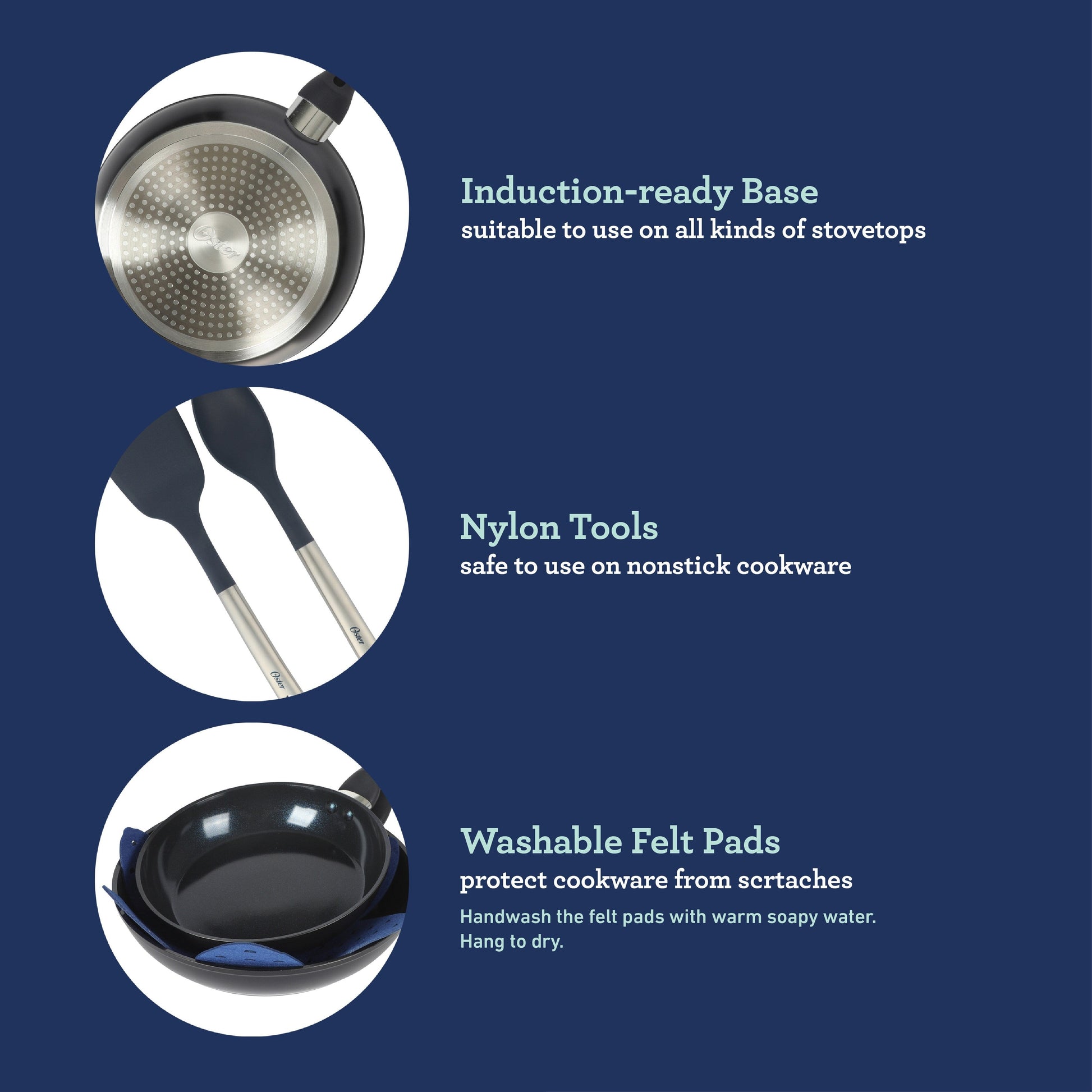 * A COMPLETE SET INCLUDES: Two frying pans (8 inches and 9.5 inches), two saucepans with lids (1.2 quarts and 1.9 quarts), one 4.2-quart Dutch oven with lid, one nylon turner, one nylon spoon and 4 protective felt pads