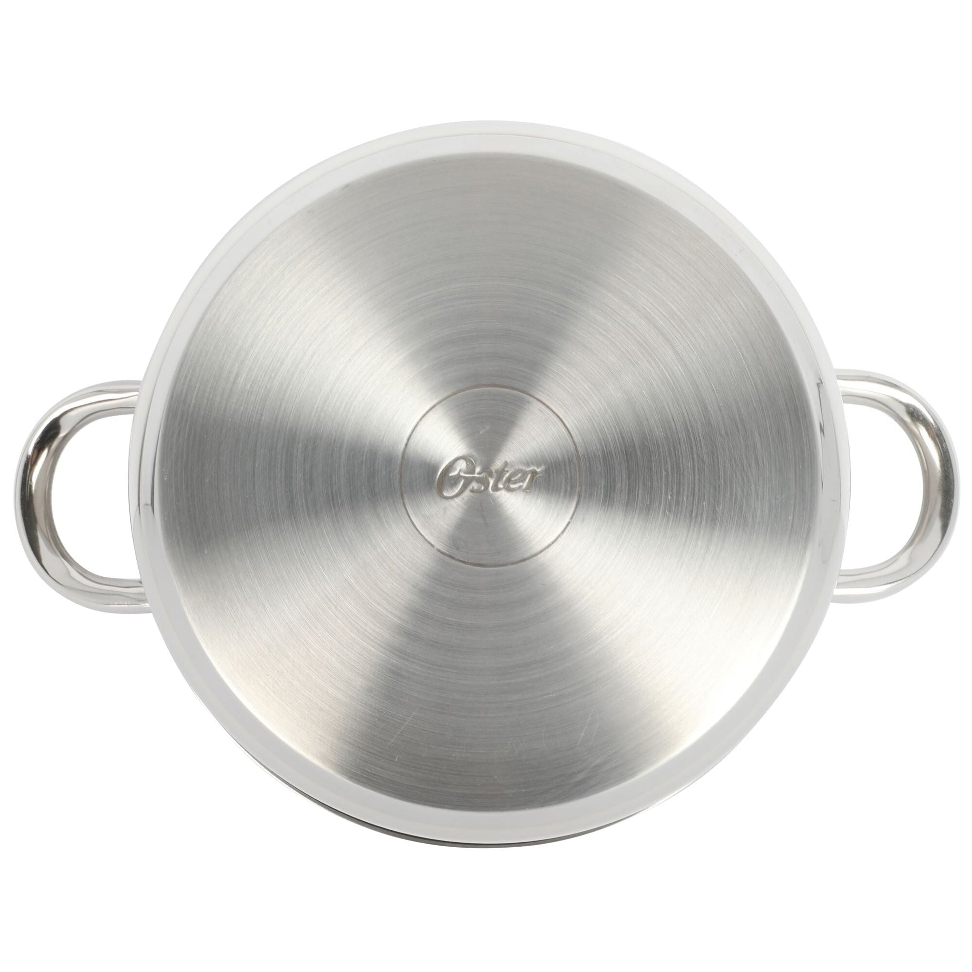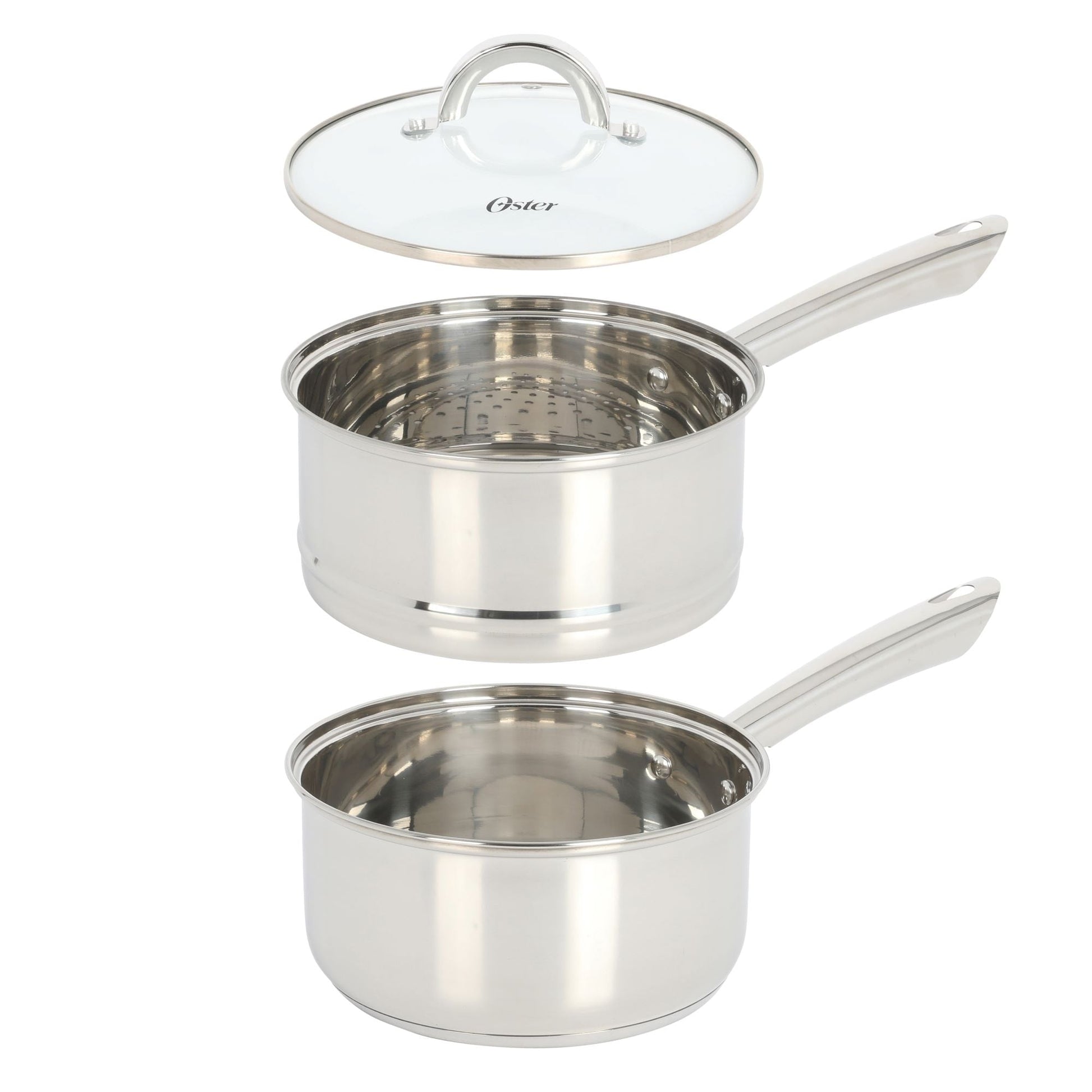 Designed with utility and beauty in mind, the Oster Sangerfield 12-piece Stainless Steel Cookware Set with Kitchen Utensils is a collection of useful pots, pans, and cooking utensils to serve up family favorites and new recipes every day. Constructed from mirror-polished stainless steel, each pot and pan has an encapsulated aluminum base that distributes heat efficiently to cook food evenly. The beautiful polished exterior resists rust and is easy to clean, perfect and convenient for everyday use. All cookware feature dual-riveted handles for a safe and comfortable grip when lifting and serving. The tempered glass lids provide visibility to help monitor cooking progress. The set comes with three nylon cooking utensils that do not scratch and scrape the cookware's interior. Each cooking tool has an ergonomic handle for a light but comfortable grip when mixing and serving. Dishwasher safe. Do not put in a conventional or microwave oven.