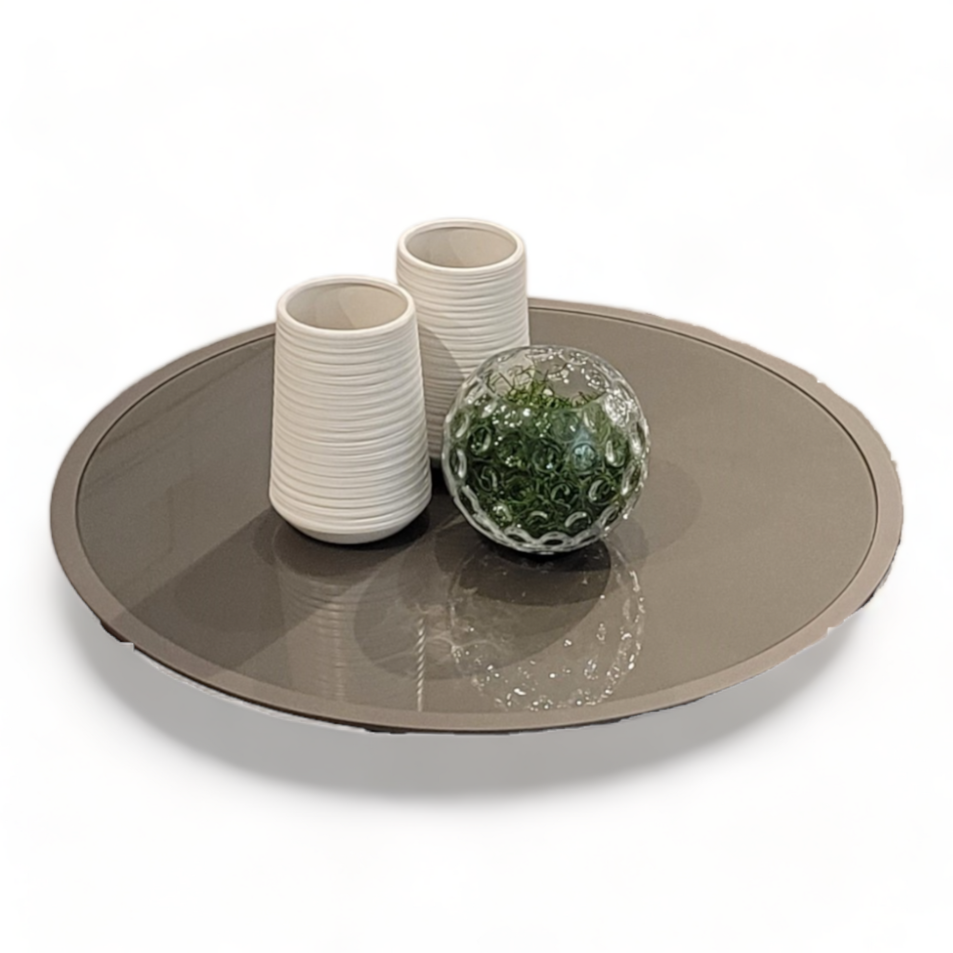 Ses bases magnifiquement courbées et son plateau en verre coloré raffiné avec finition métallique Urano font de ce design une réalisation déterminante de l'esthétique moderne.