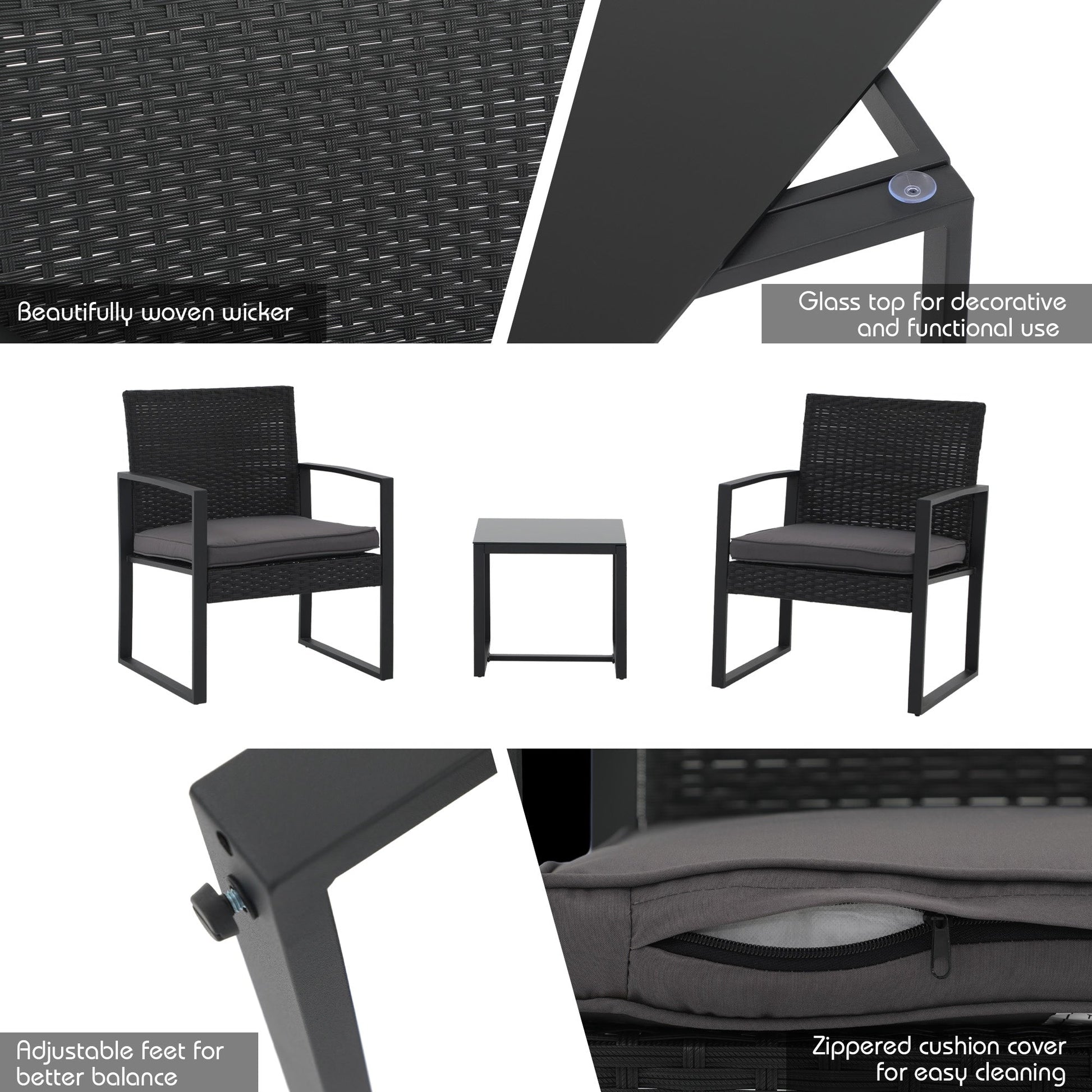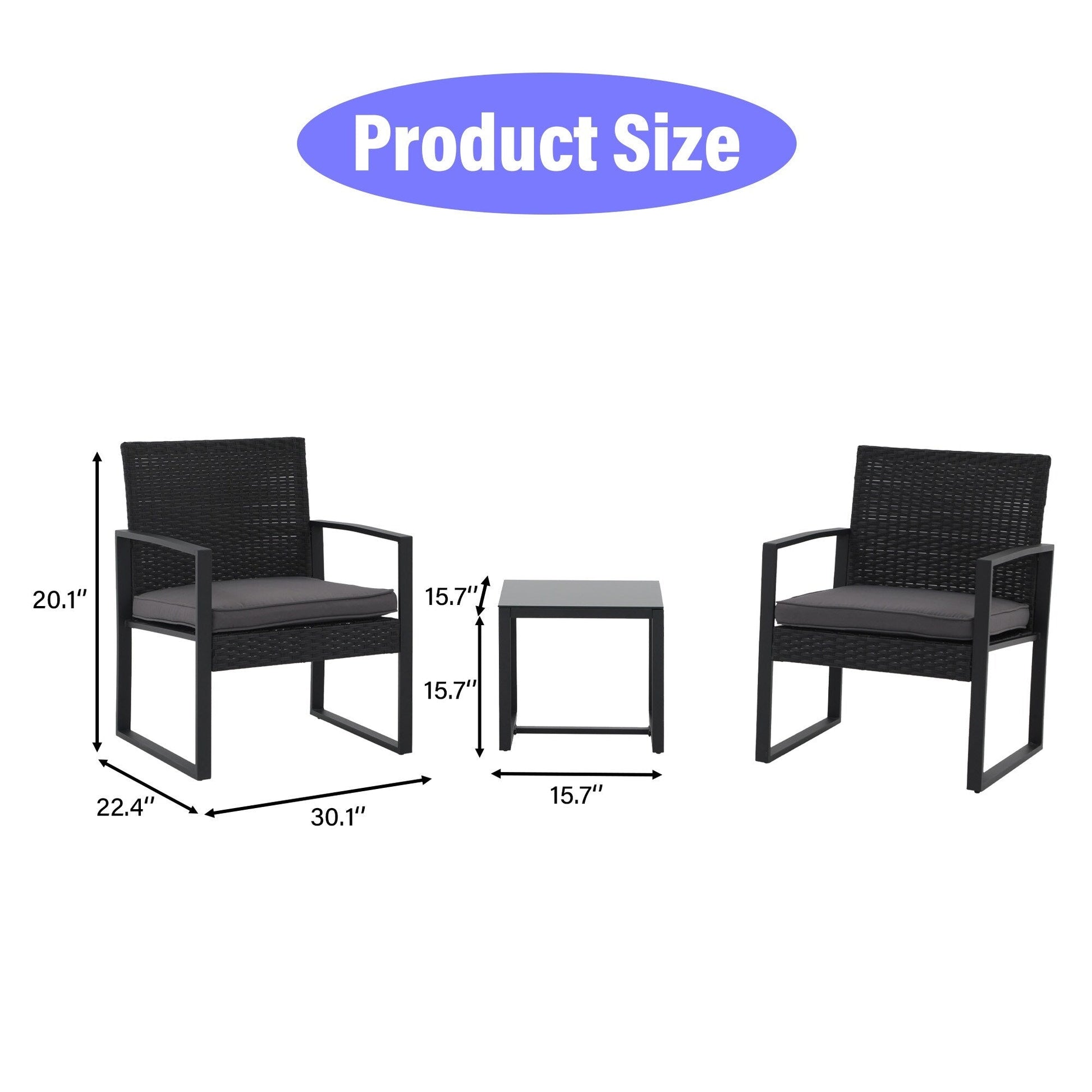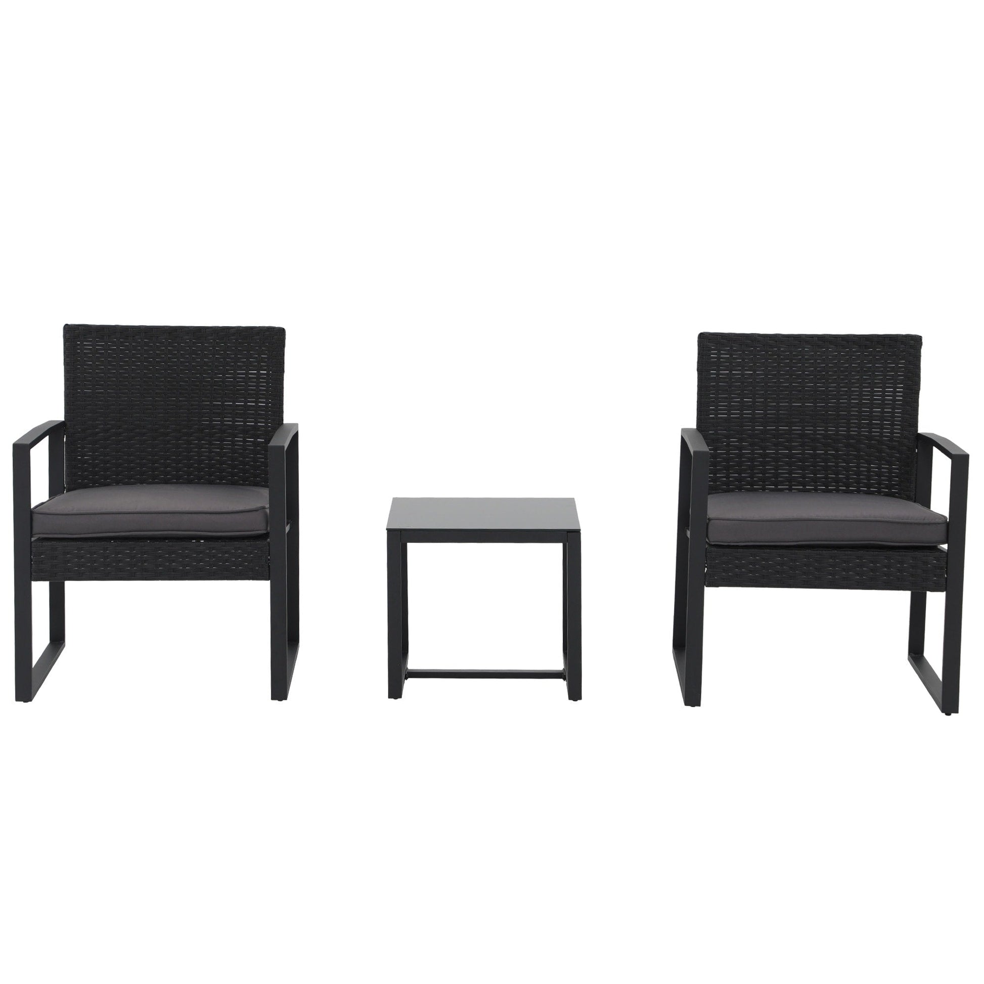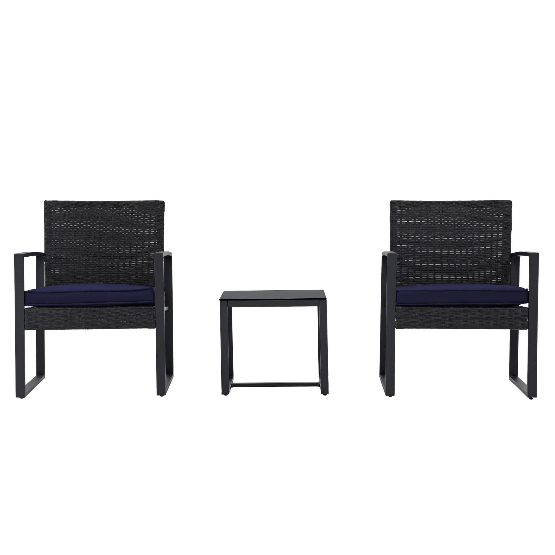 Update your outdoor patio area and create the cozy seating space with this 3 pcs wicker chair set. Designed to withstand a range of climates, the chairs is crafted from the powder-coated steel frame and wrapped with high quality PE wicker. Topped with sofa padded cushion on the chairs, this practical chat set will bring the optimal seating experience. Square side table comes with glass top is perfect to hold snacks and and completes the set's chic look. The black tone of set makes it easy to match with any existing decoration style.