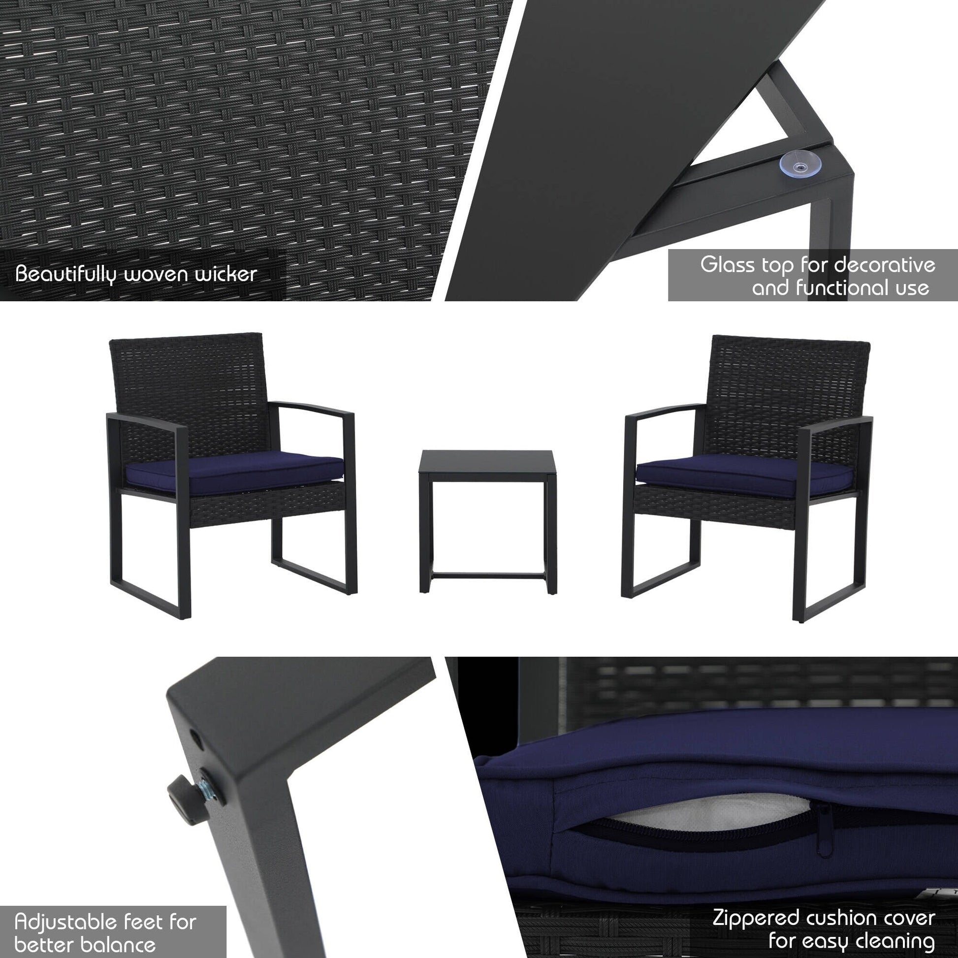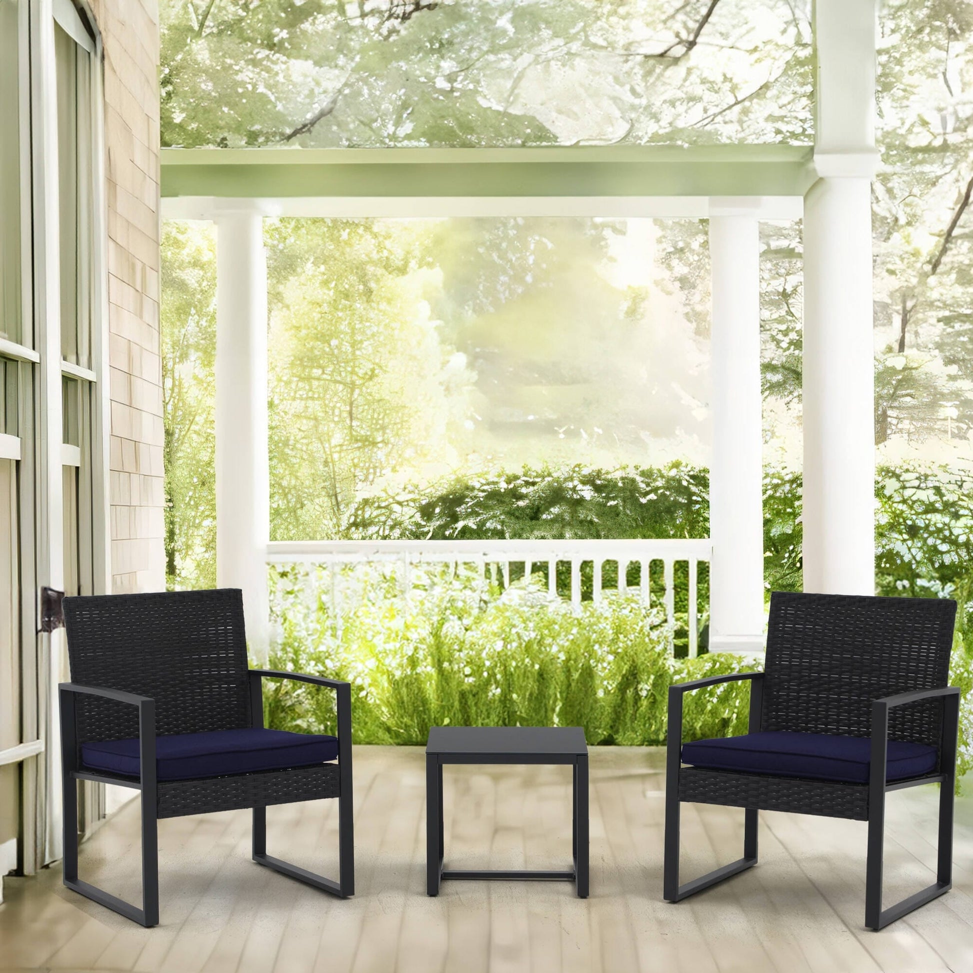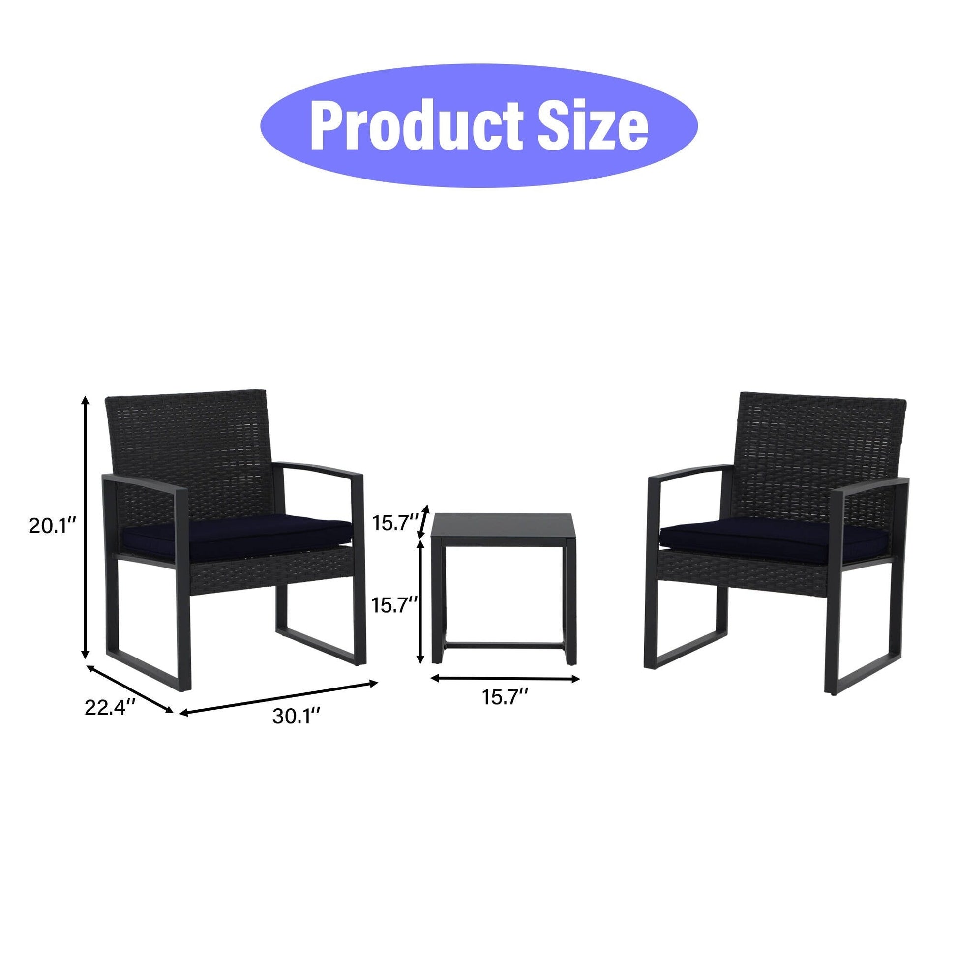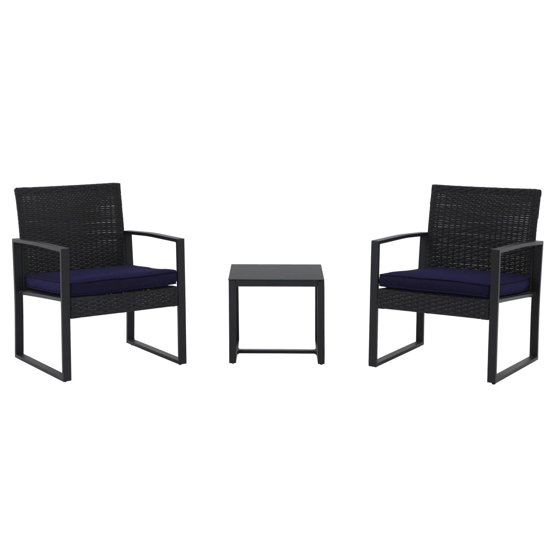 Update your outdoor patio area and create the cozy seating space with this 3 pcs wicker chair set. Designed to withstand a range of climates, the chairs is crafted from the powder-coated steel frame and wrapped with high quality PE wicker. Topped with sofa padded cushion on the chairs, this practical chat set will bring the optimal seating experience. Square side table comes with glass top is perfect to hold snacks and and completes the set's chic look. The black tone of set makes it easy to match with any existing decoration style.