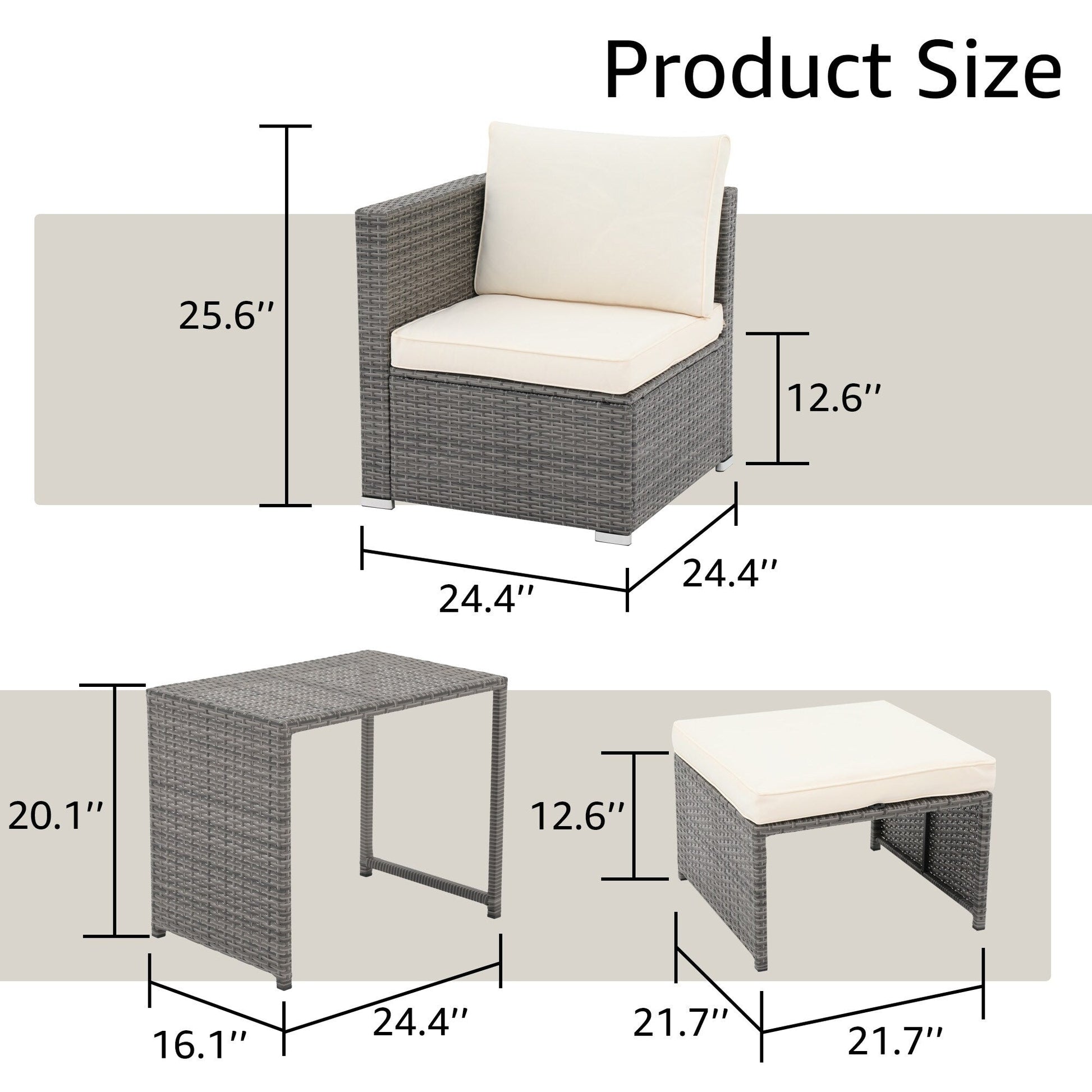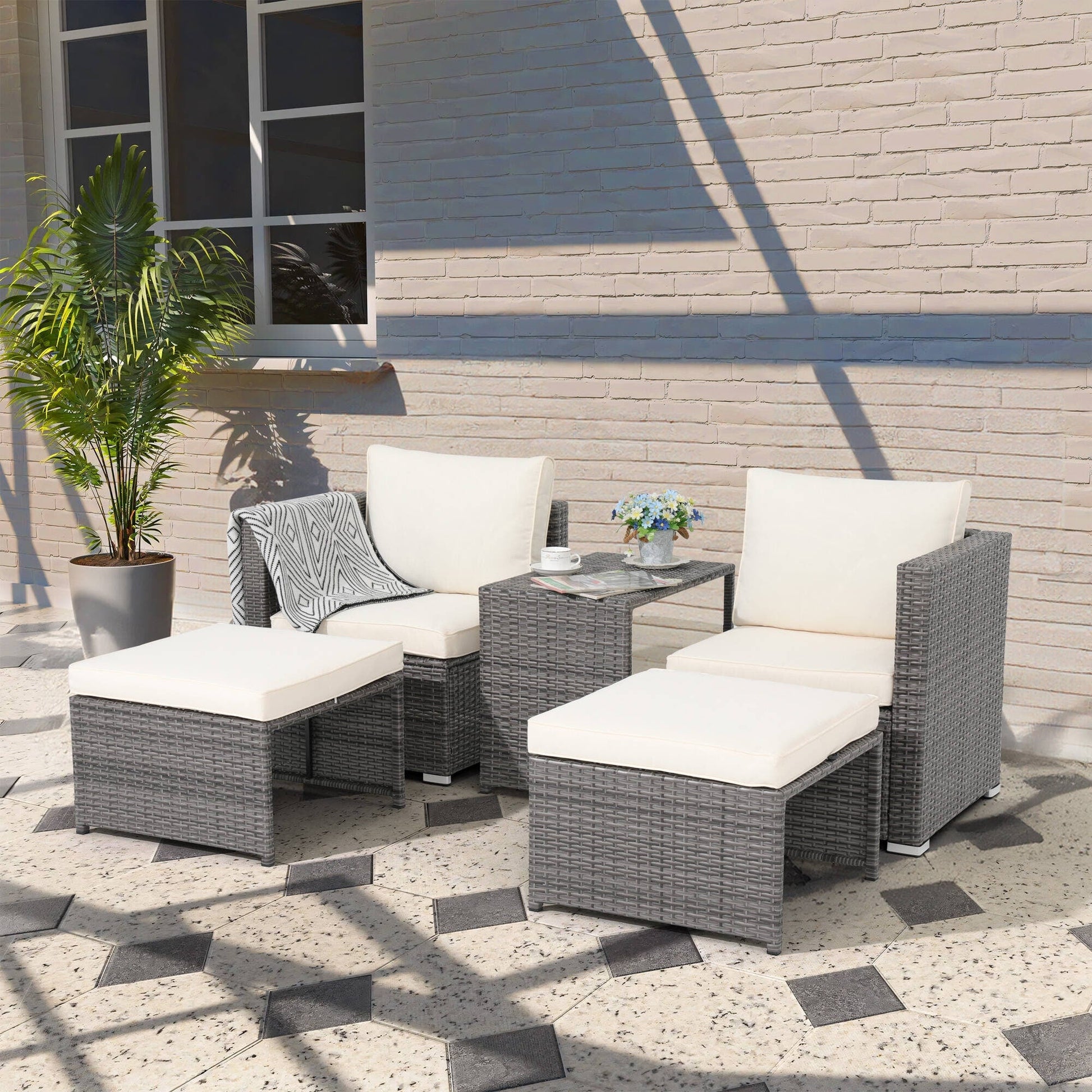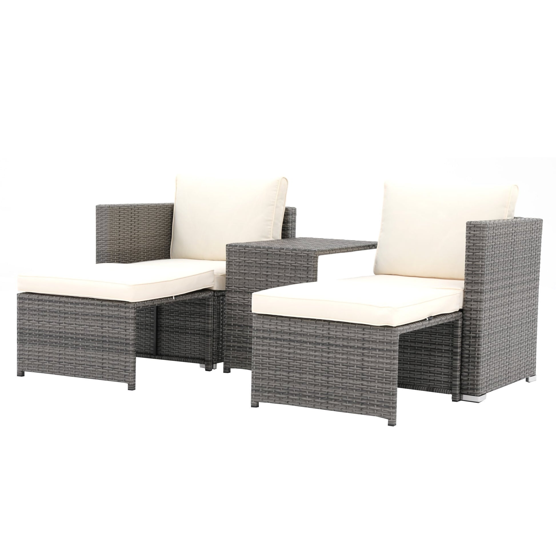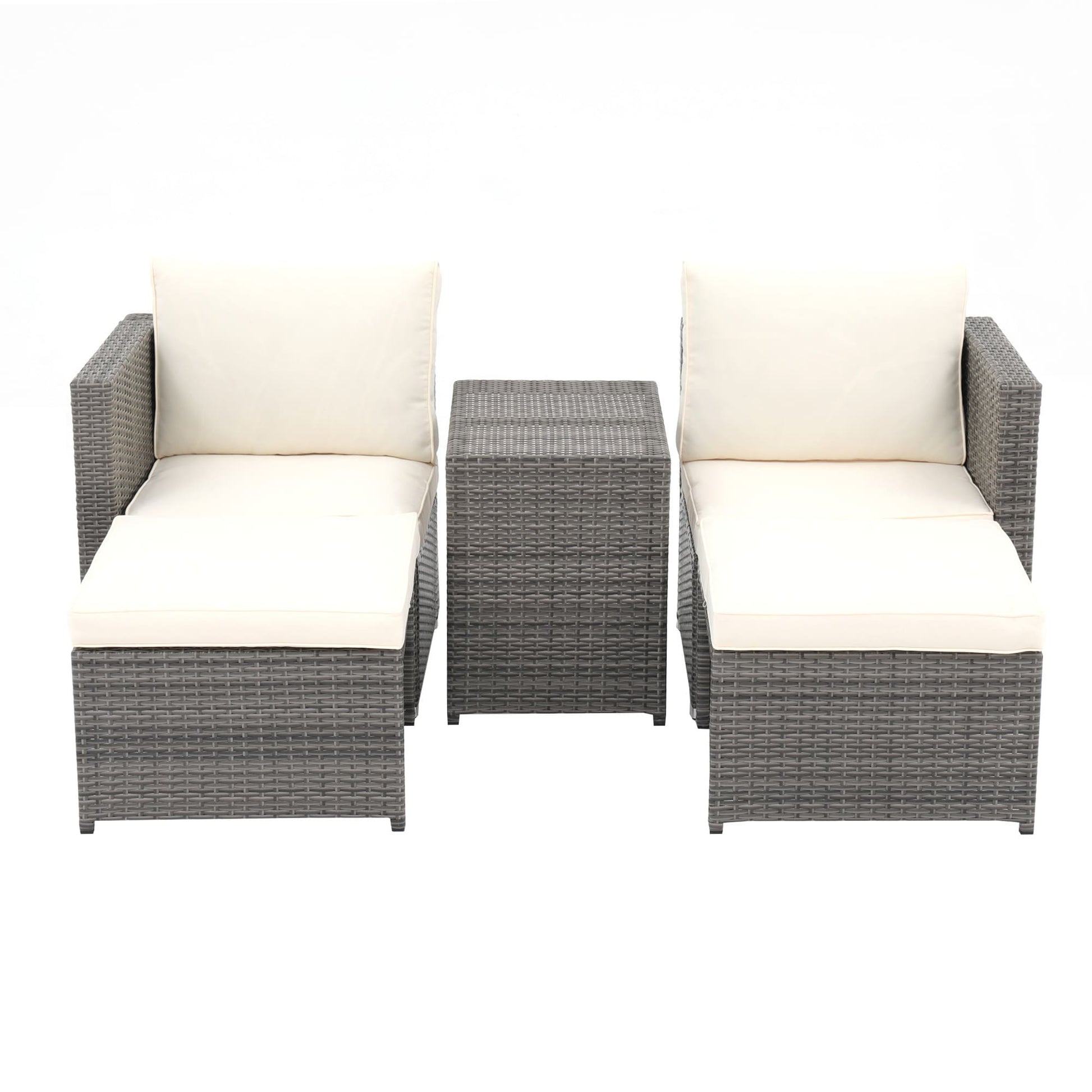 Sit back, put your feet up, and enjoy the warm breeze in pure bliss with this outdoor 5-piece wicker chair set. Designed for ultimate comfort and relaxation, this set includes 2 chairs, 2 ottomans, and 1 side table, perfect for lounging with your favorite people. Crafted with durable PE wicker and rust-free steel frame, our wicker chair set withstands a range of climates and provides worry-free use outdoors. The light grey wicker frame paired with the cozy beige cushions adds a touch of sophistication to your outdoor oasis. Get ready to soak up the sun in style on this wicker chair set!