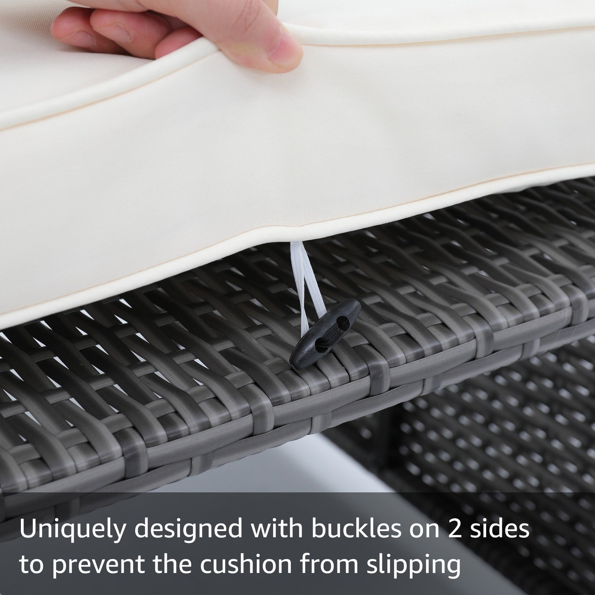 The ottoman equipped with buckles to keep cushions in place