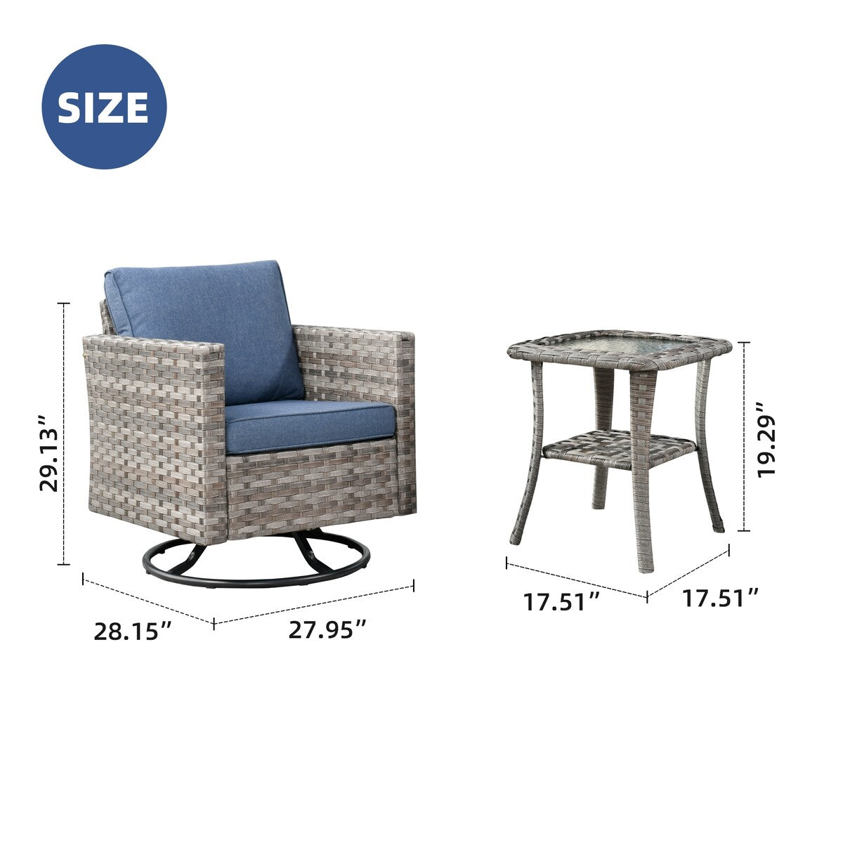 Set includes 1 swivel chair and 1 side table