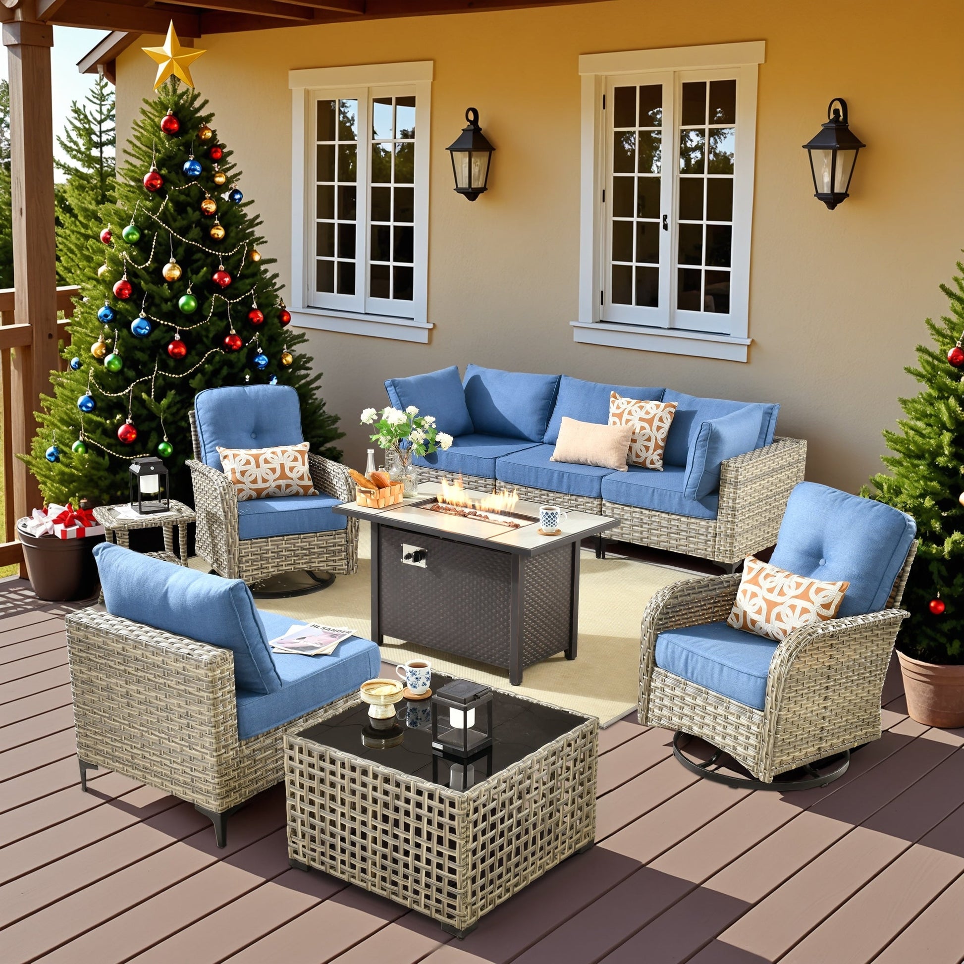 OVIOS 9 Pieces Outdoor Wicker Swivel Chair Set With Fire Table
