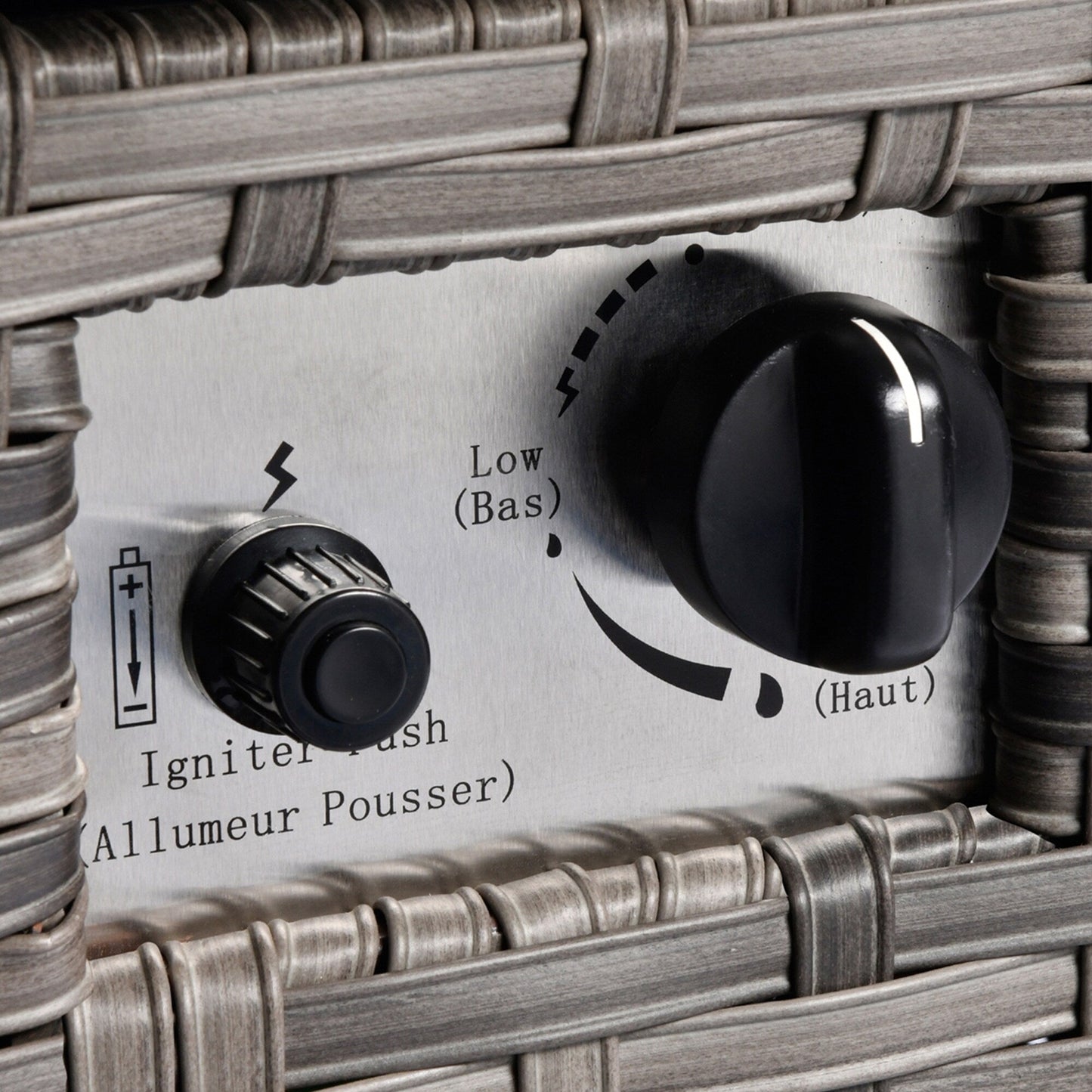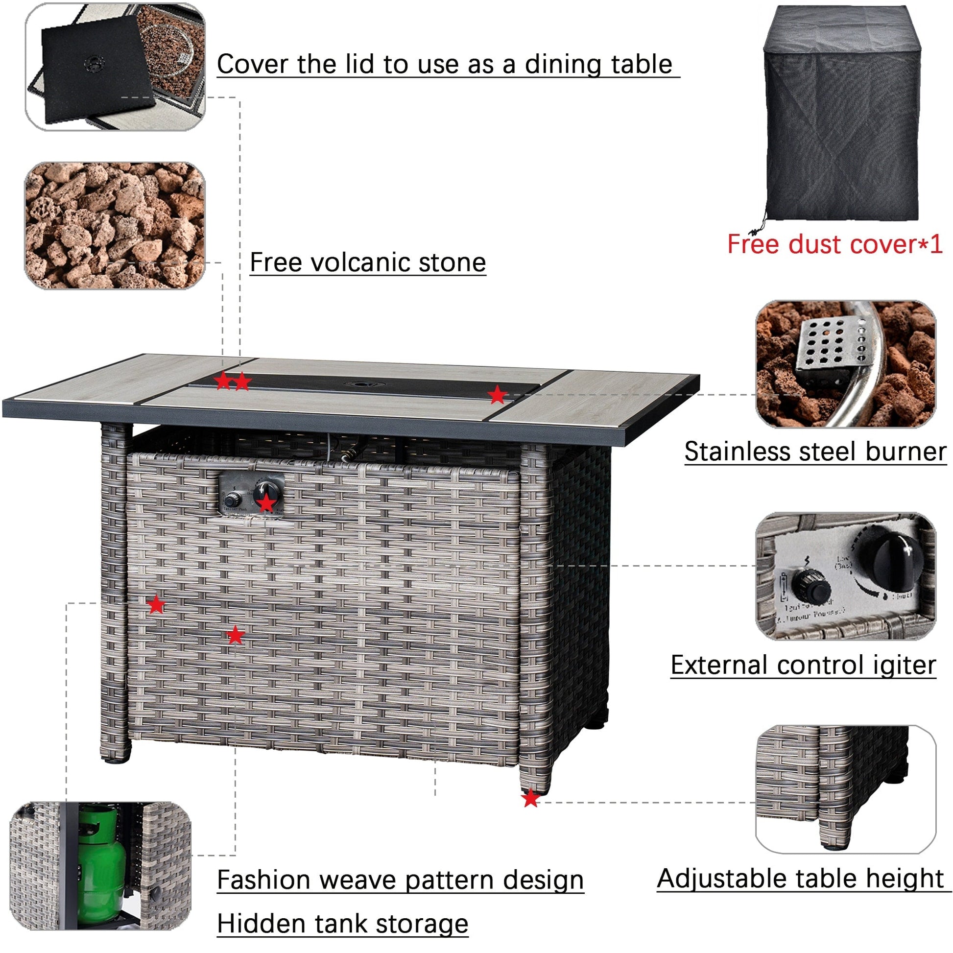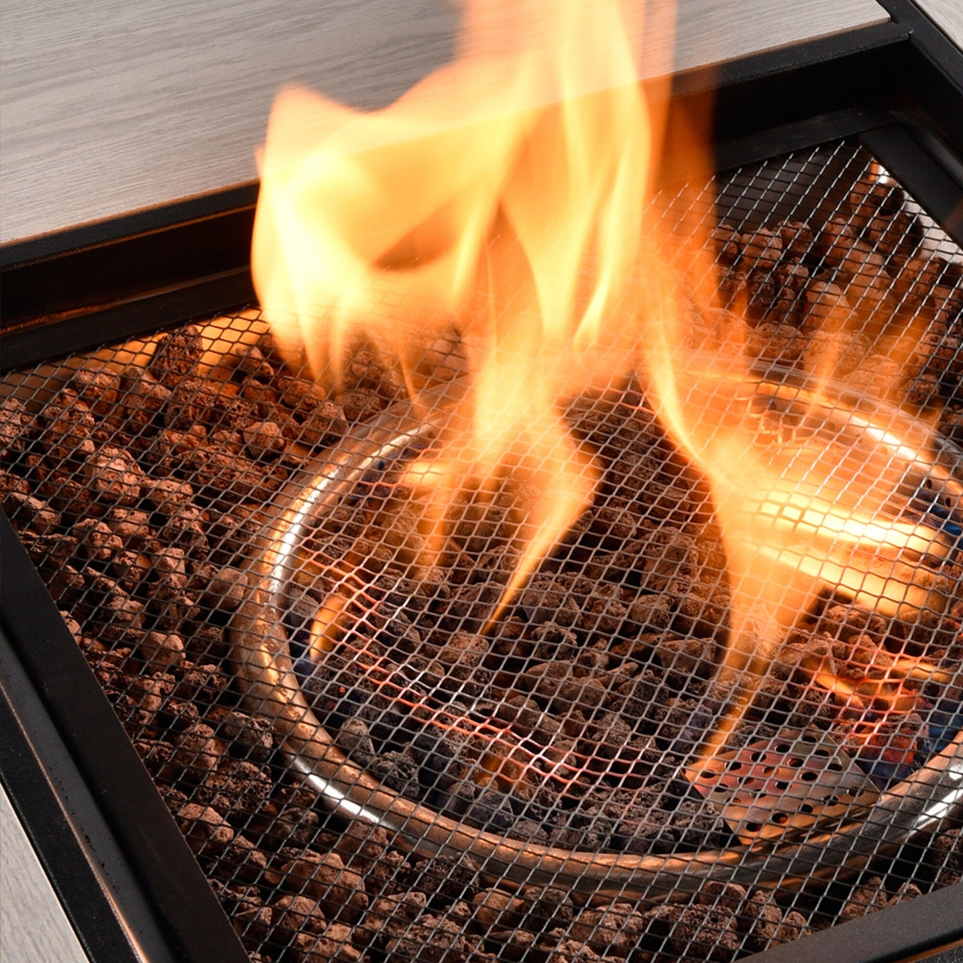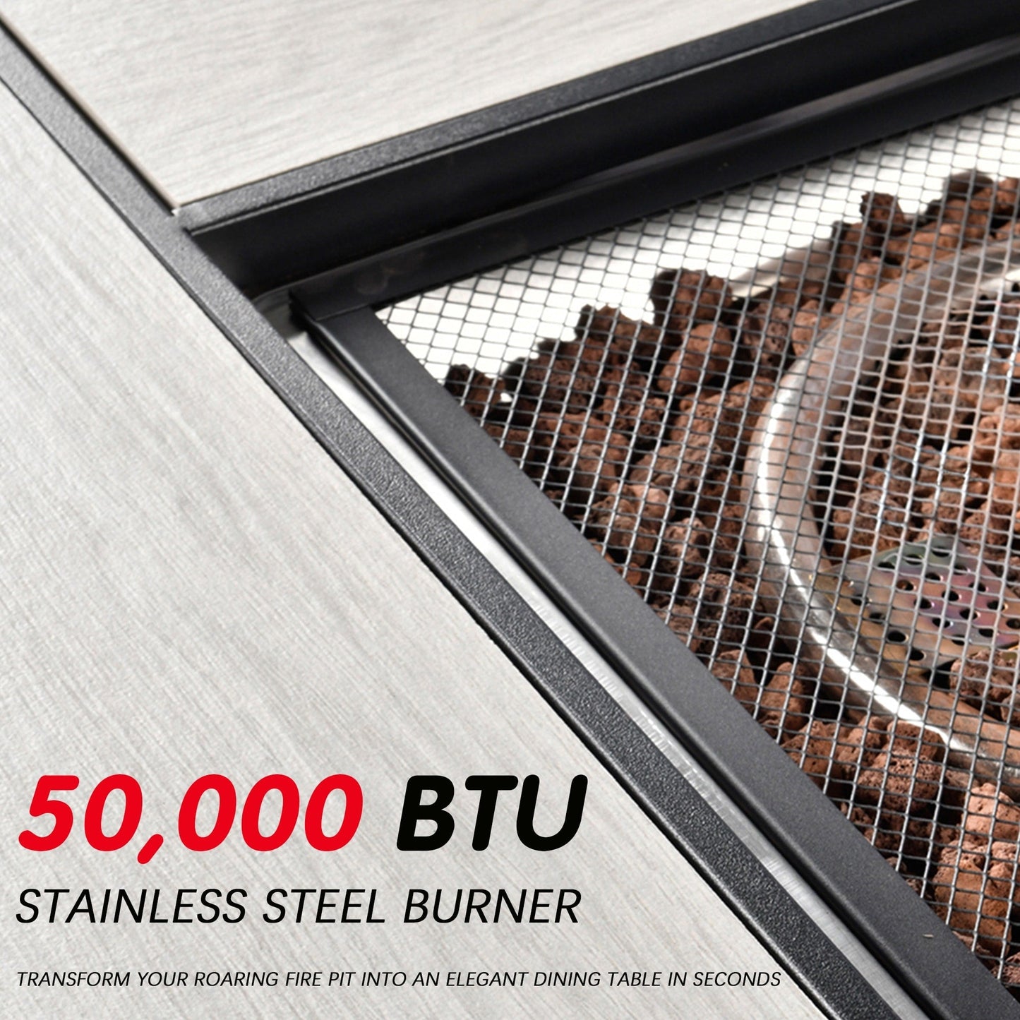 Fire Pit: Stainless steel control panel with pulse electronic ignition system easily ignites and adjusts. With a heat output of 50,000 BTU, this propane gas fire pit table provides excellent flame sparkle.