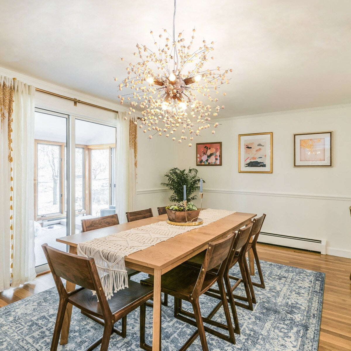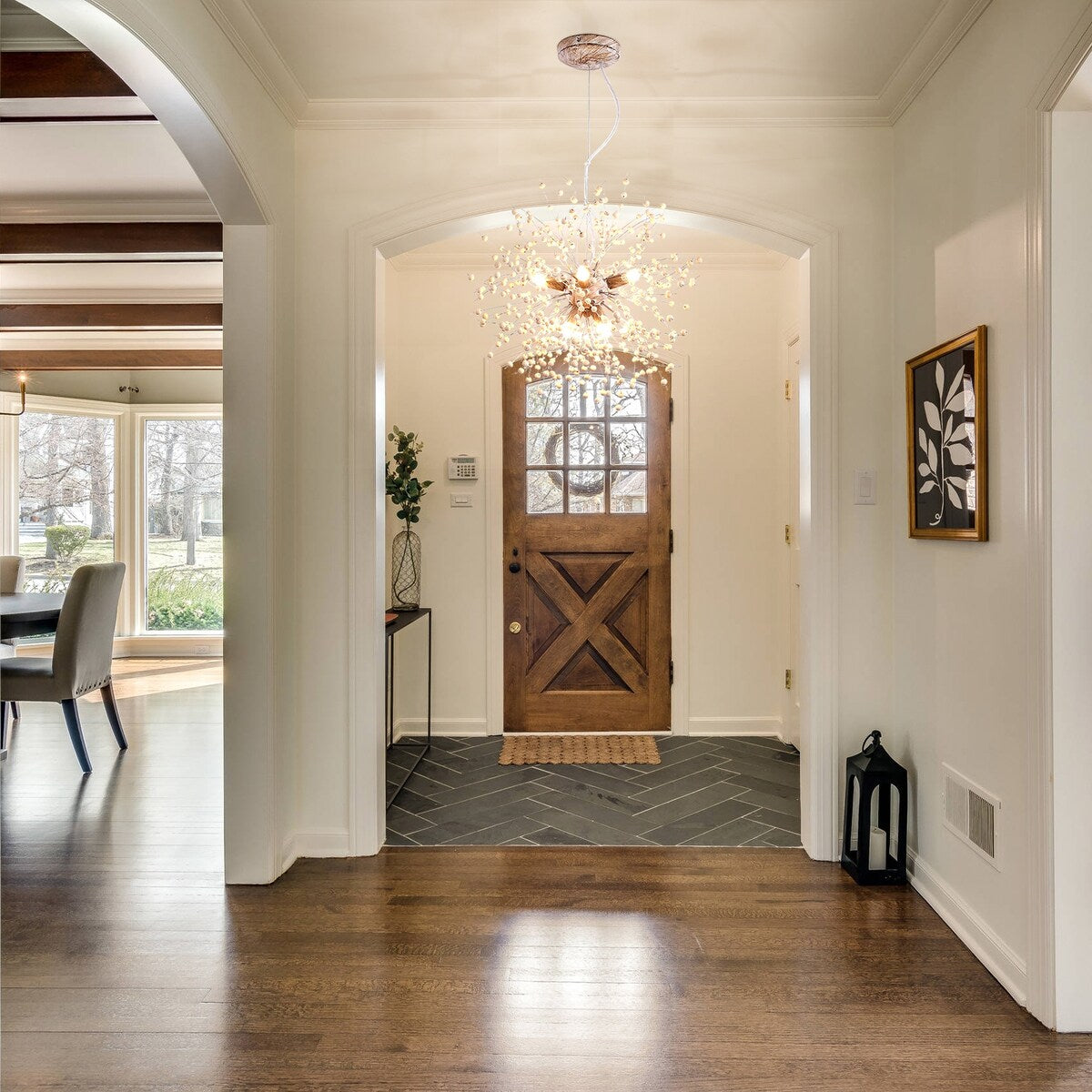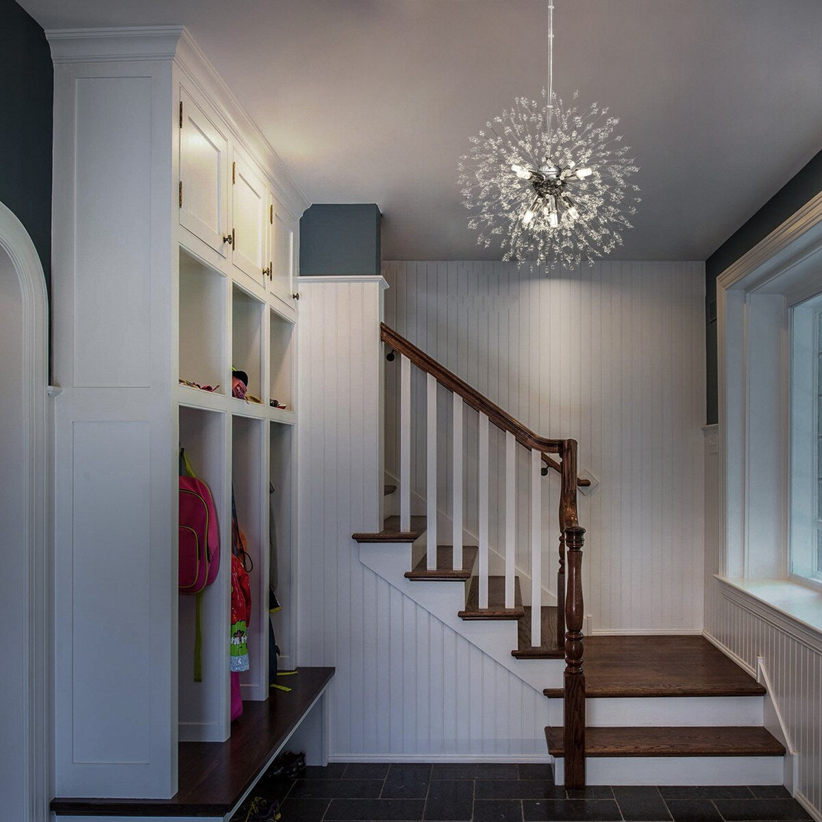 Make a statement with this resplendent Sputnik firework crystal chandelier. Sparkling crystal beads adorned with delicate wires radiate from shiny gold or chrome spheres. It features handcrafted crystal flowers that can be bent and adjusted to create your own signature look. This modern and elegant design is perfect for decorating your living room, bedroom, dining room, kitchen, bathroom, foyer, hallway, office or children's room.