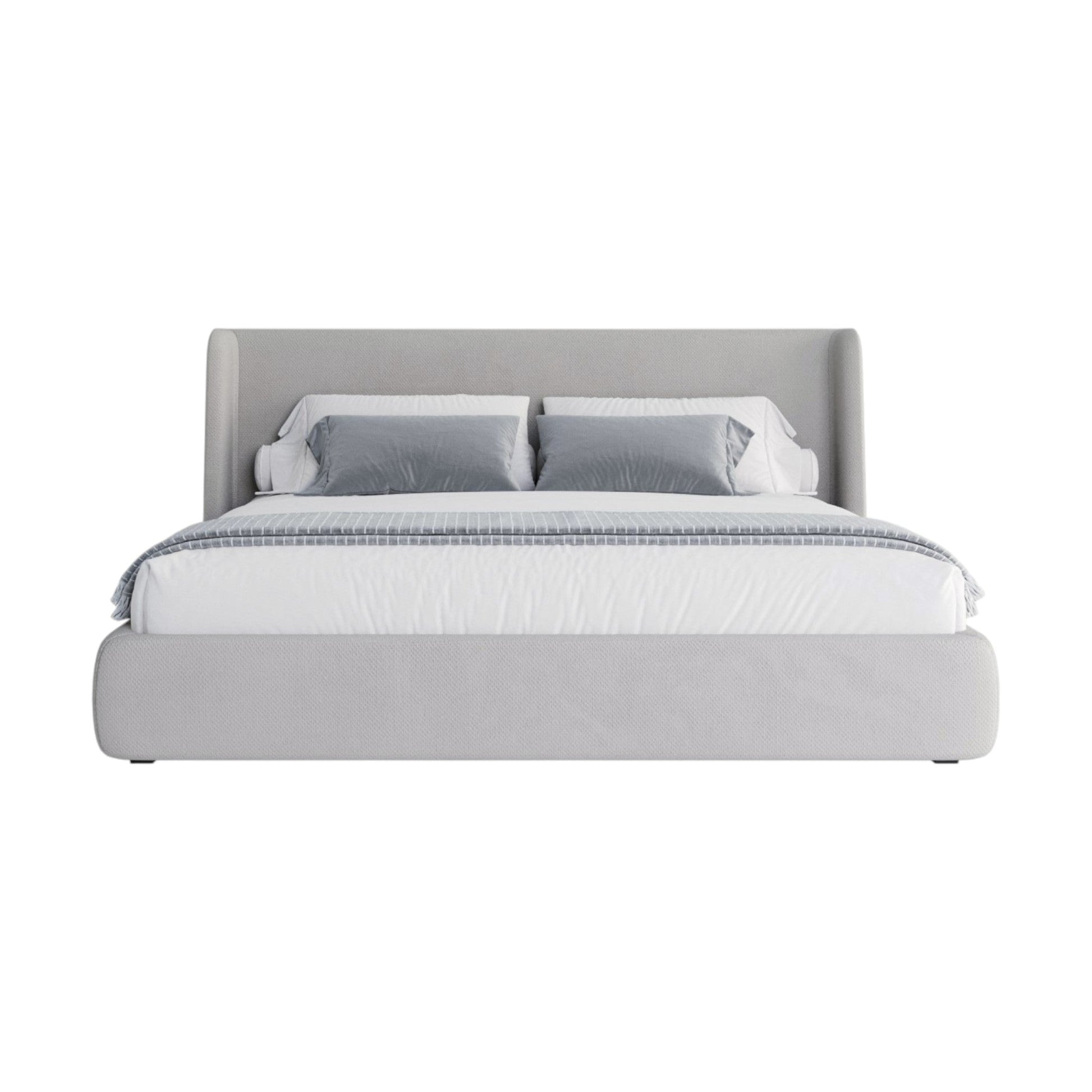 sophistiqué et contemporain tête de lit avec ailes arrondies et lisses sur les côtés recouvert de tissu gris clair structure en bois massif et manufacturé. lattes en bois avec cadre en métal entièrement rembourré |