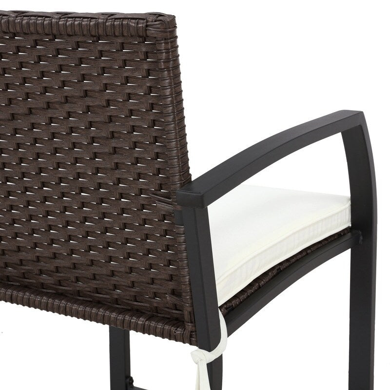 Bar chairs use a unique rattan planting process, have a durable frame, classic wicker seat and back, and not fragile polyester fabric cushion. The smooth product line design brings you a comfortable seating experience and a beautiful visual experience. Steel table with glass is designed to live outdoors. It is perfect for placing on your patio. Understated enough for any sunny ensemble, it pairs a black-finished frame with a glass top taking on a rounded square silhouette.