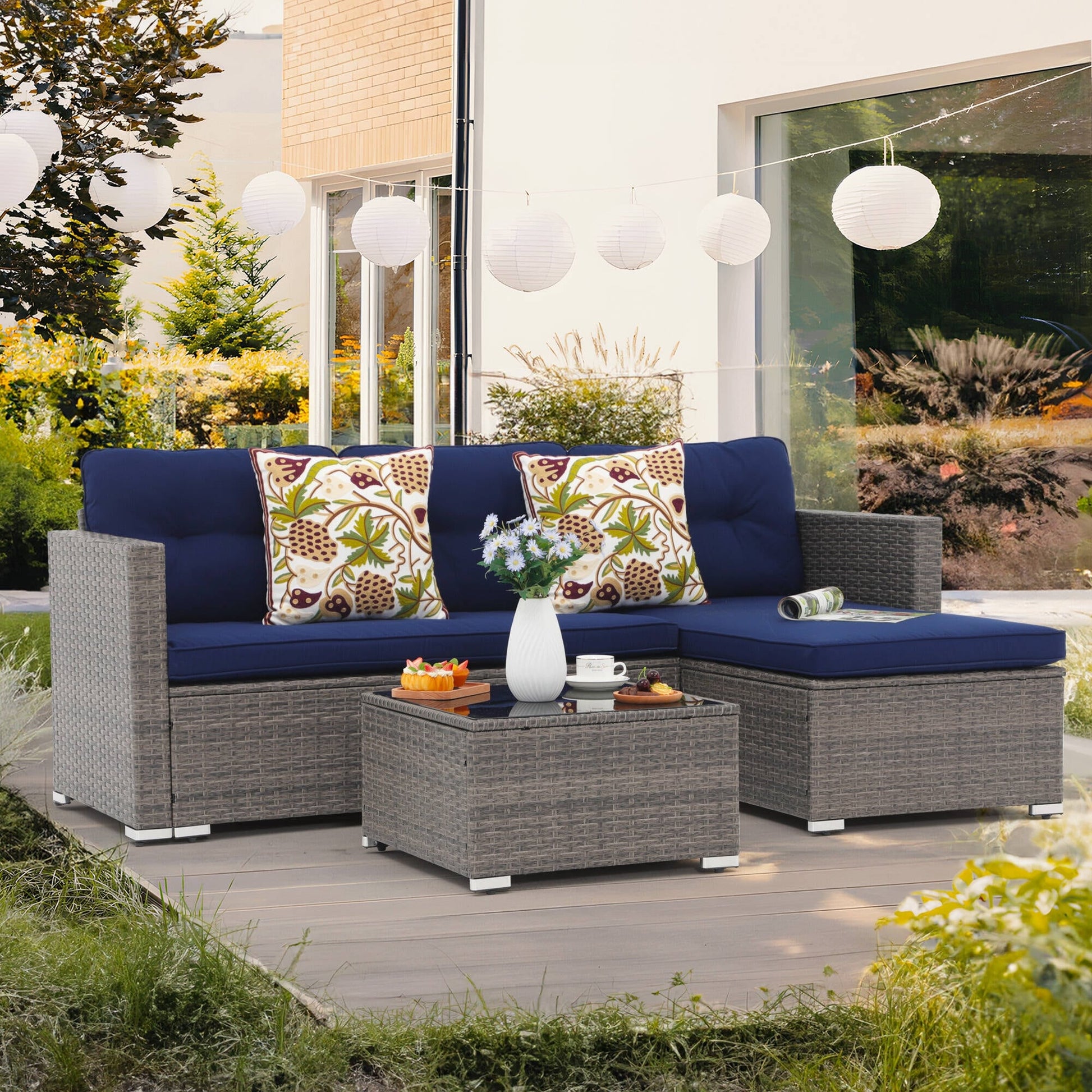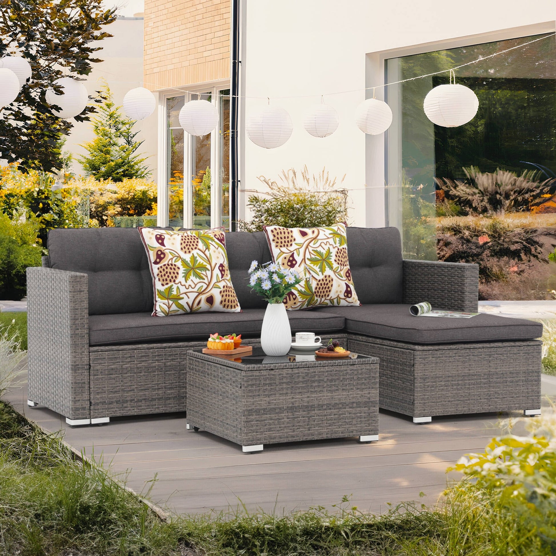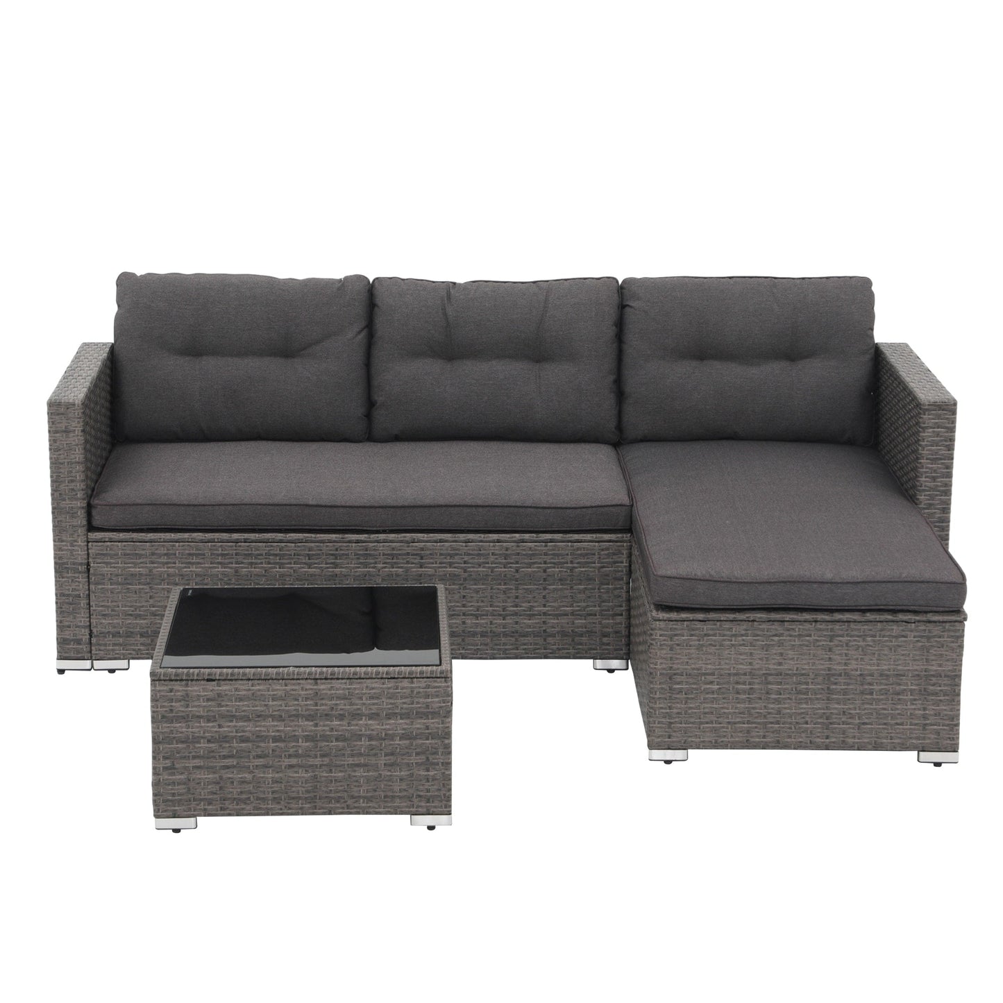 Get ready to relax in style with this 3-piece outdoor sectional set. Made with powder-coated steel frames and durable PE wicker, this set includes a loveseat, lounge seat, and side table, all finished with comfortable cushions and back pillows. Choose from multiple colors to complement your outdoor decor and enjoy lounging in your backyard, garden, or poolside.