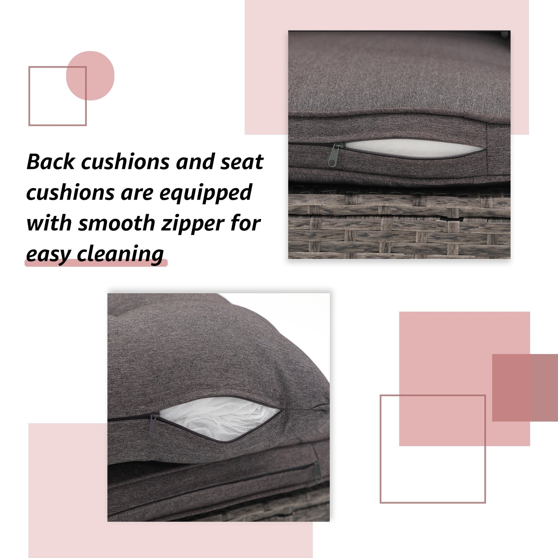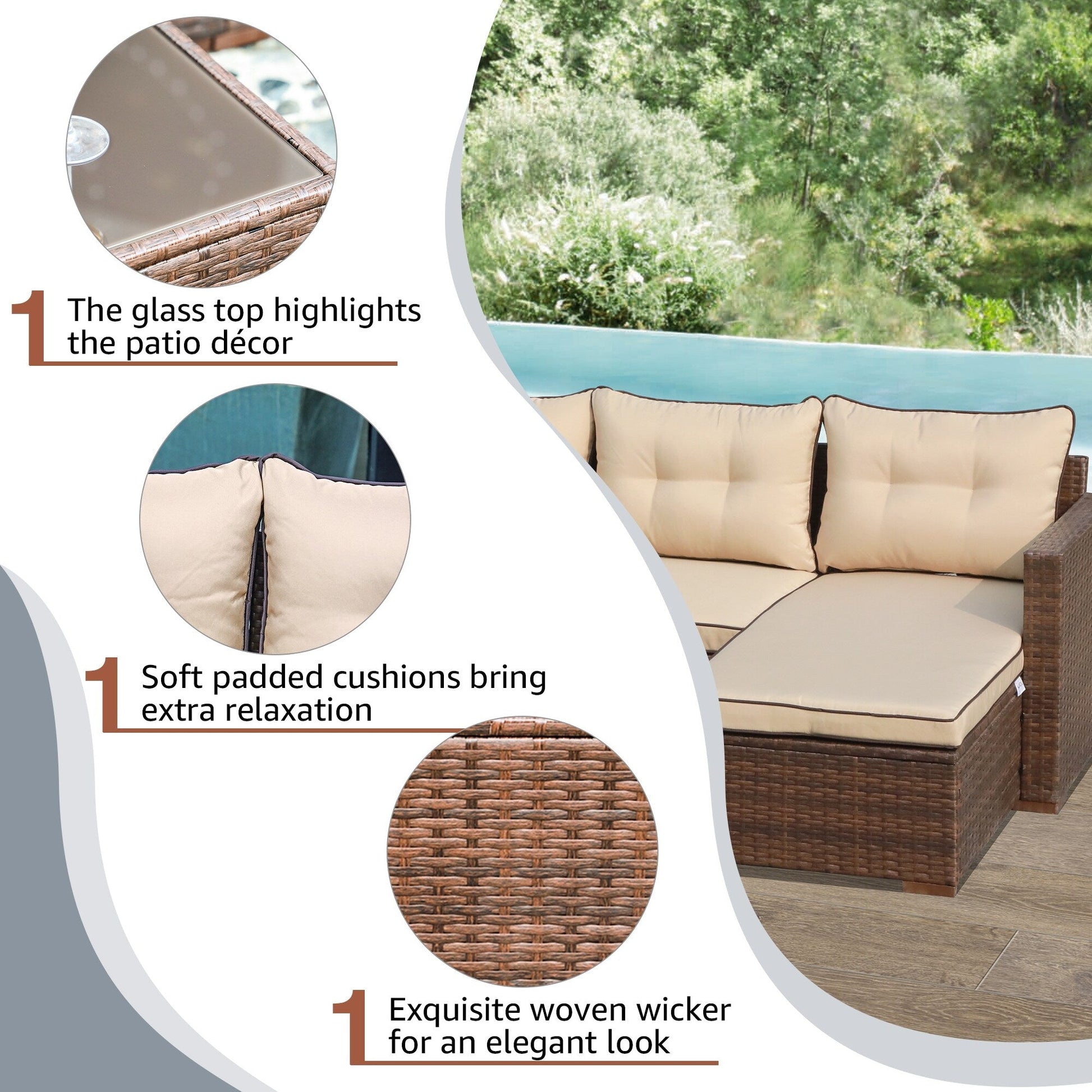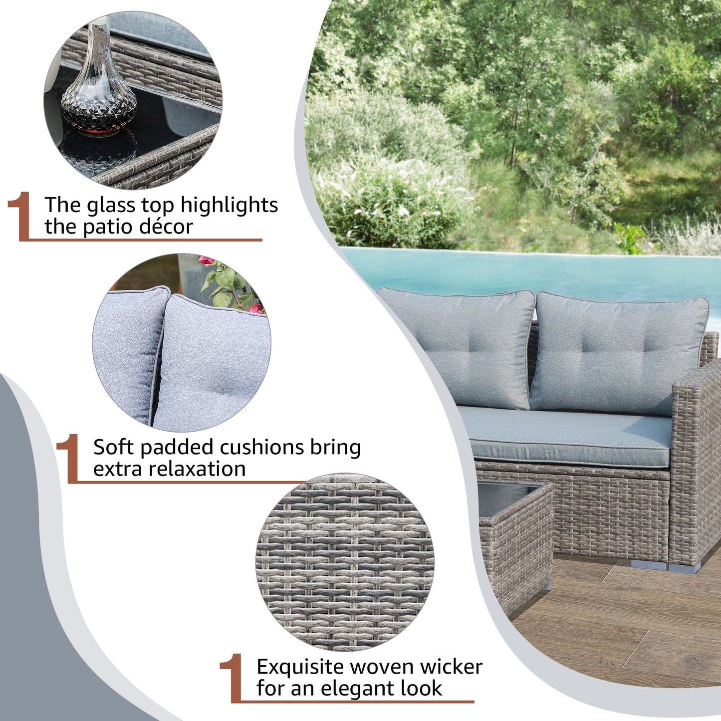 Get ready to relax in style with this 3-piece outdoor sectional set. Made with powder-coated steel frames and durable PE wicker, this set includes a loveseat, lounge seat, and side table, all finished with comfortable cushions and back pillows. Choose from multiple colors to complement your outdoor decor and enjoy lounging in your backyard, garden, or poolside.