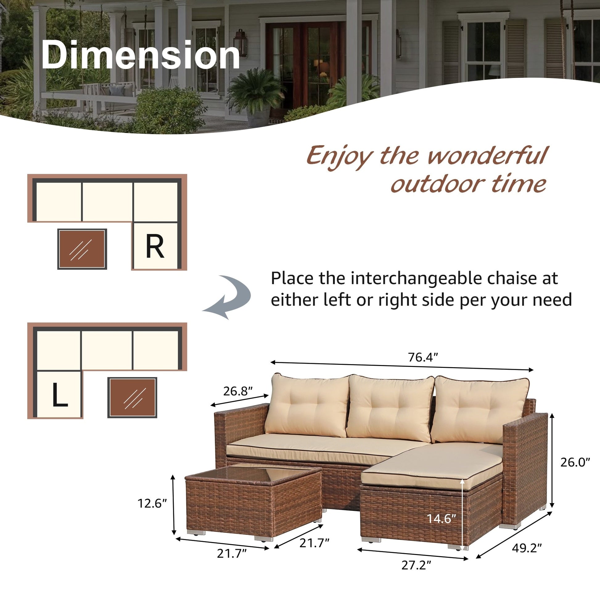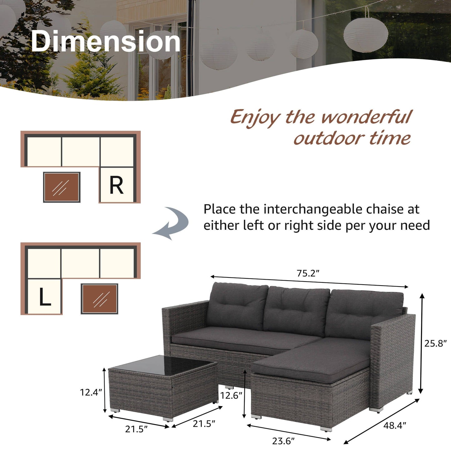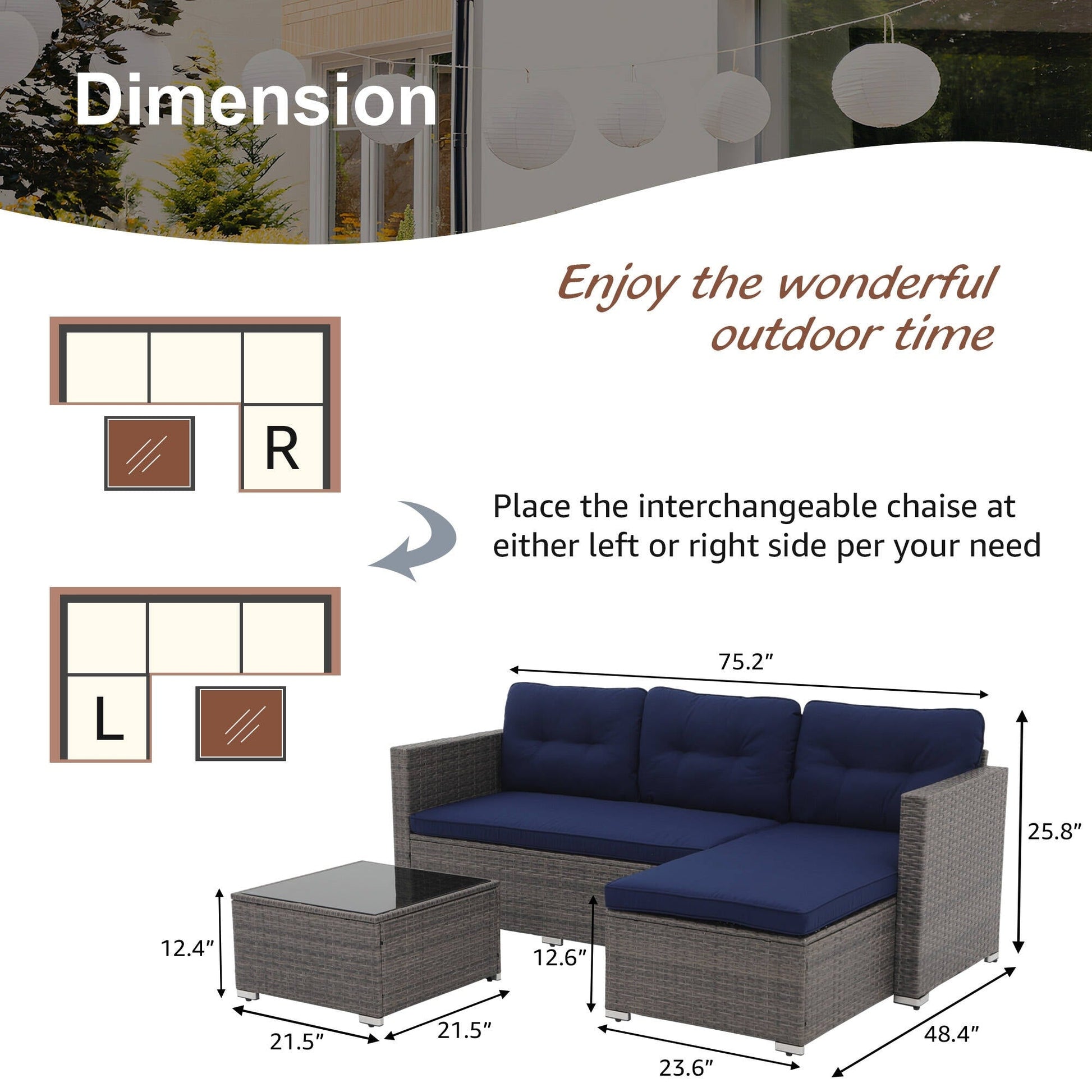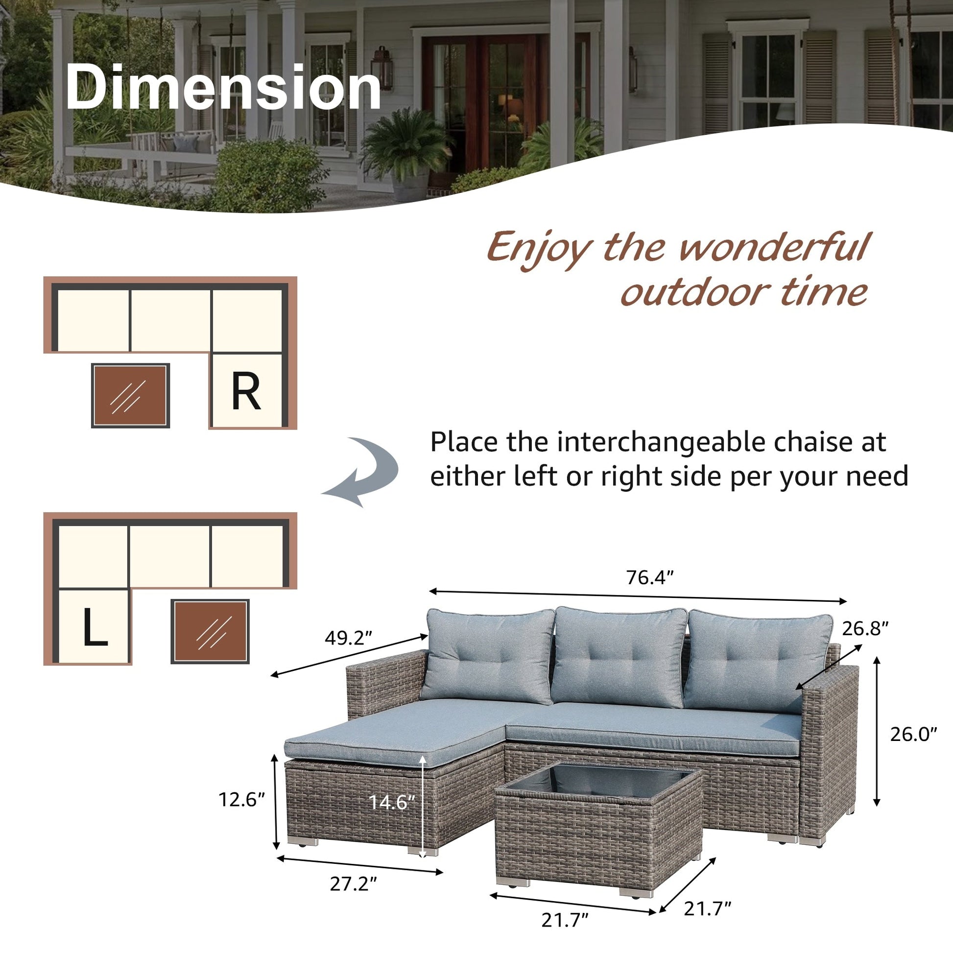 - Lounge chaise can be placed on either the left or right side for flexibility