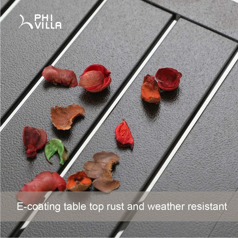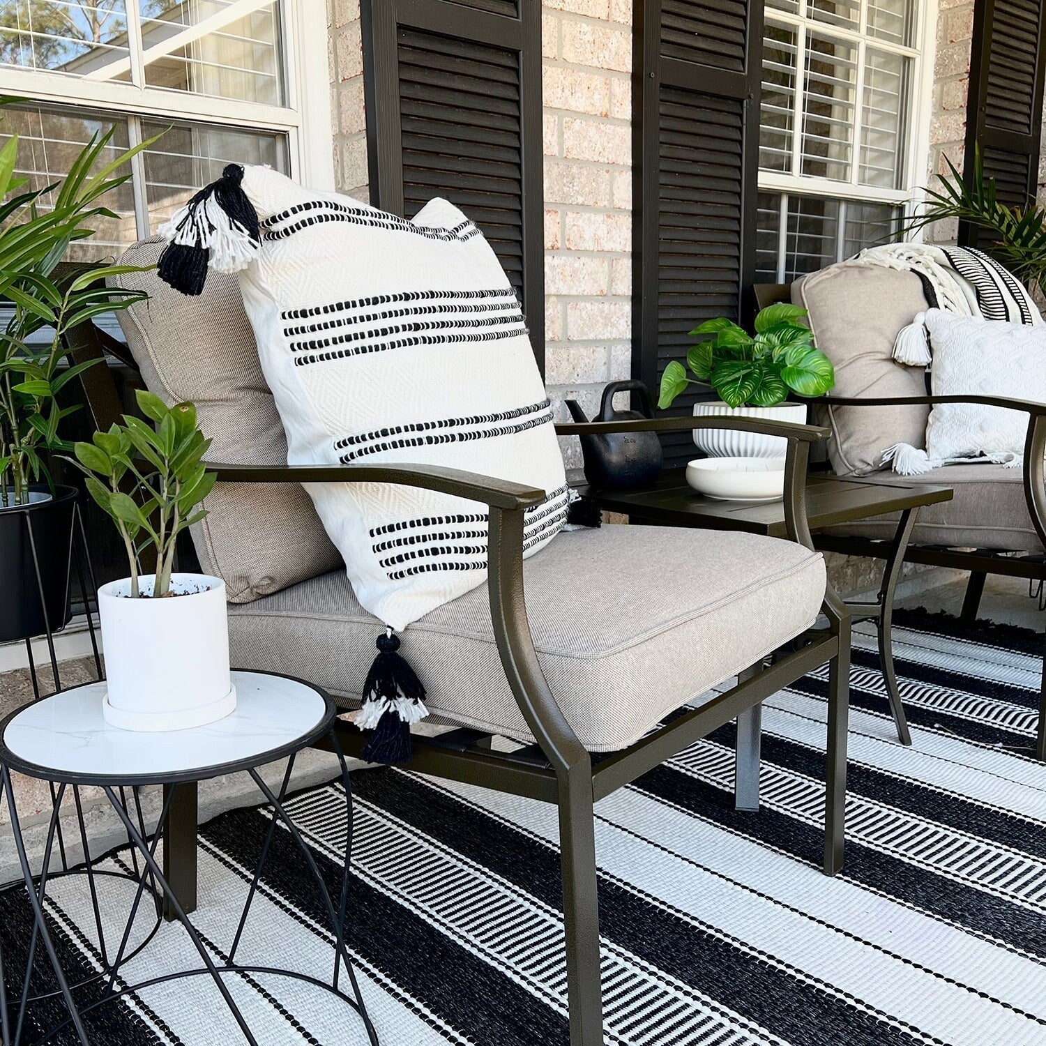 Enjoy the outdoors with your friends and family with the impeccable style and stunning durability of this 3-piece conversation sofa set. Featuring the metal ?slatted tabletop and armrests to give it a very modern feel, the durable slate black finished metal frame definitely adds a stunning look to your patio space. The plush seat and back cushions and deep angled seating ensures extreme comfort. Everything is water and rust-resistant and designed to handle inclement weather.?