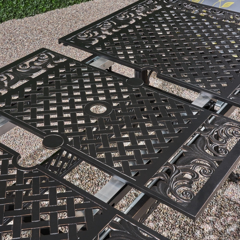 Infuse a touch of elegance into your outdoor setting with the robust and graceful design of this cast aluminum dining set. The expandable table is perfect for a growing circle of friends, ensuring that everyone gets a seat at the party. A swooping lattice motif highlighted with curved arms and a powder coated copper finish is suited for all sorts of weather for years of attractive use. ???