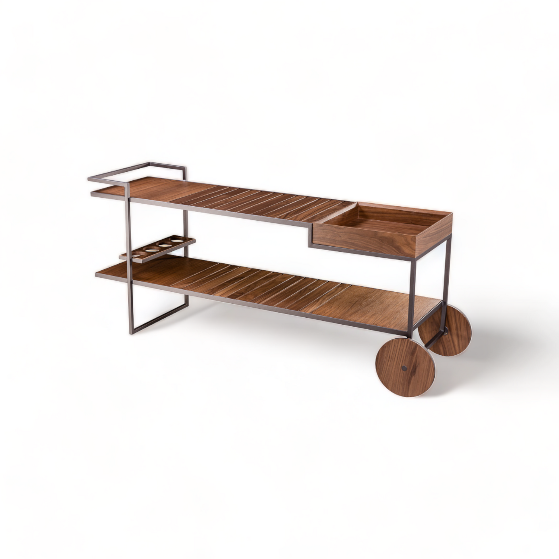 [description] La console bar Pier est un meuble moderne et polyvalent pour votre salon et votre entrée. Ce charmant chariot bar peut servir de table d'appoint pour vos cocktails, dans votre salon ou comme console dans votre entrée. Il est doté de deux roulettes en noyer, d'une structure en métal peint Urano mat et de plateaux en noyer. Son design élégant, sa grande taille et sa fonctionnalité le rendent unique et remarquable.