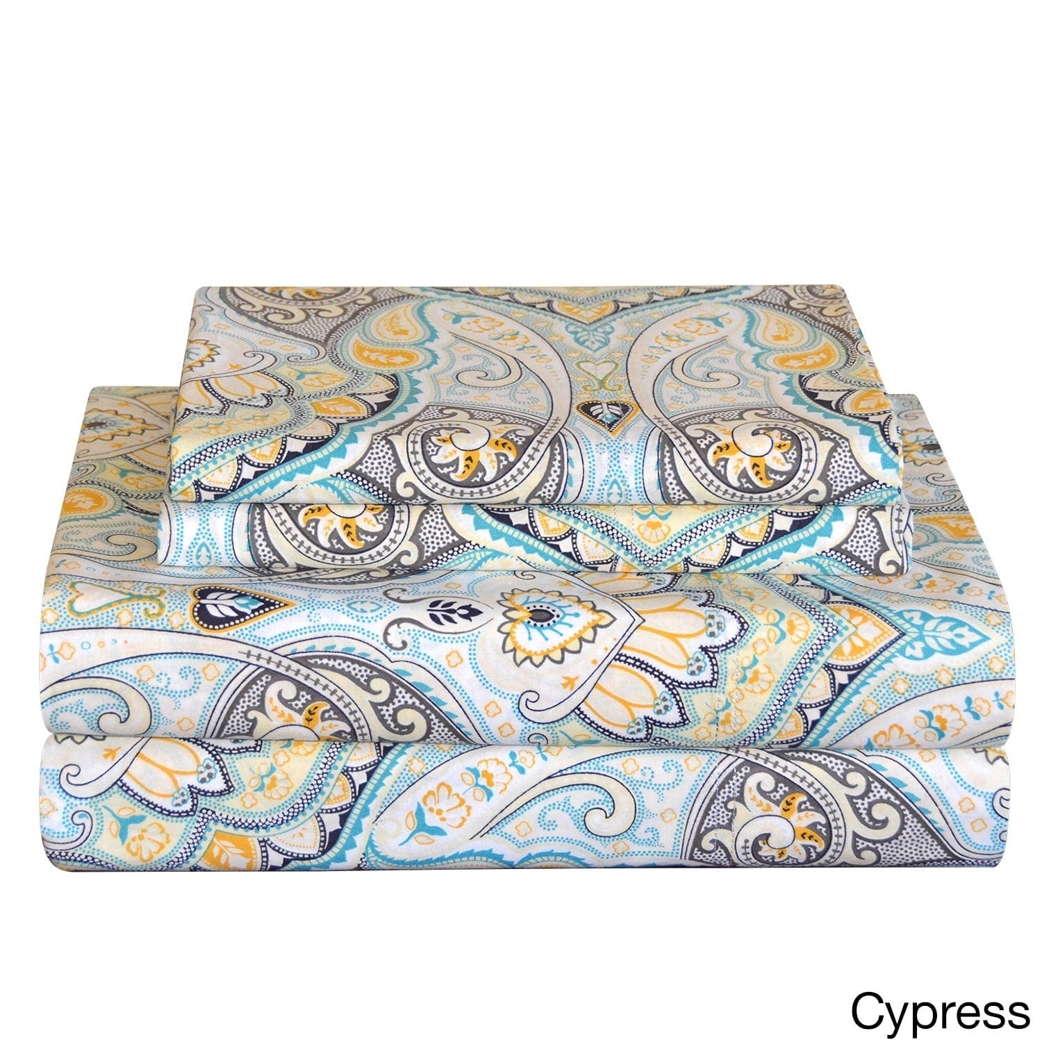 Make your bed elegant down to the sheets with this bold paisley-printed percale sheet set. Crafted from machine-washable cotton cloth with a naturally cooling texture, this set includes a deep-pocket fitted sheet with all-around elastic to ensure a tight fit on any mattress, and the set comes in your choice of color schemes for a perfect match to your current bedding. This easy care and breathable fabric becomes softer and cooler after every wash.