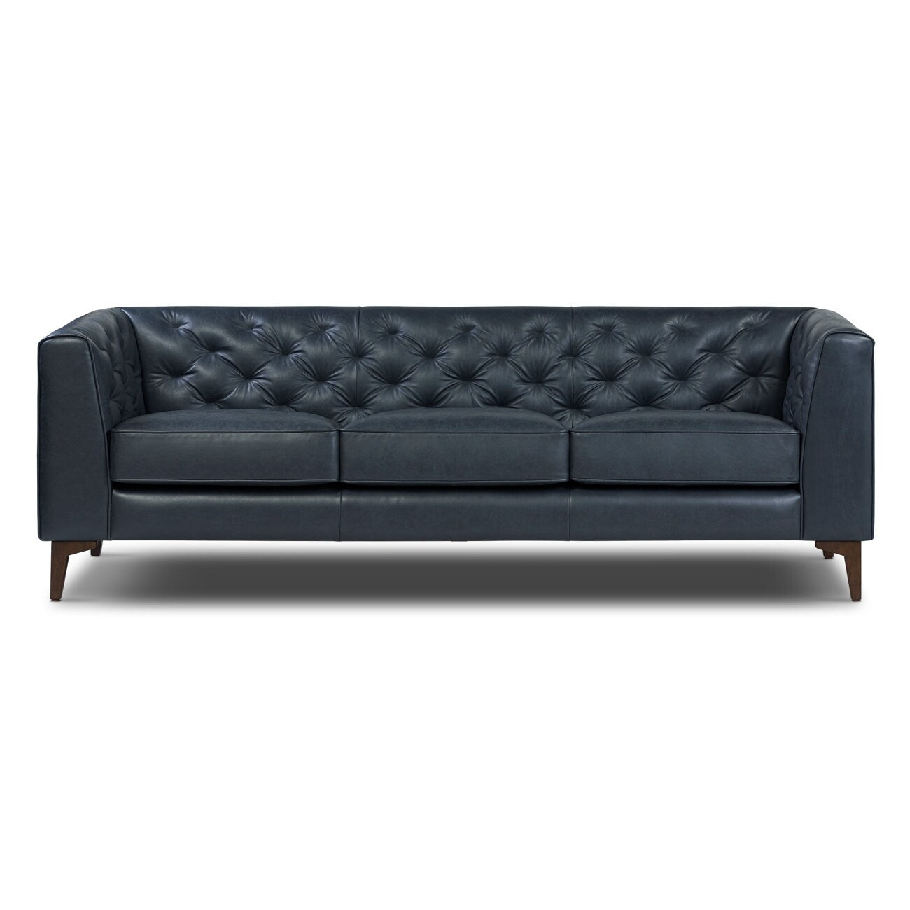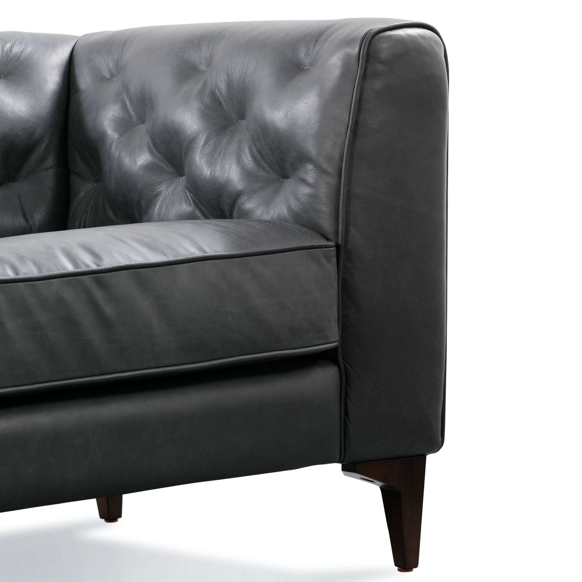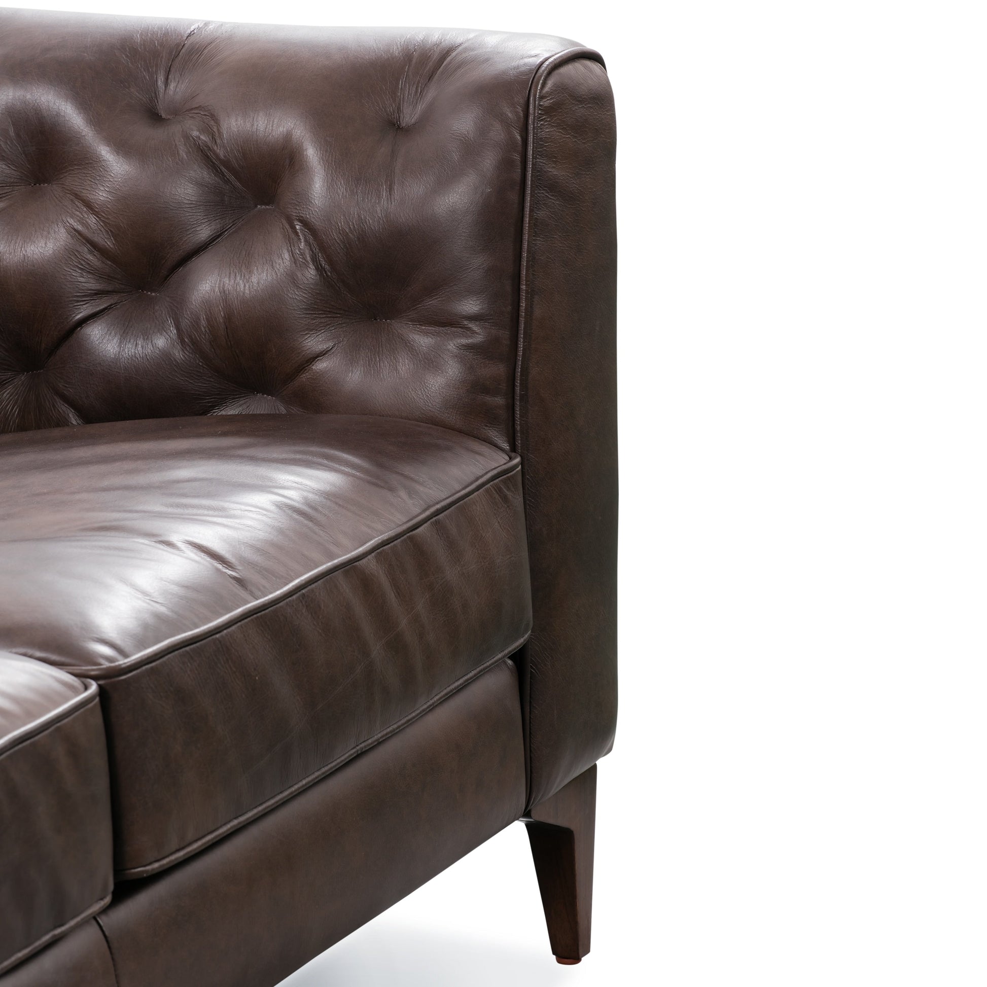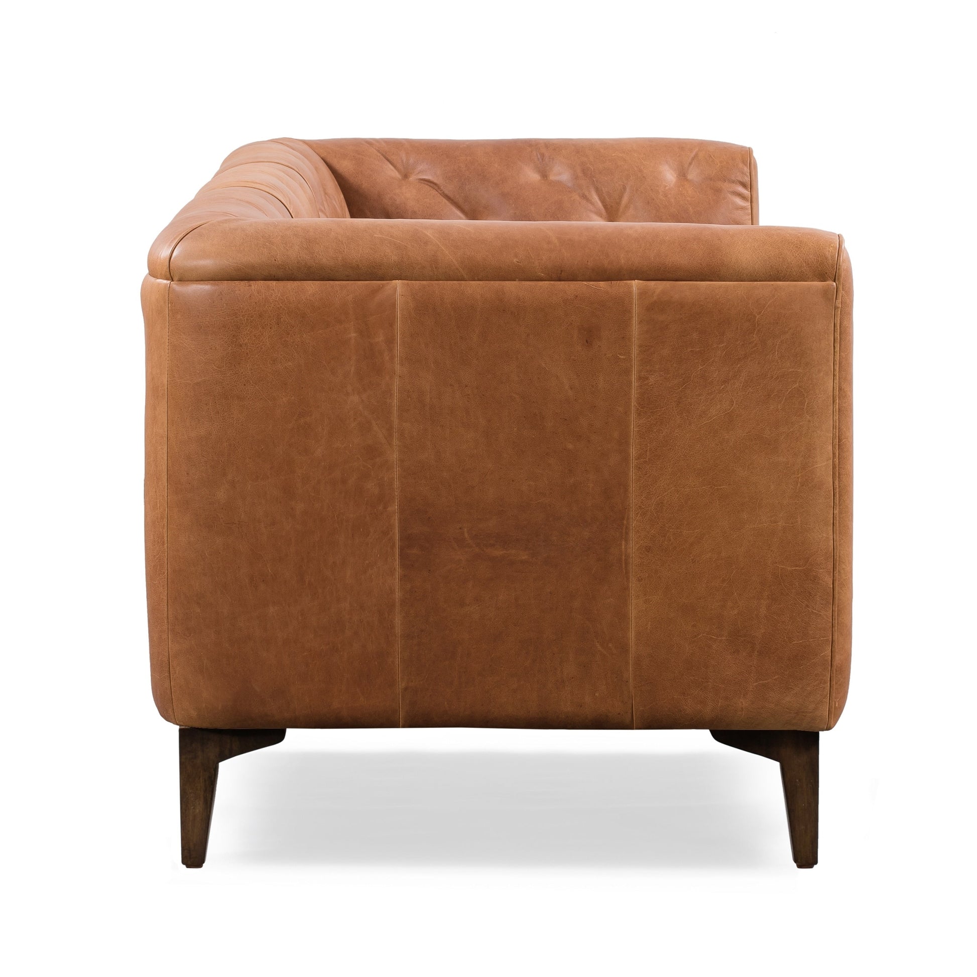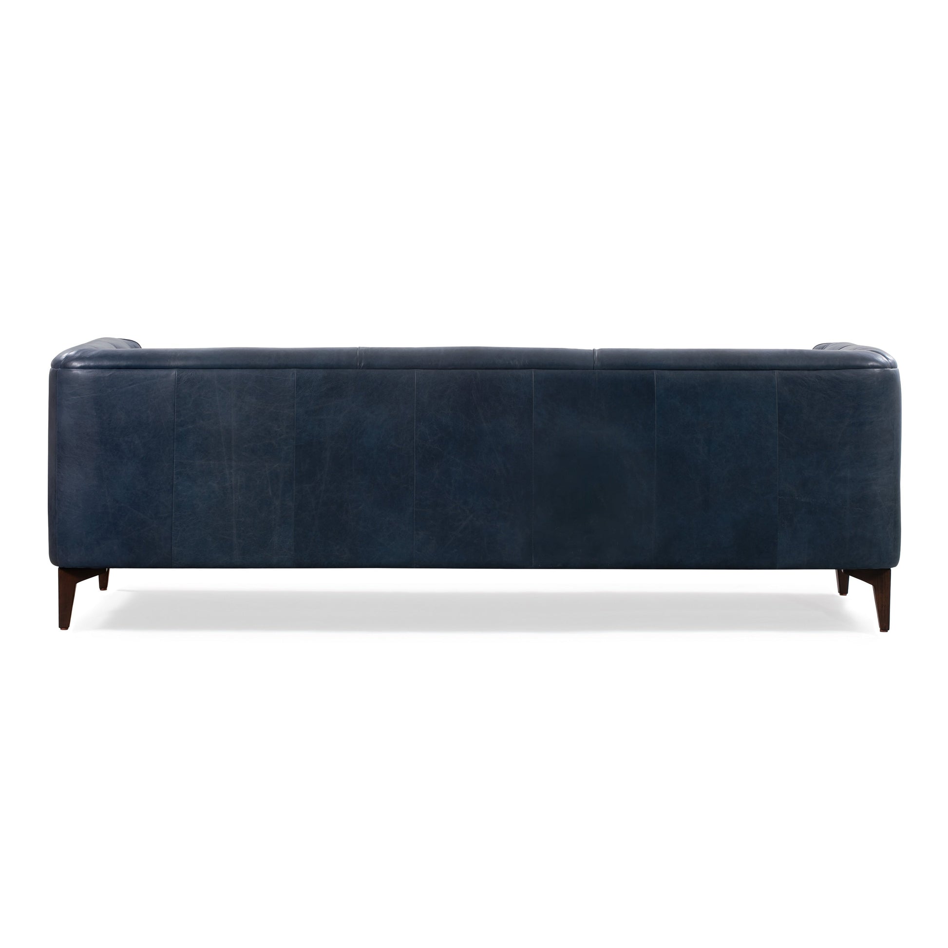Crafted with a hat tip to vintage silhouettes, the Essex sofa brings stately style to your living room or den with rich full-grain pure-aniline (cognac tan, cocoa brown) or semi-aniline (all other colors) Italian tanned leather upholstery. The pure-aniline dyed Italian tanned leather upholstery emphasizes the natural beauty of each hide offering a unique look to each piece. With minimal processing, aniline hides proudly display the natural hallmarks of genuine leather such as fat wrinkles, growth marks, healed scars, insect bites and scratches. Similar to marble or a beautiful piece of timber, each leather will vary in color tone and pattern and will change, mark and stain, softening into its rich patina with age. A diamond tufted back drops to smooth and supremely comfortable cushions outfitted with duck feather down interiors for a seating experience that lives up to this sofaâs refined look. Tapered solid wood legs with mahogany finish add a tailored touch to this modern-day classic.