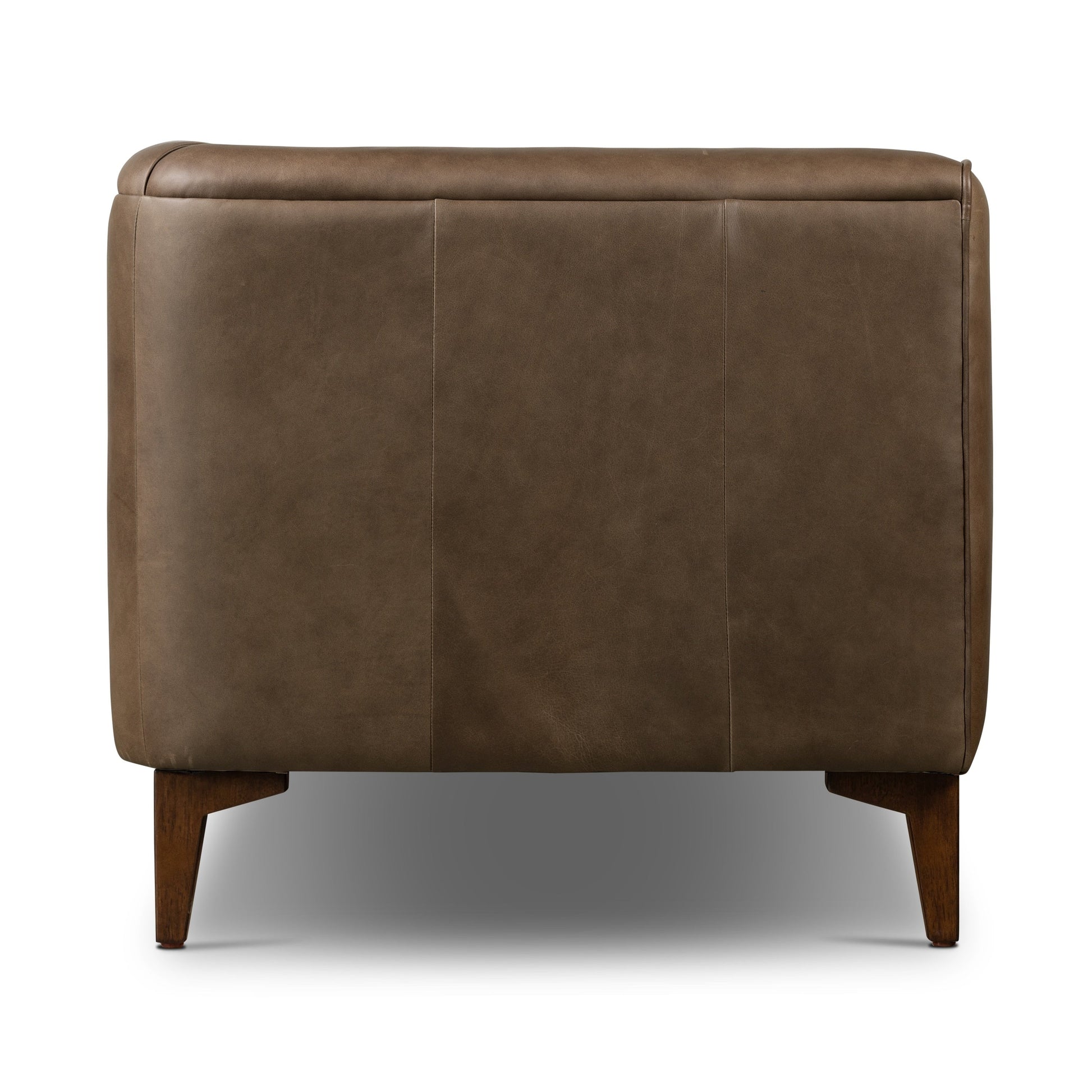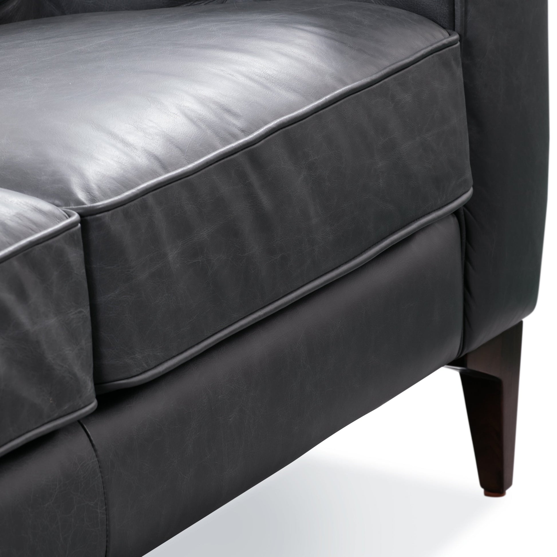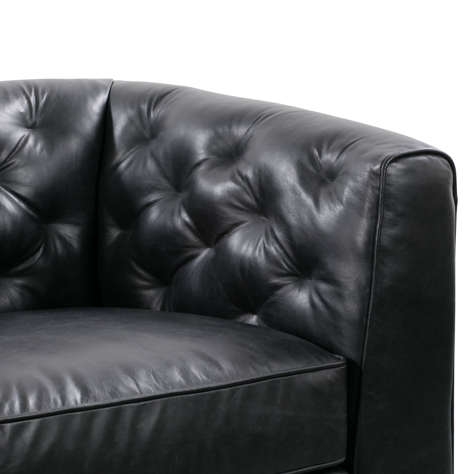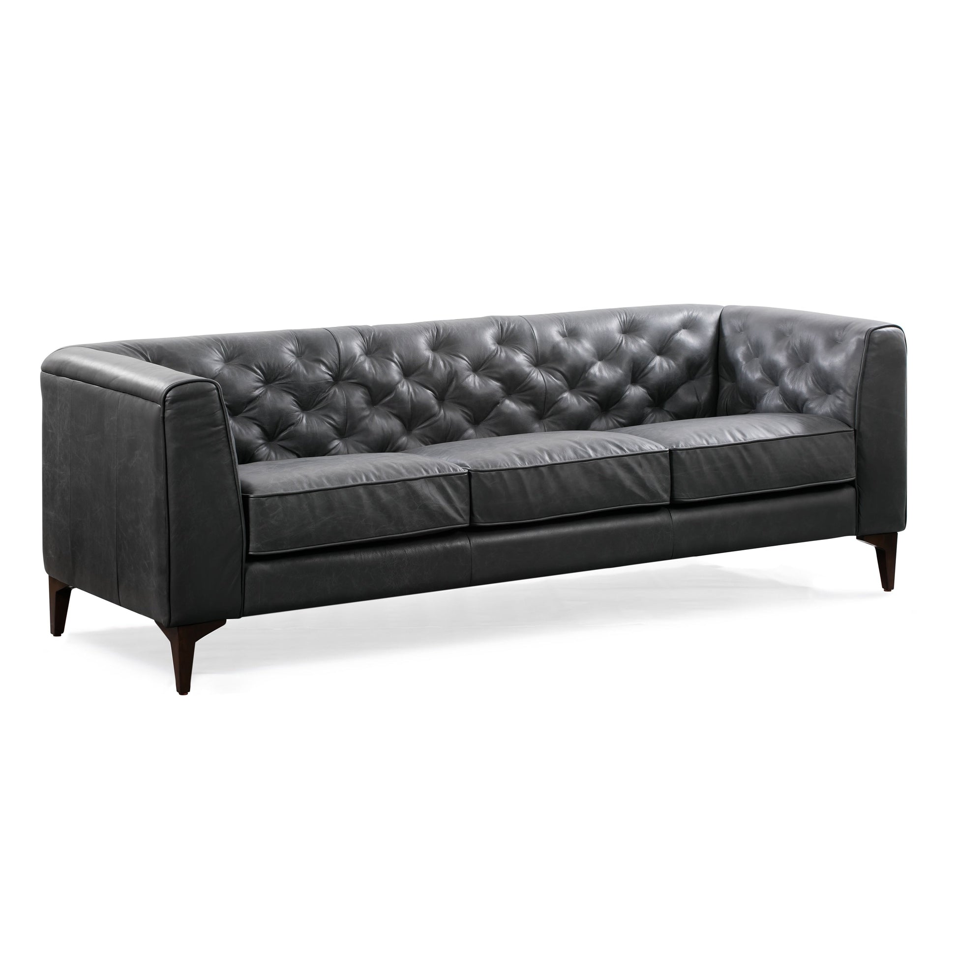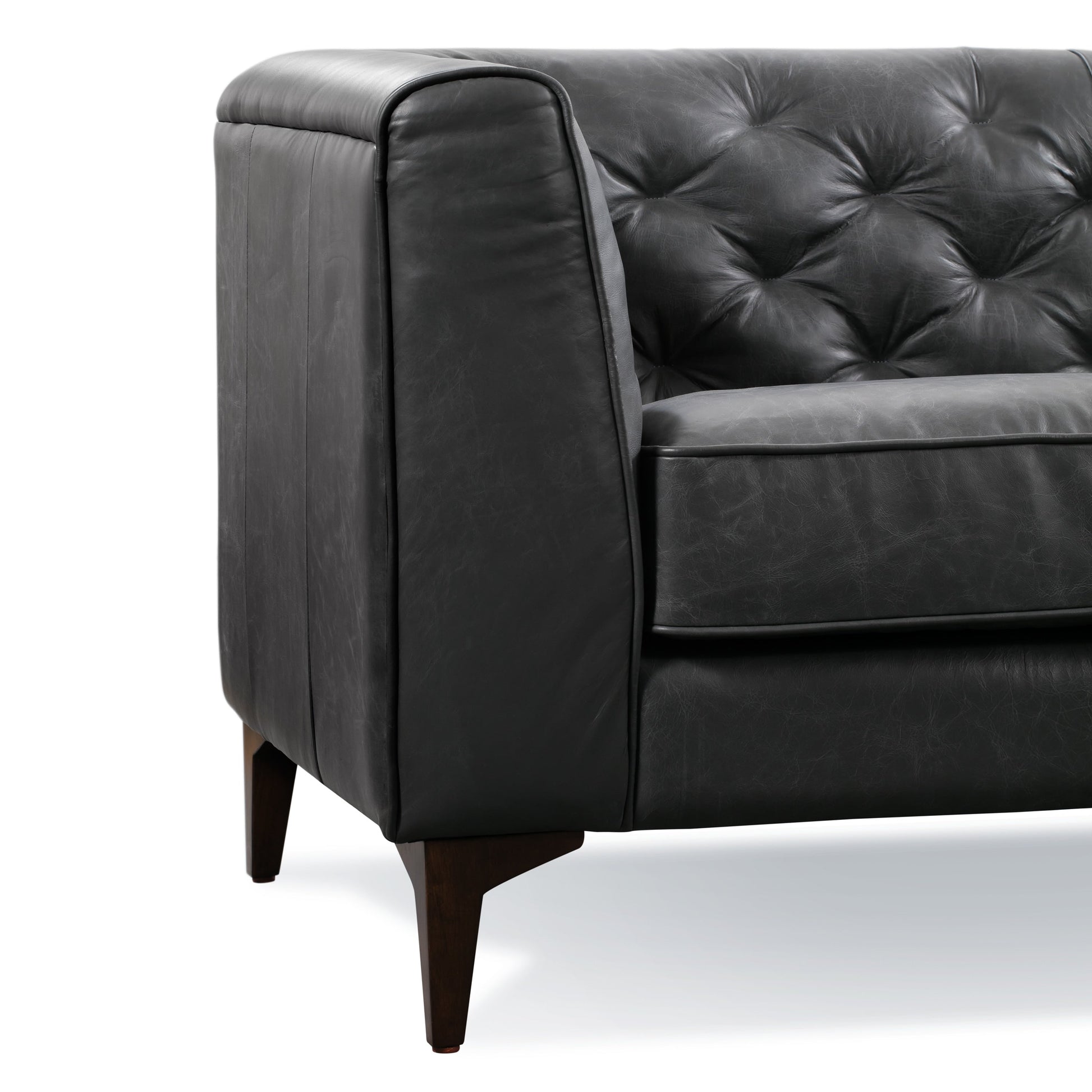 Crafted with a hat tip to vintage silhouettes, the Essex sofa brings stately style to your living room or den with rich full-grain pure-aniline (cognac tan, cocoa brown) or semi-aniline (all other colors) Italian tanned leather upholstery. The pure-aniline dyed Italian tanned leather upholstery emphasizes the natural beauty of each hide offering a unique look to each piece. With minimal processing, aniline hides proudly display the natural hallmarks of genuine leather such as fat wrinkles, growth marks, healed scars, insect bites and scratches. Similar to marble or a beautiful piece of timber, each leather will vary in color tone and pattern and will change, mark and stain, softening into its rich patina with age. A diamond tufted back drops to smooth and supremely comfortable cushions outfitted with duck feather down interiors for a seating experience that lives up to this sofaâs refined look. Tapered solid wood legs with mahogany finish add a tailored touch to this modern-day classic.
