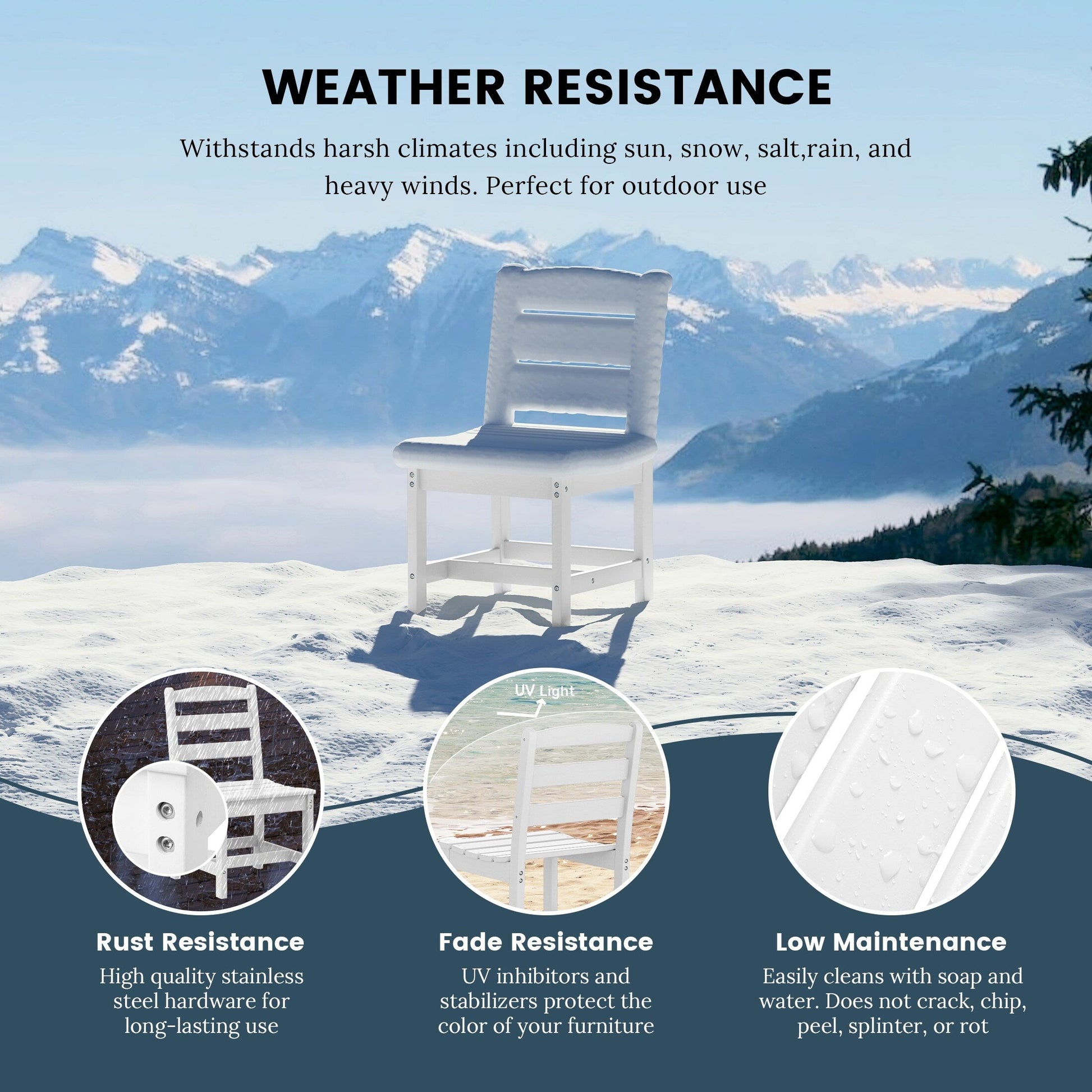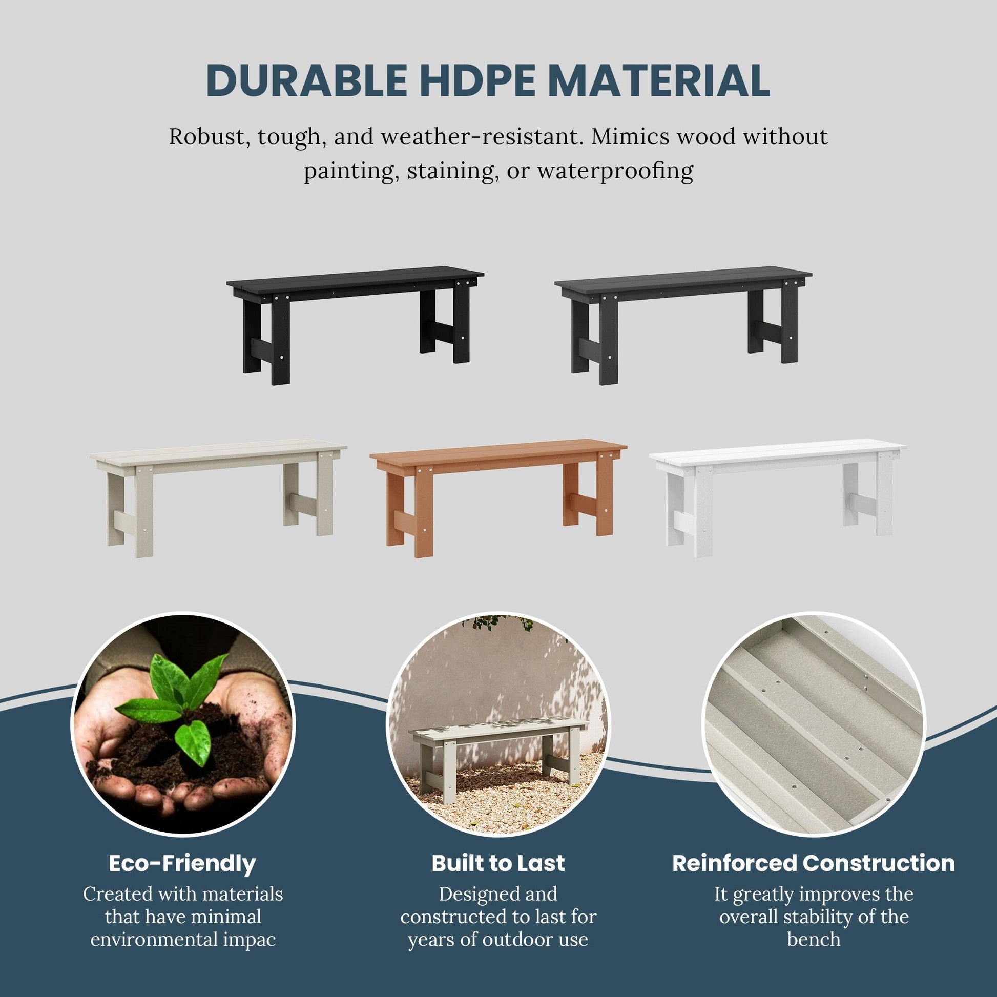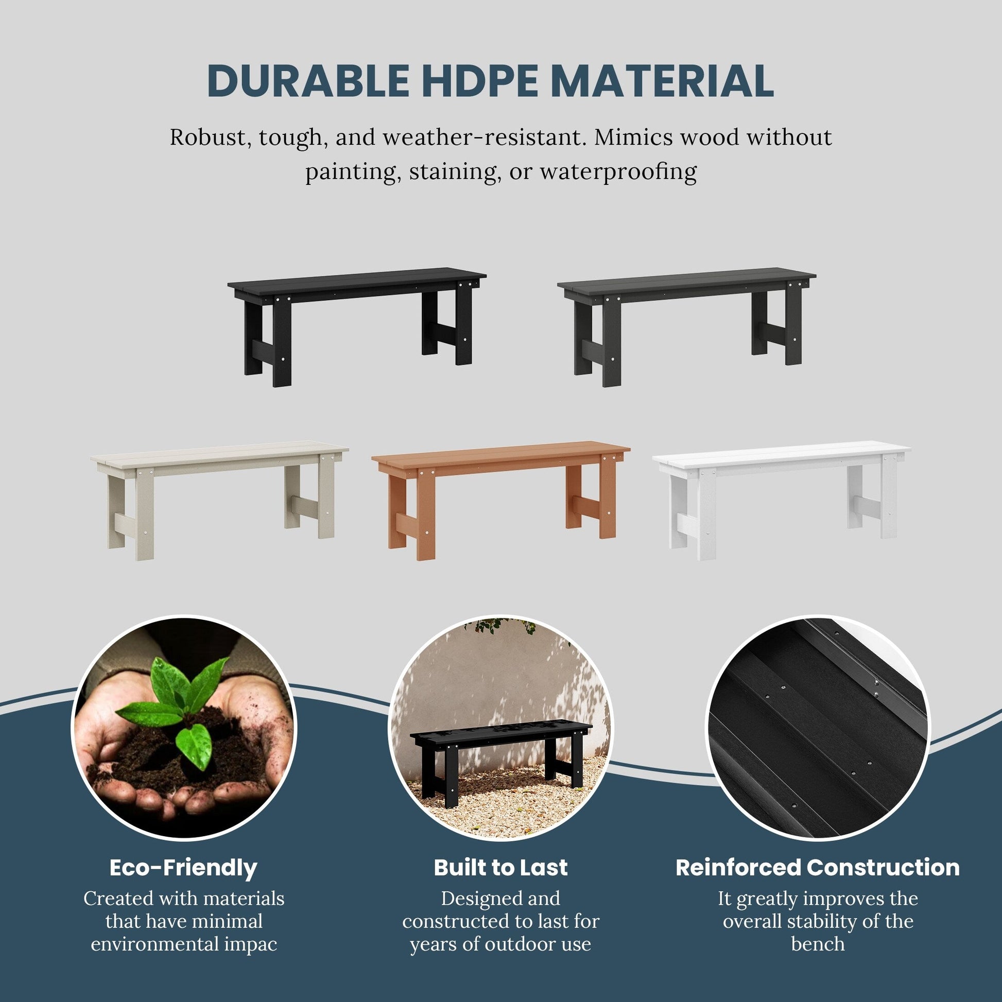 Share a relaxing meal with friends and family on your patio with this charming 6-piece dining set. Crafted from durable all-weather HDPE material, it is fade—and UV-resistant, making it the ideal choice for outdoor use. Enjoy warm, sunny days without the sun getting in the way, thanks to the table's built-in 1.9' diameter umbrella hole, which is perfect for adding an existing umbrella. Not only is the set built to be appealing but also durable with the table-top reinforced aluminum metal frame that increases the overall stability and durability and the bench reinforced bottom that is also equipped with stainless steel plates along the skirt to help reduce warping, the chairs contoured seat and arched backrest provide optimal comfort. Create memories with your family this season with this set.
