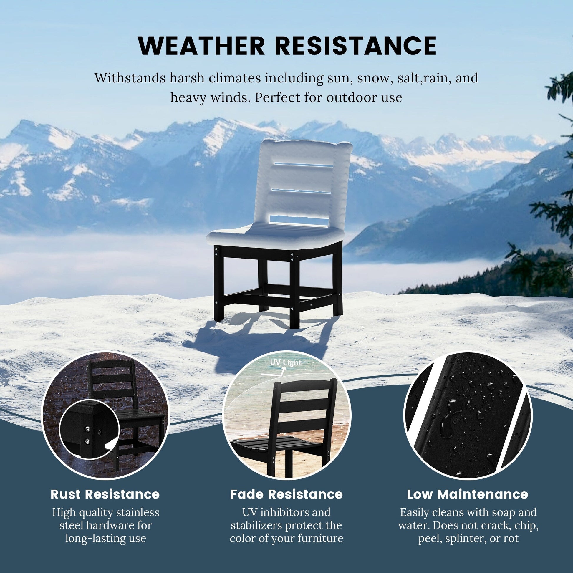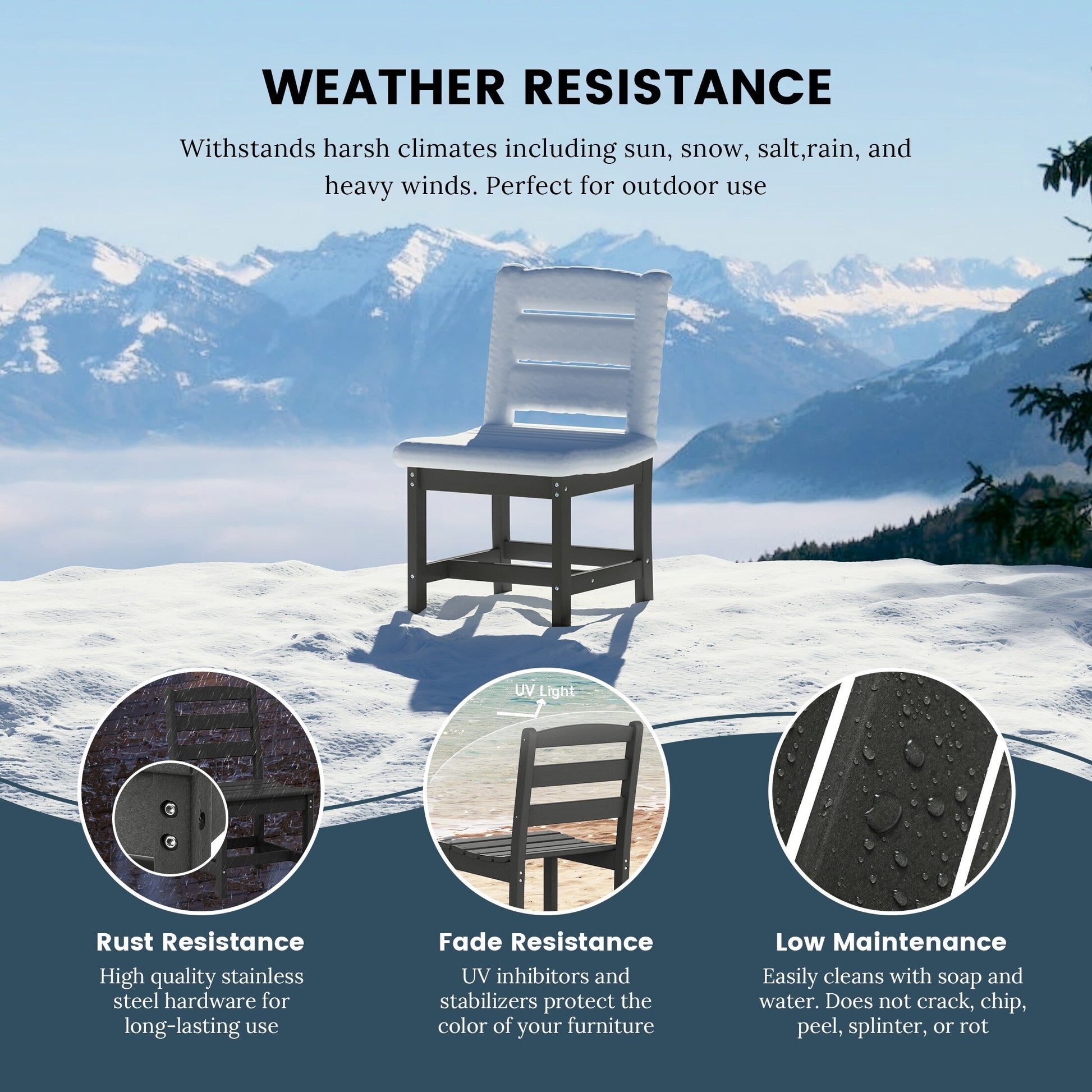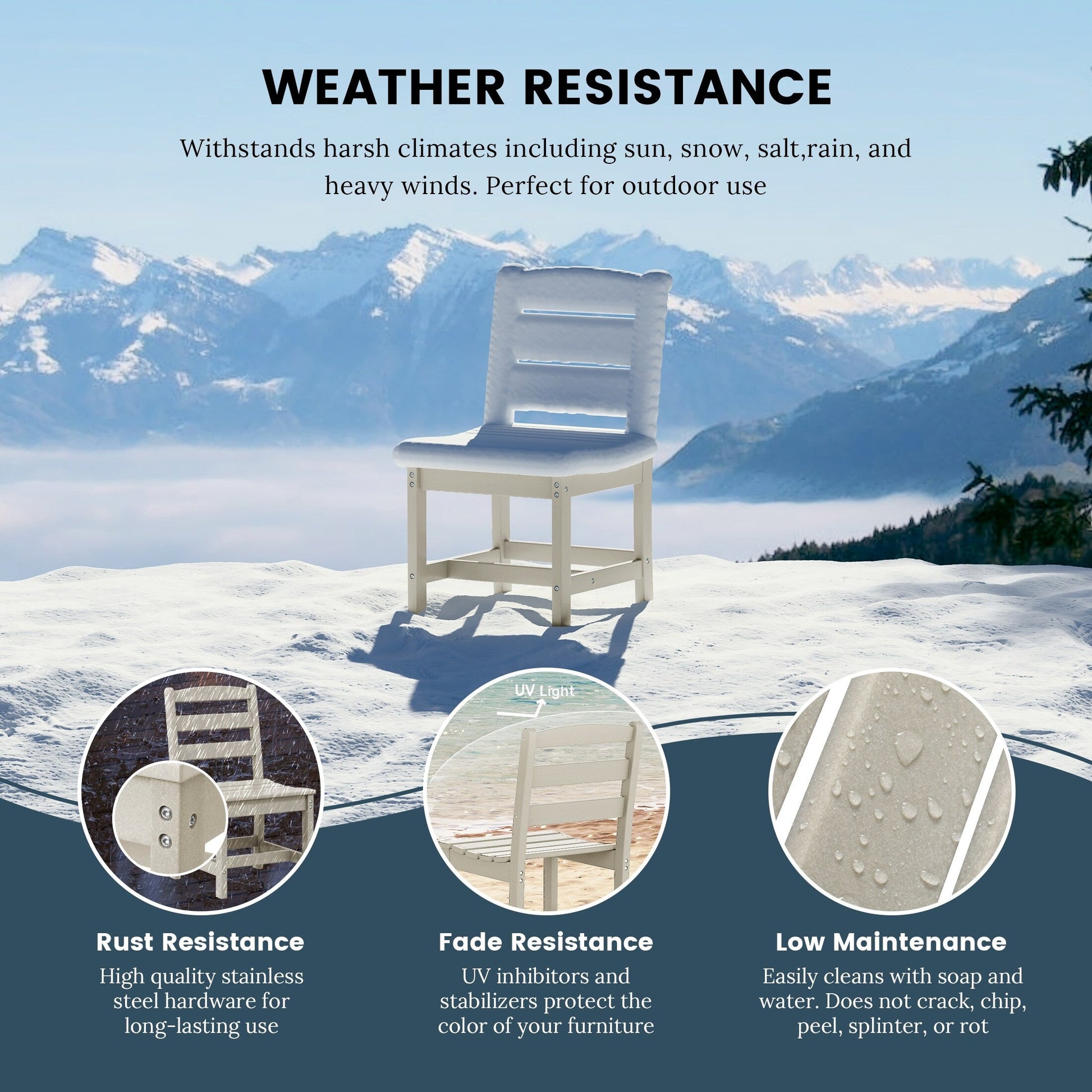 Share a relaxing meal with friends and family on your patio with this charming 6-piece dining set. Crafted from durable all-weather HDPE material, it is fade—and UV-resistant, making it the ideal choice for outdoor use. Enjoy warm, sunny days without the sun getting in the way, thanks to the table's built-in 1.9' diameter umbrella hole, which is perfect for adding an existing umbrella. Not only is the set built to be appealing but also durable with the table-top reinforced aluminum metal frame that increases the overall stability and durability and the bench reinforced bottom that is also equipped with stainless steel plates along the skirt to help reduce warping, the chairs contoured seat and arched backrest provide optimal comfort. Create memories with your family this season with this set.