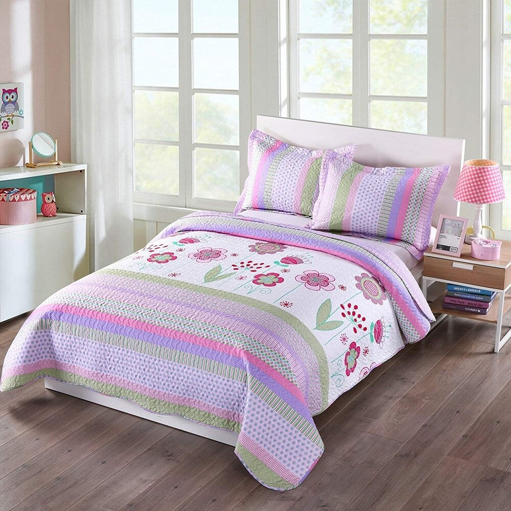 Brighten up your child's bedroom with the Porch & Den Lela Floral Comforter Set. This reversible quilt set features an elegant and cute design that will add a touch of vibrancy to any room. Use it as a quilt in spring and summer, or as a bedspread or sheets in the winter. Choose from a variety of vibrant patterns to infuse warmth and personality into your home. Top decorators around the globe consistently choose these quilt sets, and now you can too.