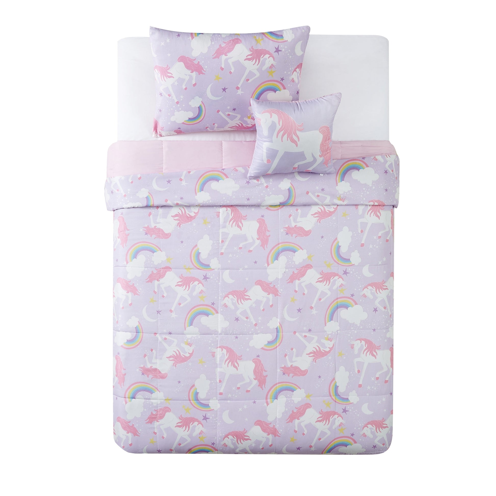 Bring a touch of magic to your little girl's bedroom with this four-piece comforter set featuring an enchanting pattern of unicorns and rainbows. Made with soft microfiber and filled with polyester for warmth, the quilted construction ensures that the filling stays in place while your child sleeps. The light purple background and pink accents add a calming atmosphere to her space, helping her get a good night's rest. This set also includes a decorative pillow to complete the look.