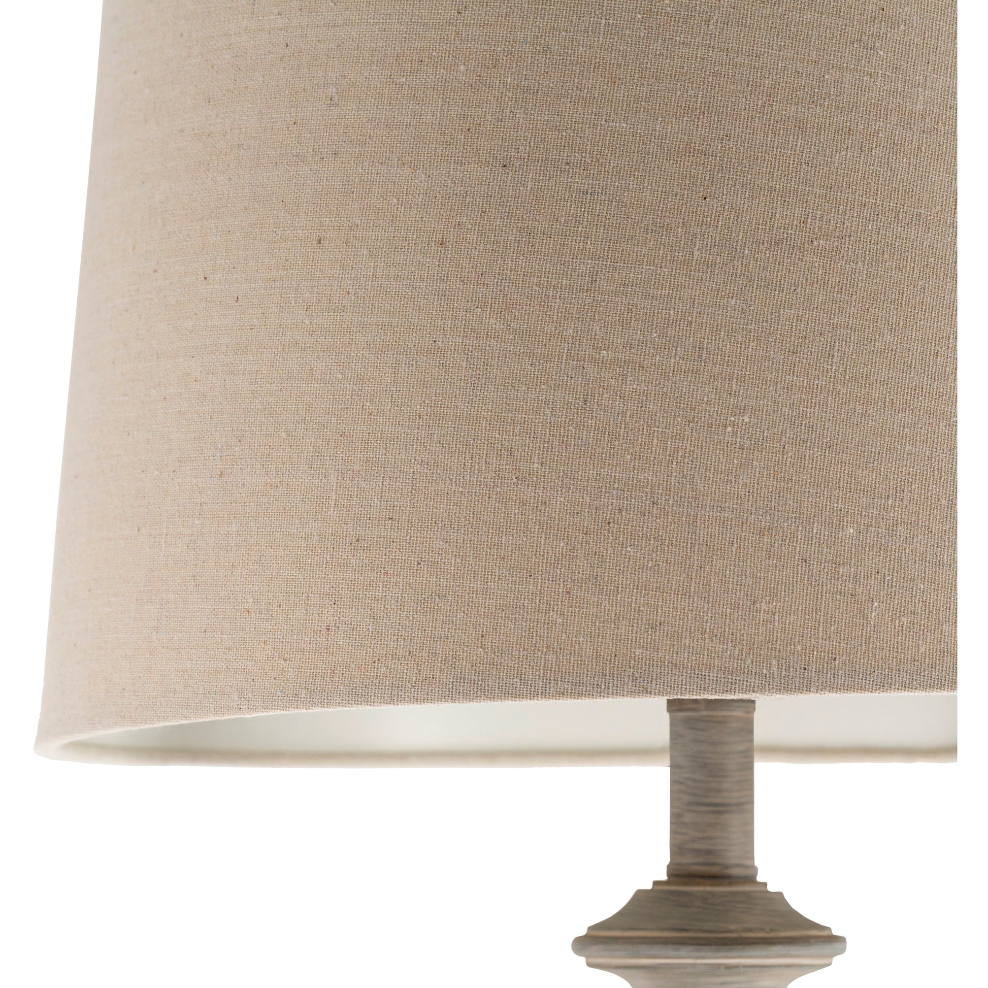 - Shade(Outside): Linen, Shade(Inside): Polyester, Body: Composition, Base: Composition, Finial: Composition, Harp: Metal