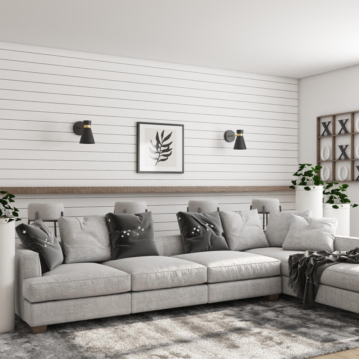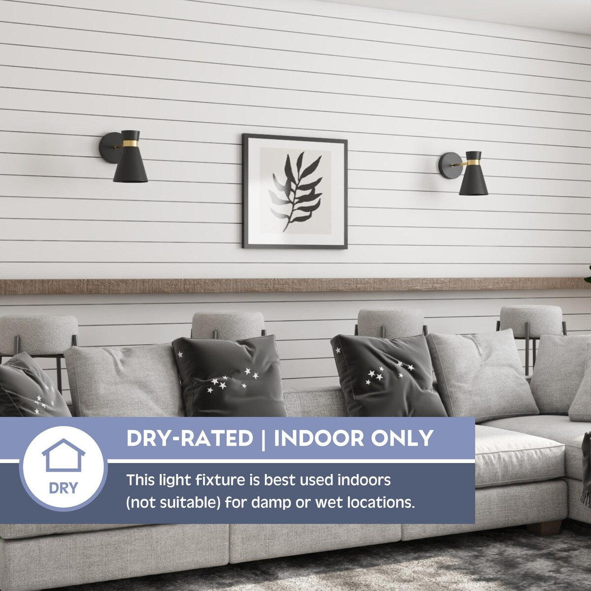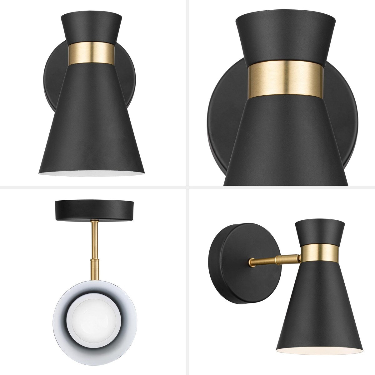 Mid-century modern design meets modern technology with this pair of LED Wall Sconces from Prominence Home. Battery operated with remote control, these lights provide a simple way to add ambiance and light to your hallway, bedrooms, framing shelves or art in a living room. With no junction box required, these attractive lights feature a tapered metal shade in a matte black finish with brushed gold accents that can be installed anywhere in the home, making them great for both homeowners and renters.