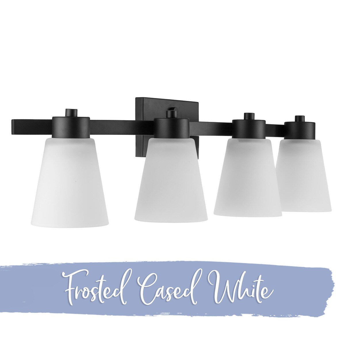 - This matte black fixture with frosted glass is compatible with a dimmer switch (not included), allowing you to adjust the light to fit your needs.
