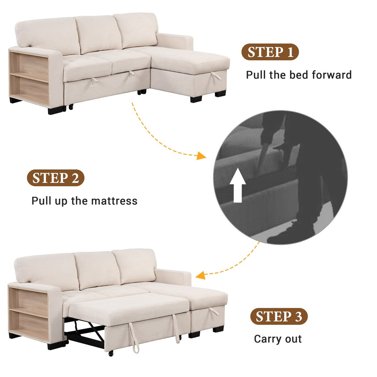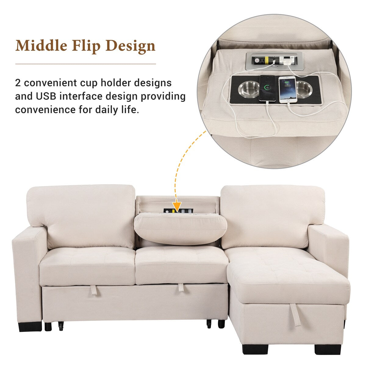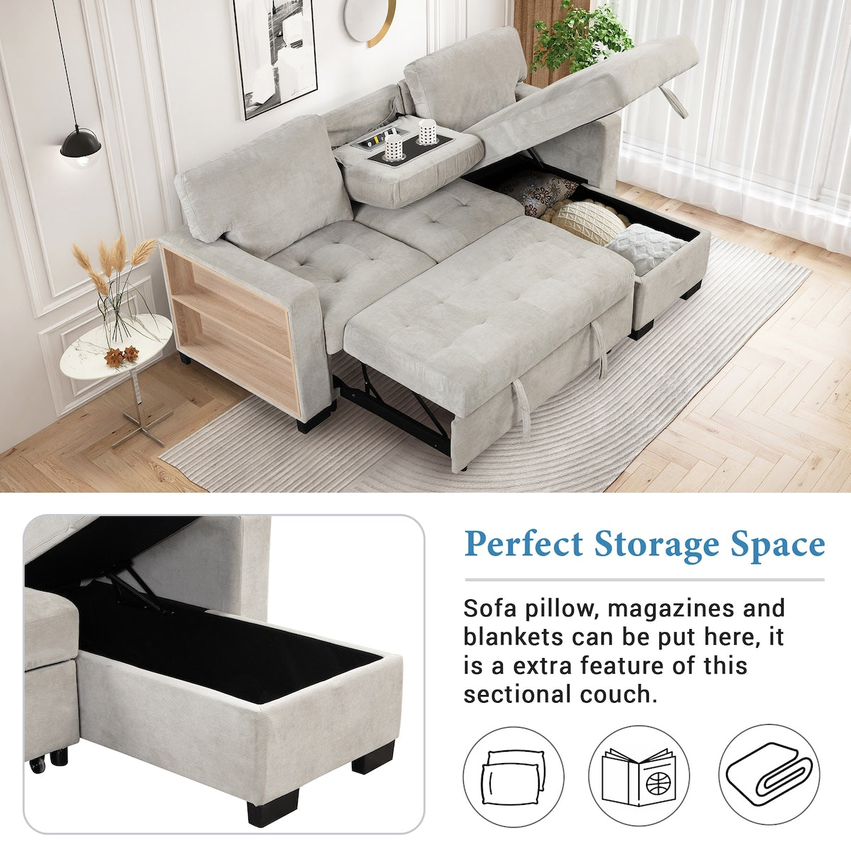 - Multiple storage options with a spacious pull-out bed and an light chaise lounge.