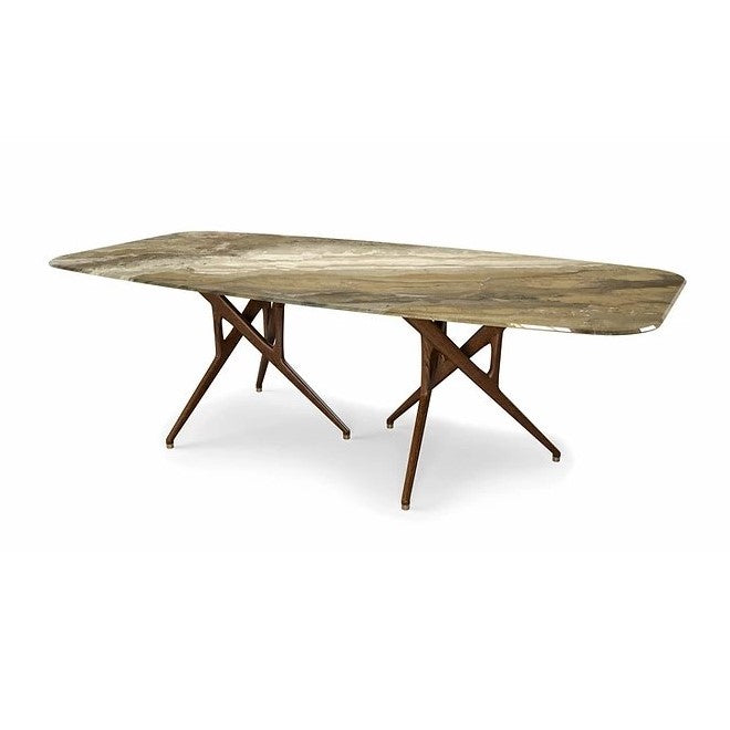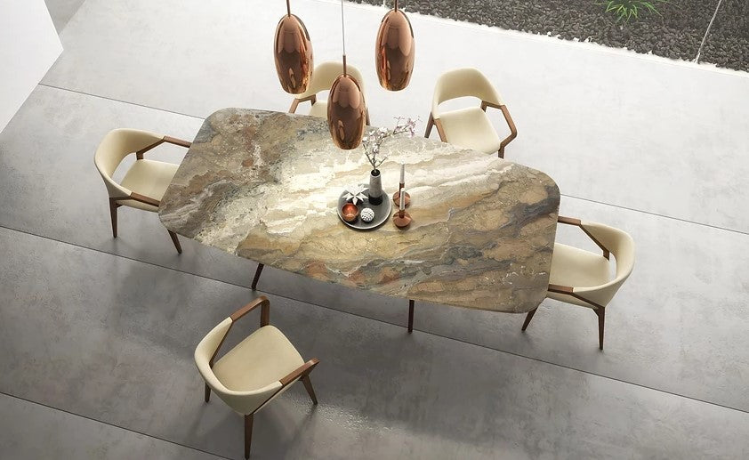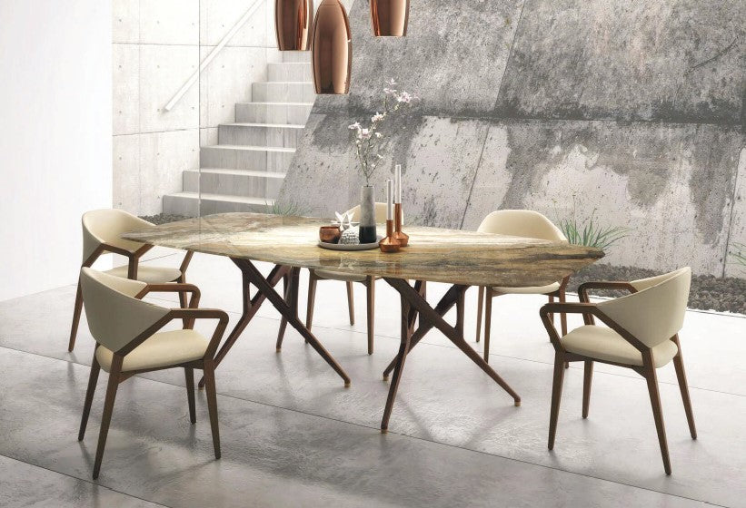 [description] La table à manger rectangulaire Rafa impressionne dès le premier regard. Son piètement sculptural aux pieds croisés, finition noyer, captive tous les amateurs de design. Son luxueux plateau en verre biseauté effet pierre beige-gris, imprimé cristal, est saisissant et présente un motif tourbillonnant. Son plateau offre un espace généreux pour prendre ses repas confortablement et profiter de longs dîners conviviaux.