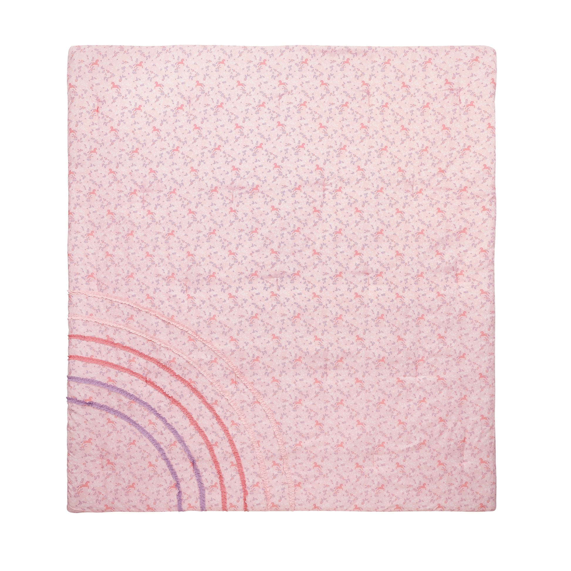 Transform your bedroom into a magical wonderland with the ALEX + BELLA Rainbow Ruffle Pink Comforter Set. This bedding set features a darling floral unicorn print with colorful scalloped ruffles arranged in a rainbow shape. Two decorative throw pillows are included- a plush unicorn pillow with satin ruffled 'hair' and applique and embroidered details, and a pale pink pintuck square throw pillow. The microfiber soft brushed hand provides a cozy feel, and the set is machine washable. Perfect for any decor, this set will bring joy to your room.