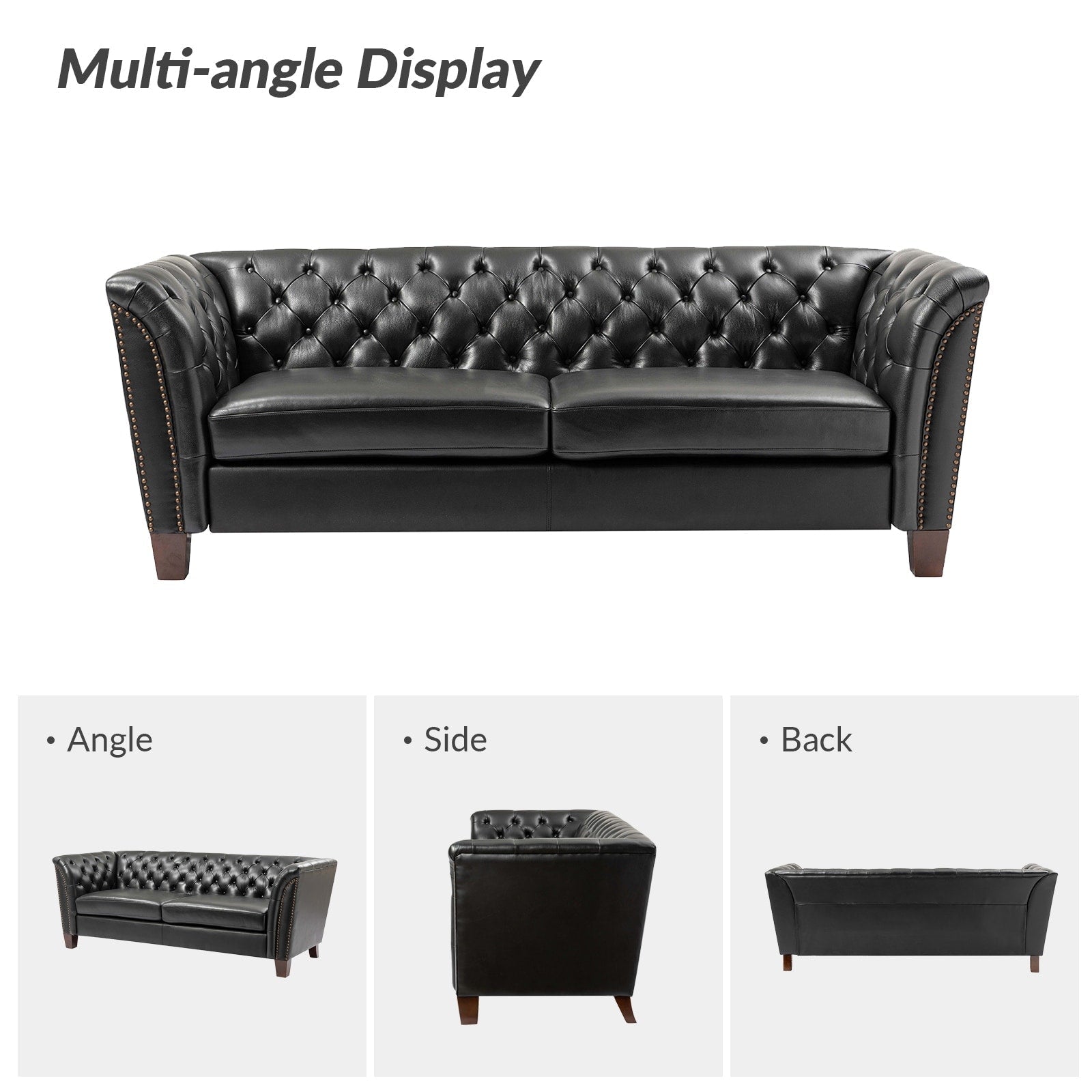 Embark on a journey of luxury with this button-tufted genuine leather sofa couch, meticulously crafted to bestow your living room with elegance. Its chic and sophisticated design harks back to the classic Chesterfield style, evoking an enduring sense of charm. Supported by impeccably tapered wood legs, this piece with graceful flared arms, seamlessly blends tradition with modern aesthetics. Crafted with meticulous attention to detail, the sofa's every stitch and contour speaks to the dedication we invest in delivering a piece that not only looks refined but is built to last. Savor the supple embrace of genuine leather, elevating your comfort to new heights. Make a bold statement of refinement in your home with this mid-century modern sofa that complements a variety of interior aesthetics.