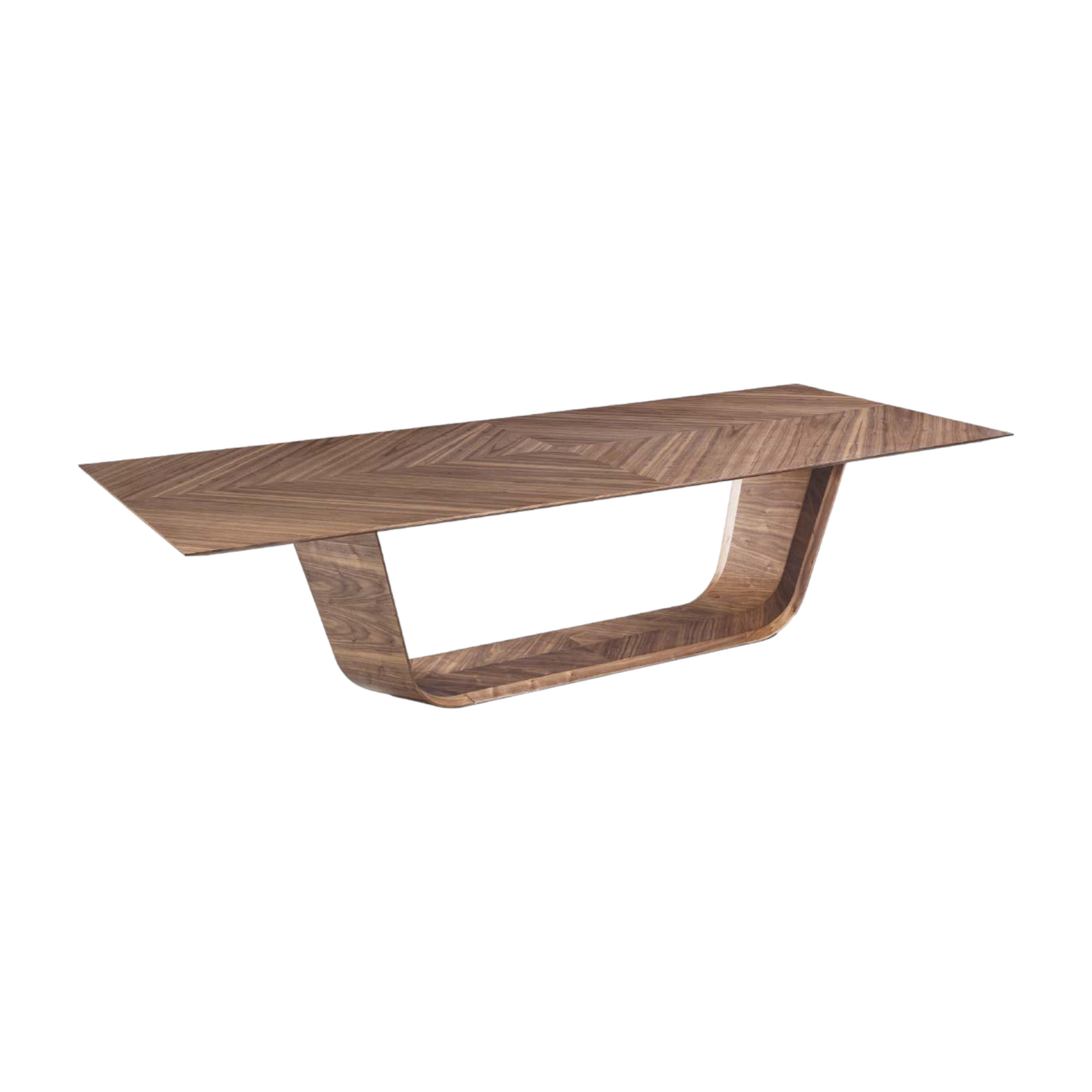 contemporain et élégant design sophistiqué et distinctif plateau rectangulaire et chanfreiné en noyer à motifs géométriques socle en bois aux légères courbes en noyer il convient à 8 personnes |
