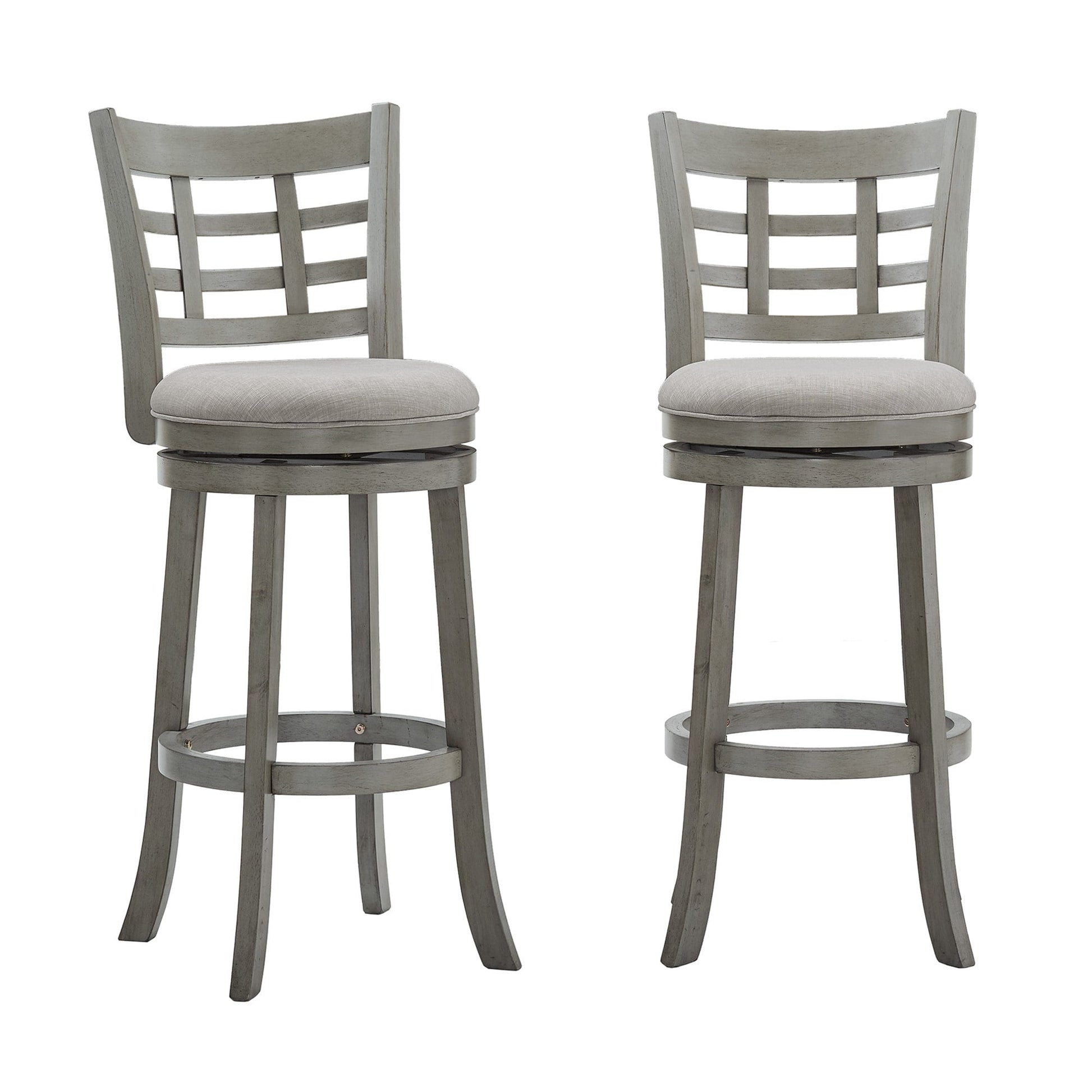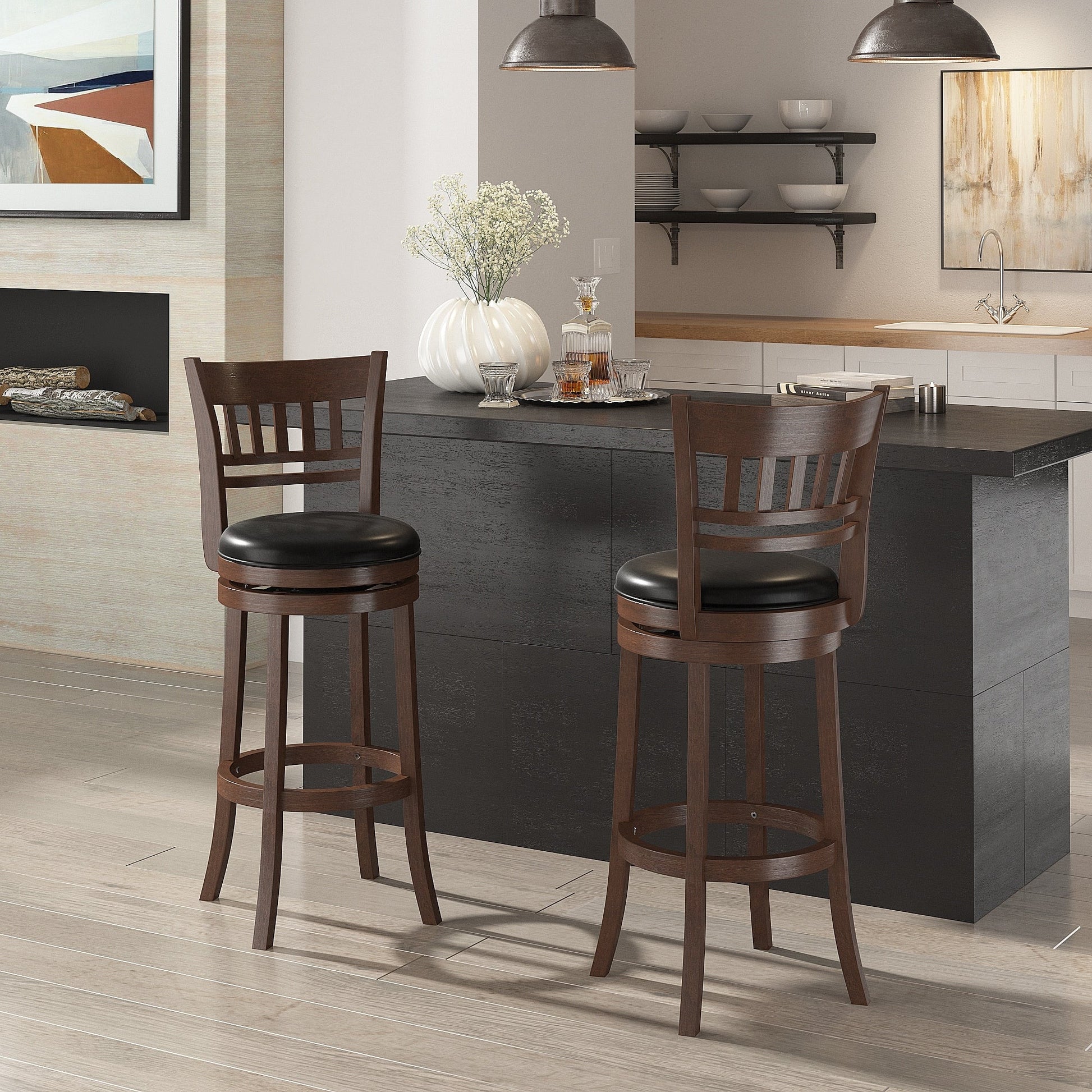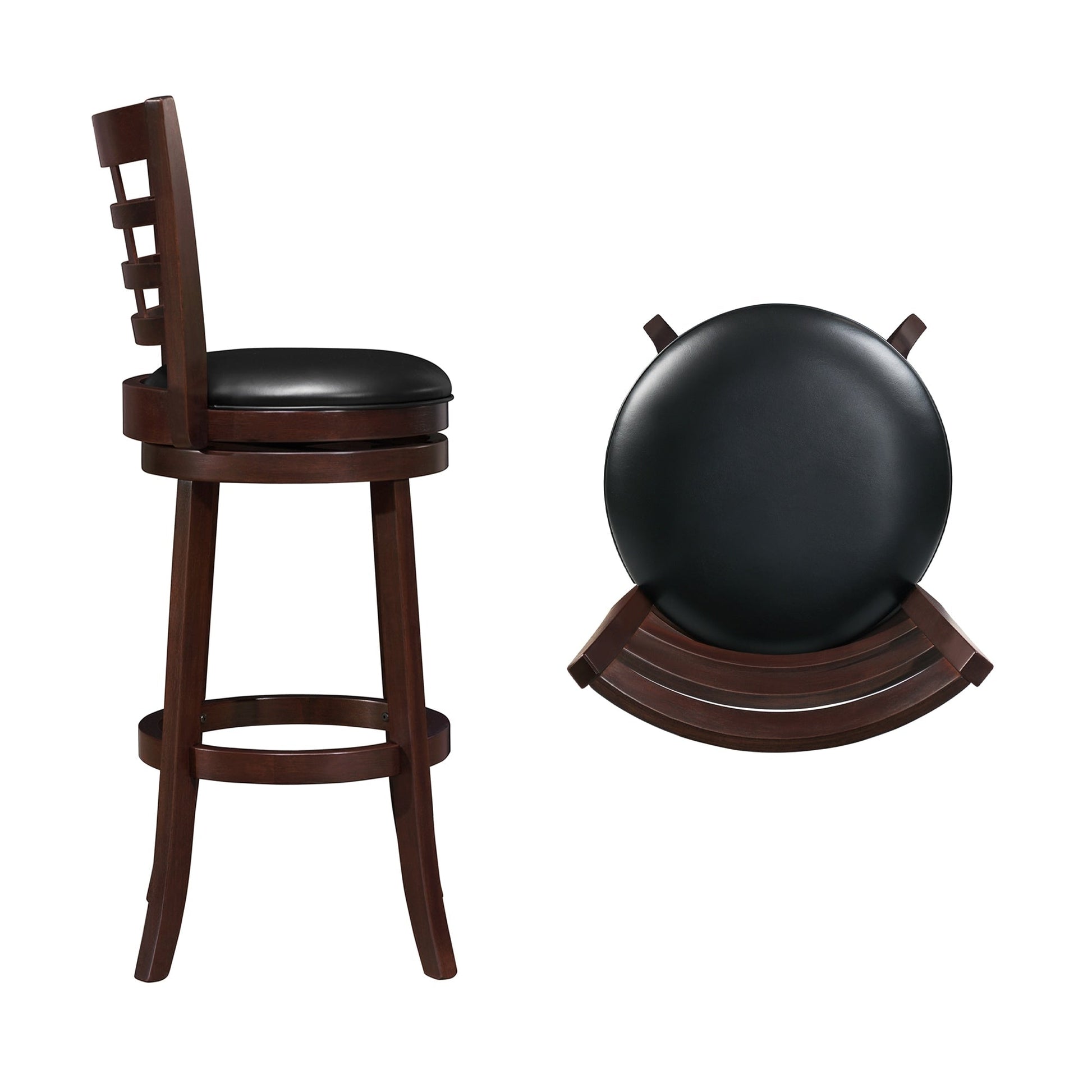 Constructed of durable rubberwood, this Upholstered Back Swivel Stool displays a beautiful, classic style and offers comfortable support for everyday dining. A rich wood finish completes the chair's frame, while a footrest and upholstered seat provide improved comfort for daily use. The swivel function of this stool provides advanced mobility and makes it easy to have a casual conversation with friends and family during mealtime. The curved back design adds additional support, so you can look forward to sitting in this seat.