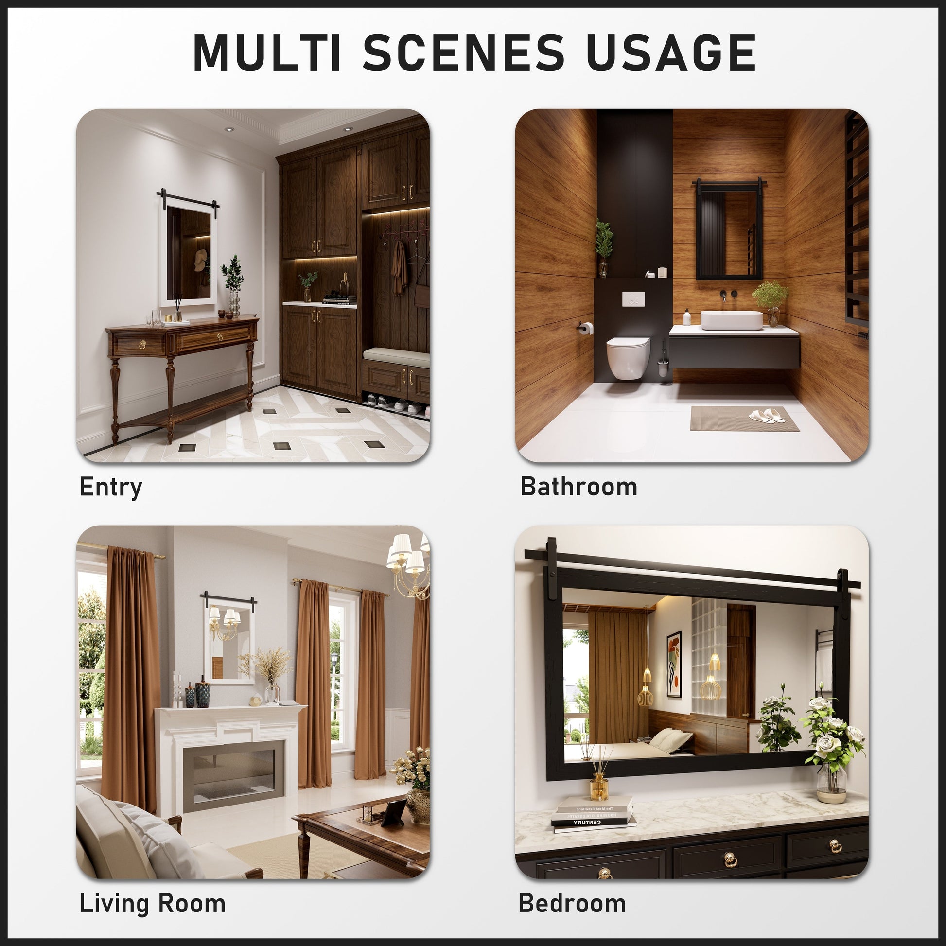- Decorative Mirrors: Use farmhouse mirrors alone in your bathroom or place 2 or more of these rustic mirrors in your bathroom to decorate any room or create a larger living space.