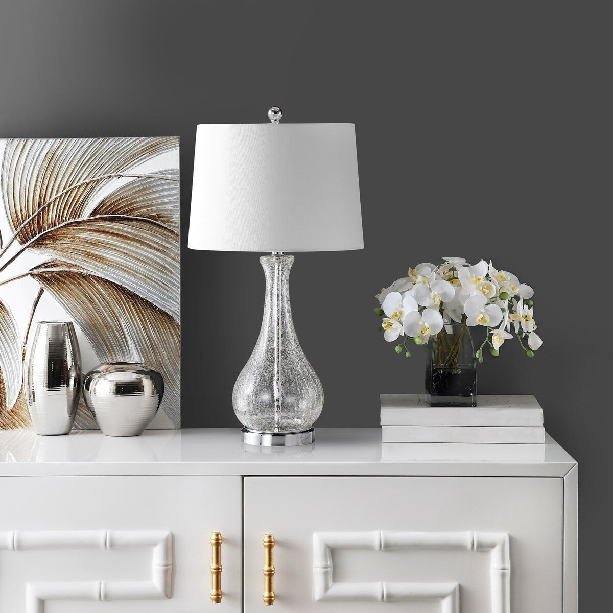 Designed to update any living room, this contemporary table lamp blends seamlessly into any décor. Its clear glass body reflects the light, ethereal glow filtered through its complementary cotton barrel shade. Designers love its sleek chrome finish.