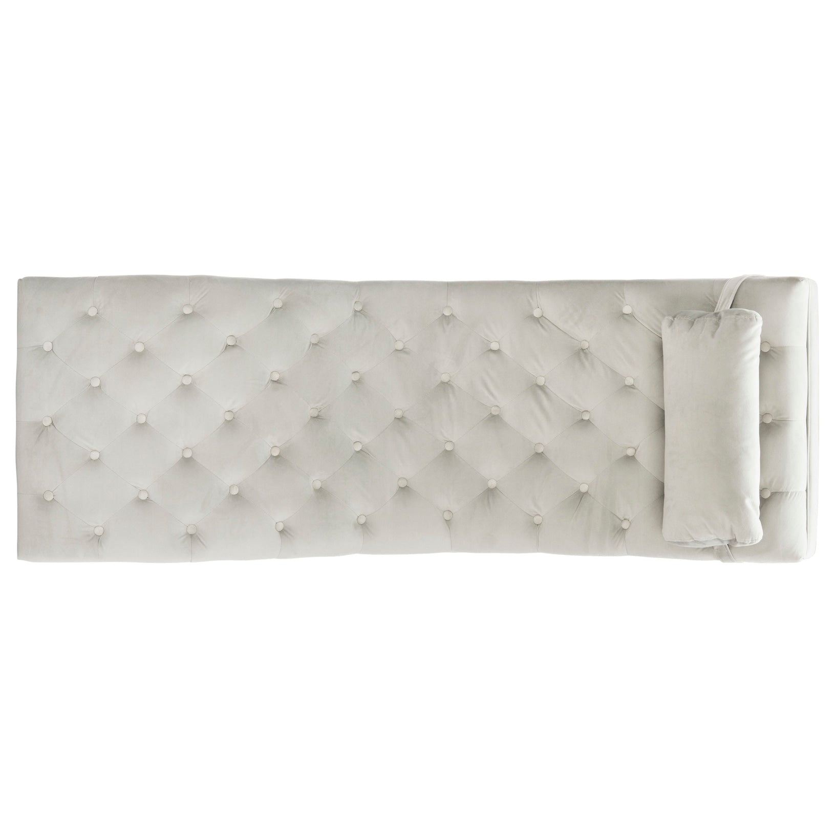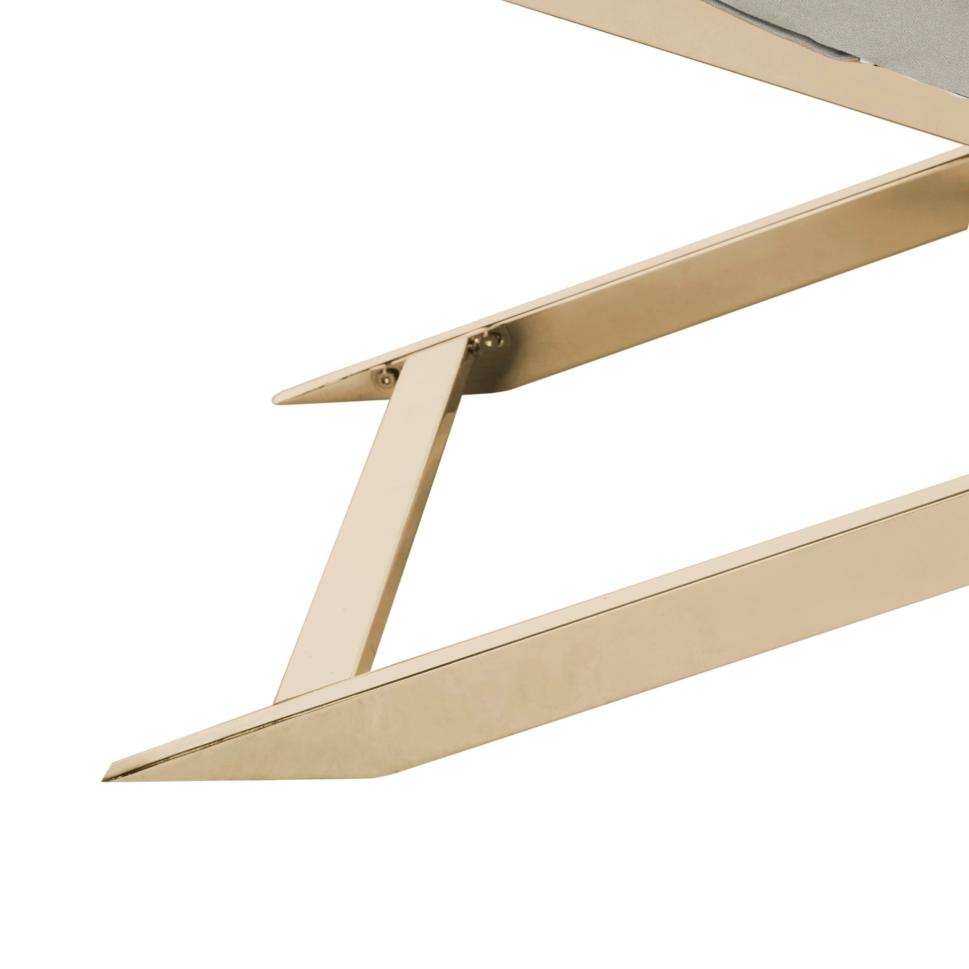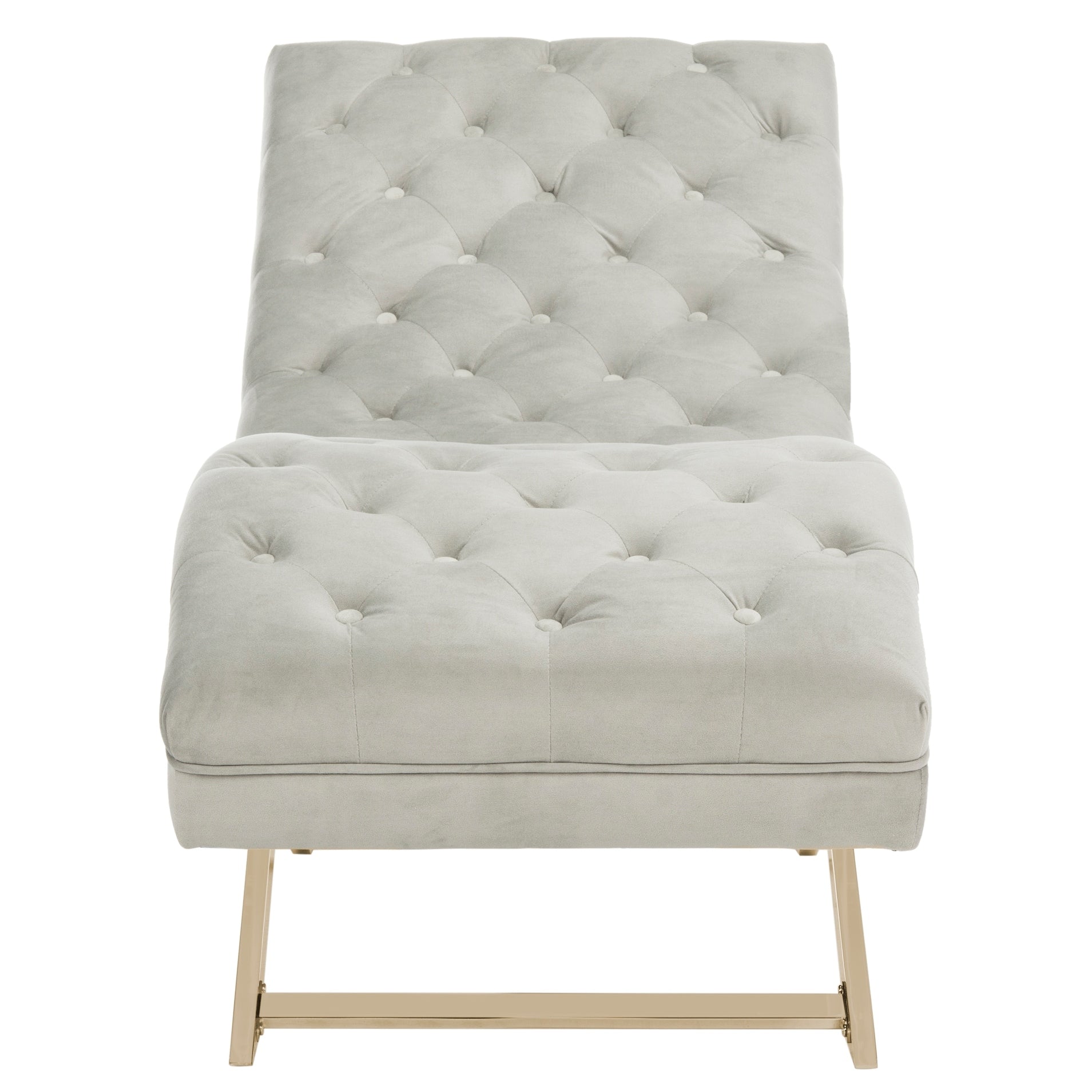 A resort spa in Gstaad inspired this luxurious contemporary chaise with headrest pillow. Its sleek gold-plated finish is paired with plush tufted velvet upholstery in a soothing grey to create a posh oasis for rest and relaxation in the living room or bedroom.