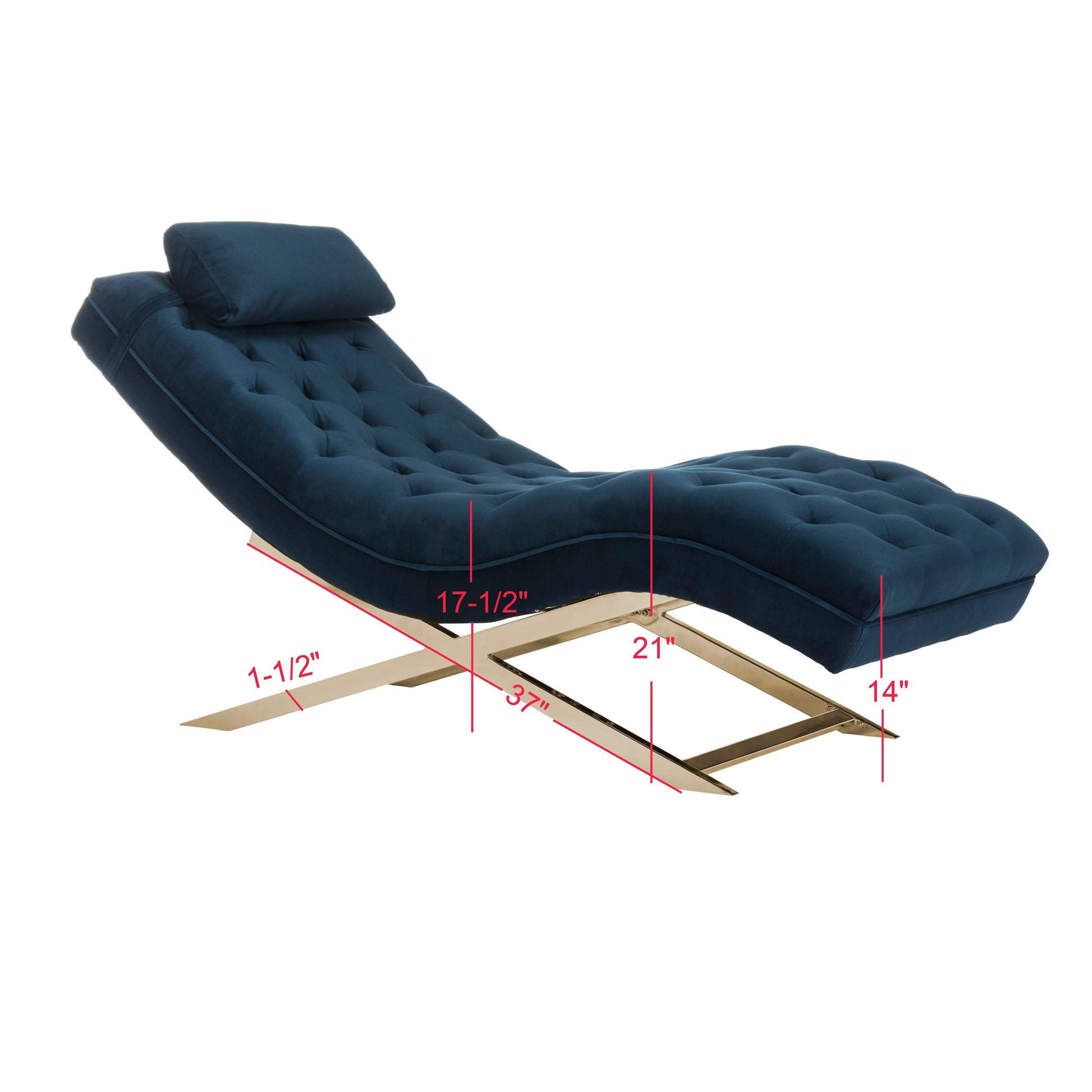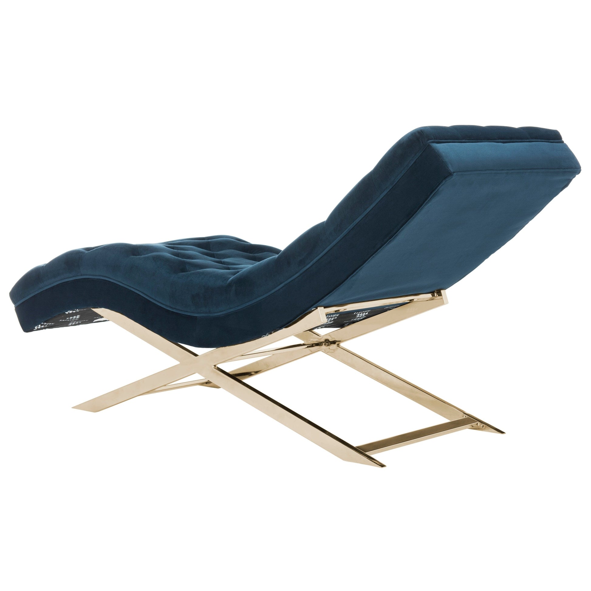 A resort spa in Gstaad inspired this luxurious contemporary chaise with headrest pillow. Its sleek gold-plated finish is paired with plush tufted velvet upholstery in a soothing navy to create a posh oasis for rest and relaxation in the living room or bedroom.