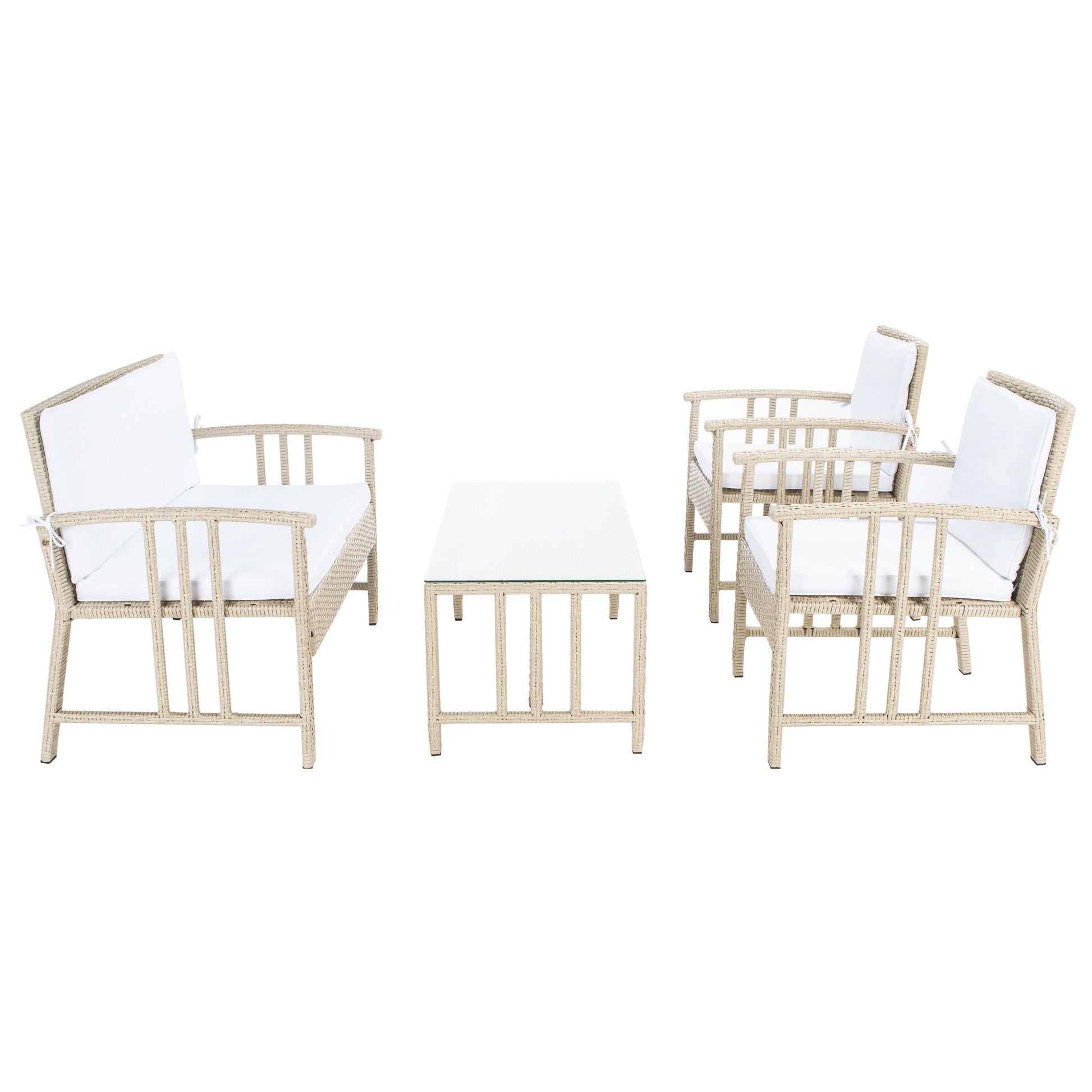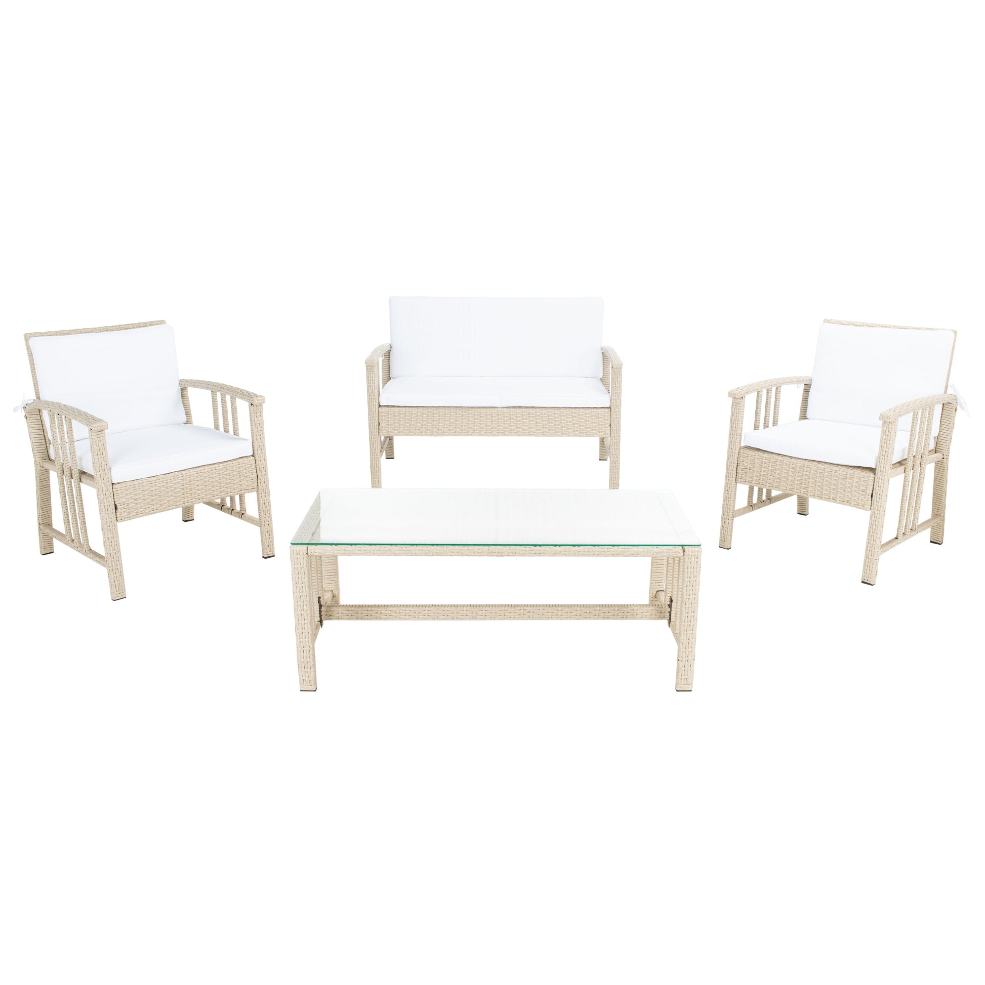 Bring the beauty of the outdoors to your patio with the SAFAVIEH Outdoor Reslor 4-Piece Wicker Living Set. The woven wicker frames and plush, white cushions create a comfortable and inviting atmosphere for relaxation or entertaining. This set includes two armchairs, a loveseat, and a glass-topped coffee table, that are perfect for outdoor spaces of any size. Assembly is required, and this set comes in a variety of color options to suit any style.
