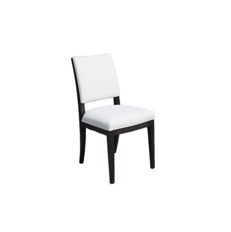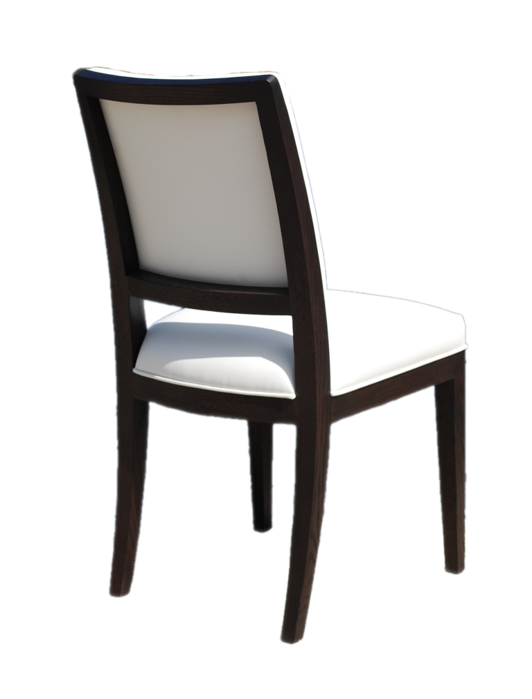 Chaise de salle à manger avec structure en chêne teinté wengé. Assise et dossier recouverts de similicuir blanc.