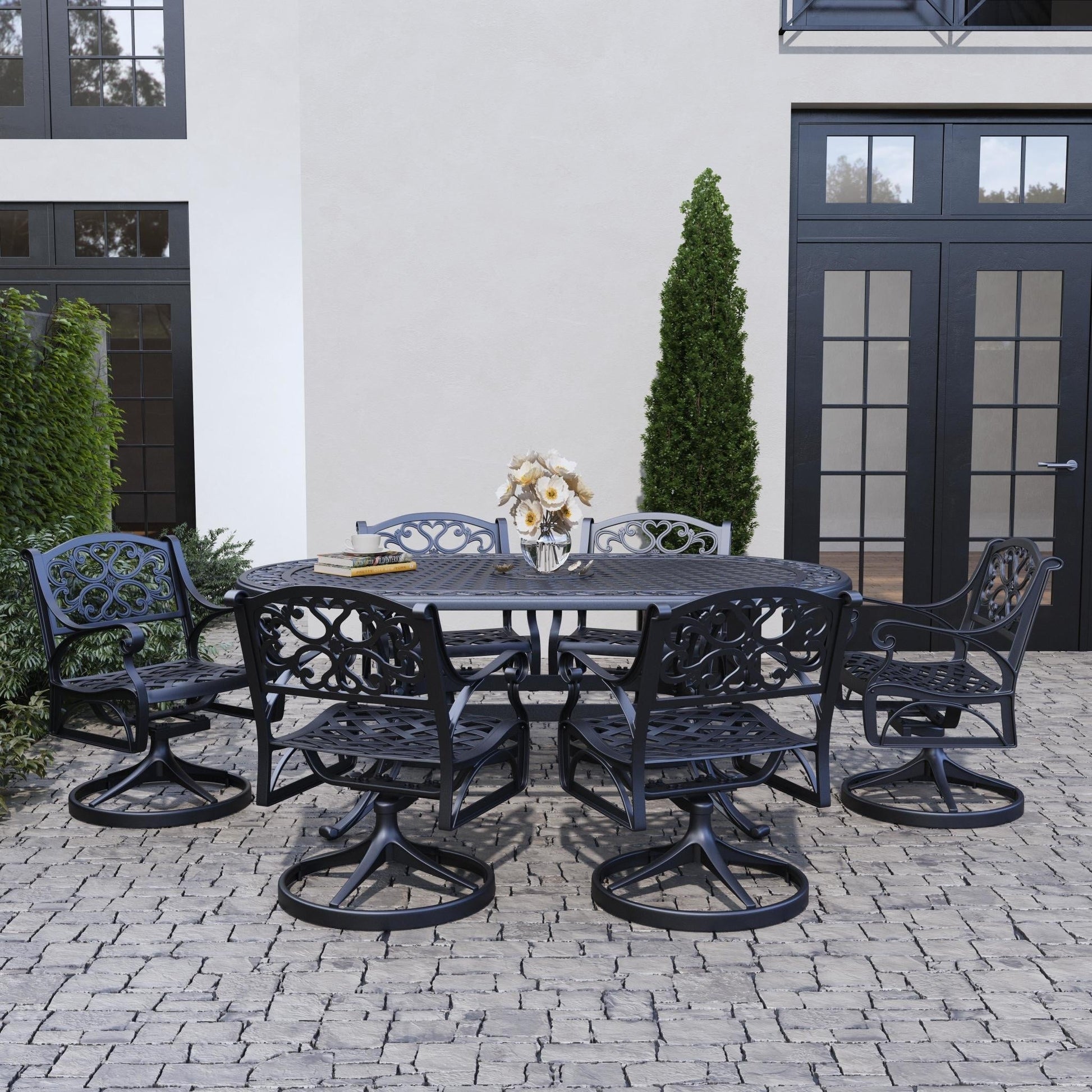 Turn an ordinary outdoor space into an oasis with this Homestyles Sanibel Outdoor Dining Set. Consisting of a table and six swivel rocker chairs, this set is constructed with black powder-coated aluminum for low-maintenance and lasting durability season after season. Simply add your own chair cushions and umbrella to create a seating arrangement that allows you to enjoy the great outdoors.