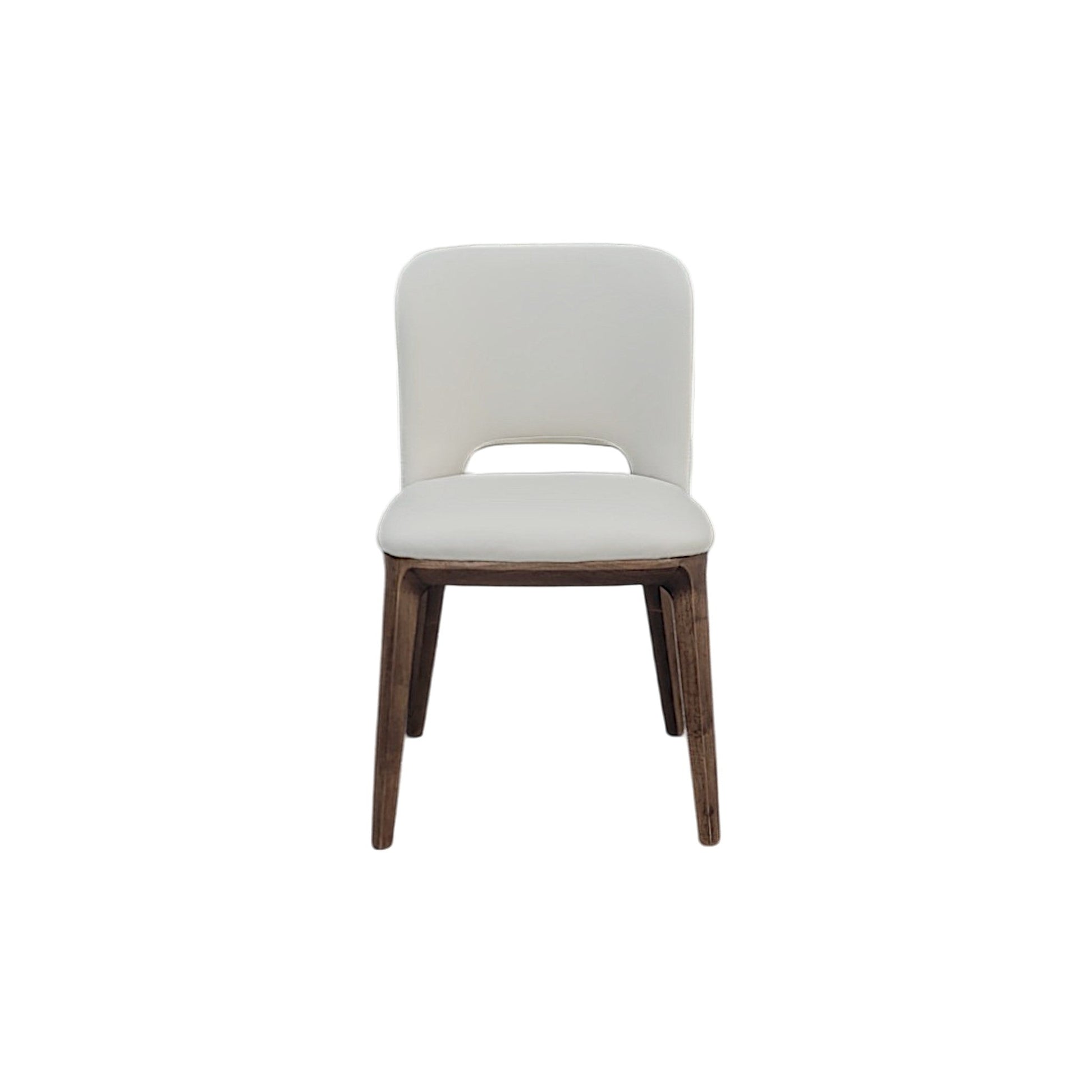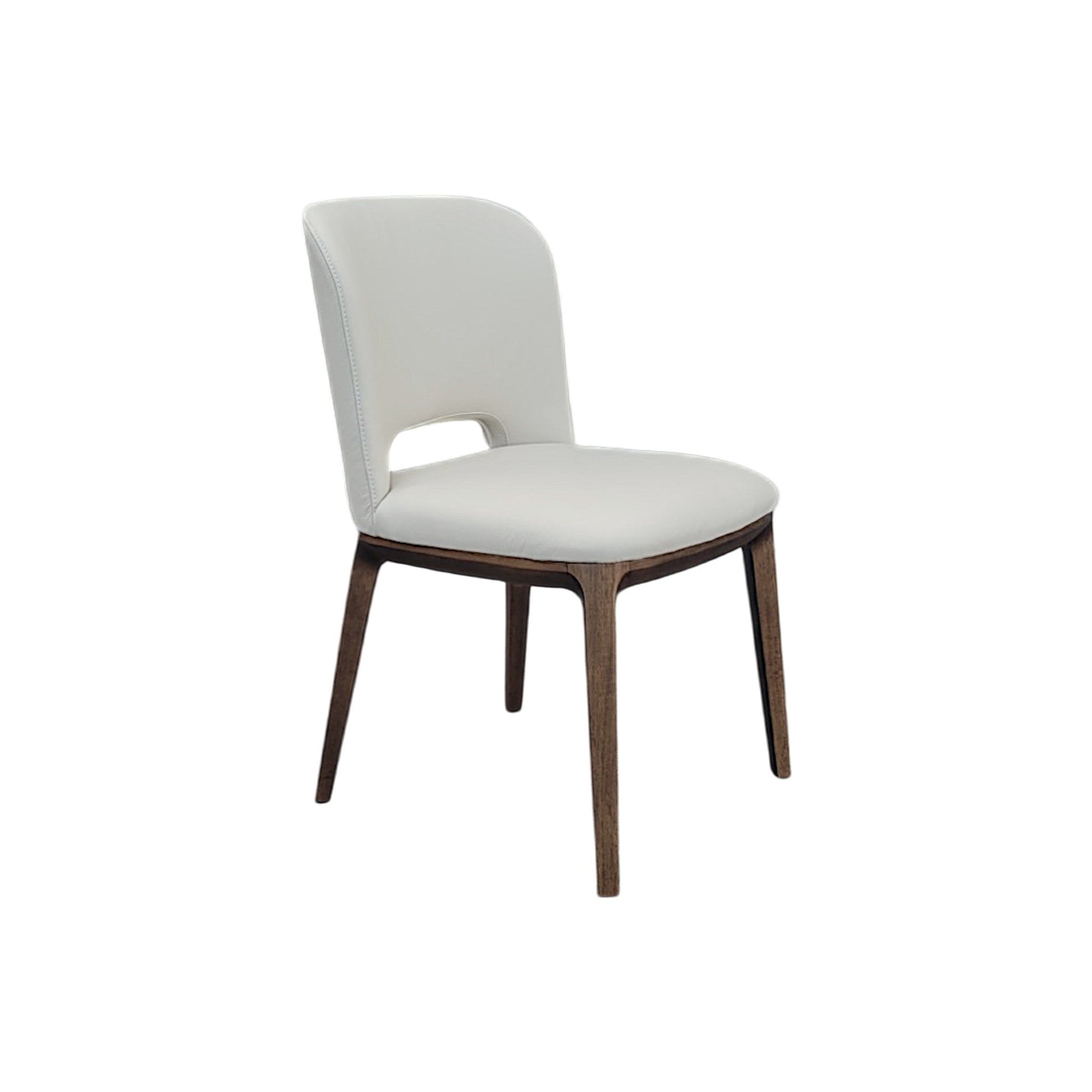 [description] La chaise de salle à manger Savona en cuir beige givré présente une forme courbe et douce qui se distingue dans toute salle à manger contemporaine. Elle est dotée d'une structure entièrement rembourrée et tapissée, d'une assise confortable recouverte de cuir beige givré et d'un dossier ouvert. Ses pieds sont finement travaillés en bois massif finition noyer clair. Cette chaise de salle à manger moderne, à la fois sophistiquée et élégante, s'harmonise parfaitement avec toutes les formes de table.