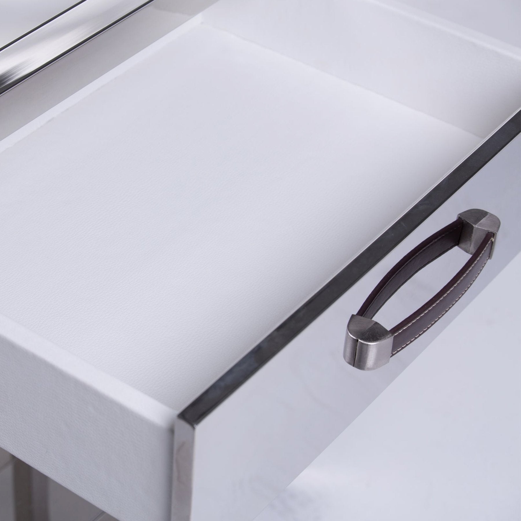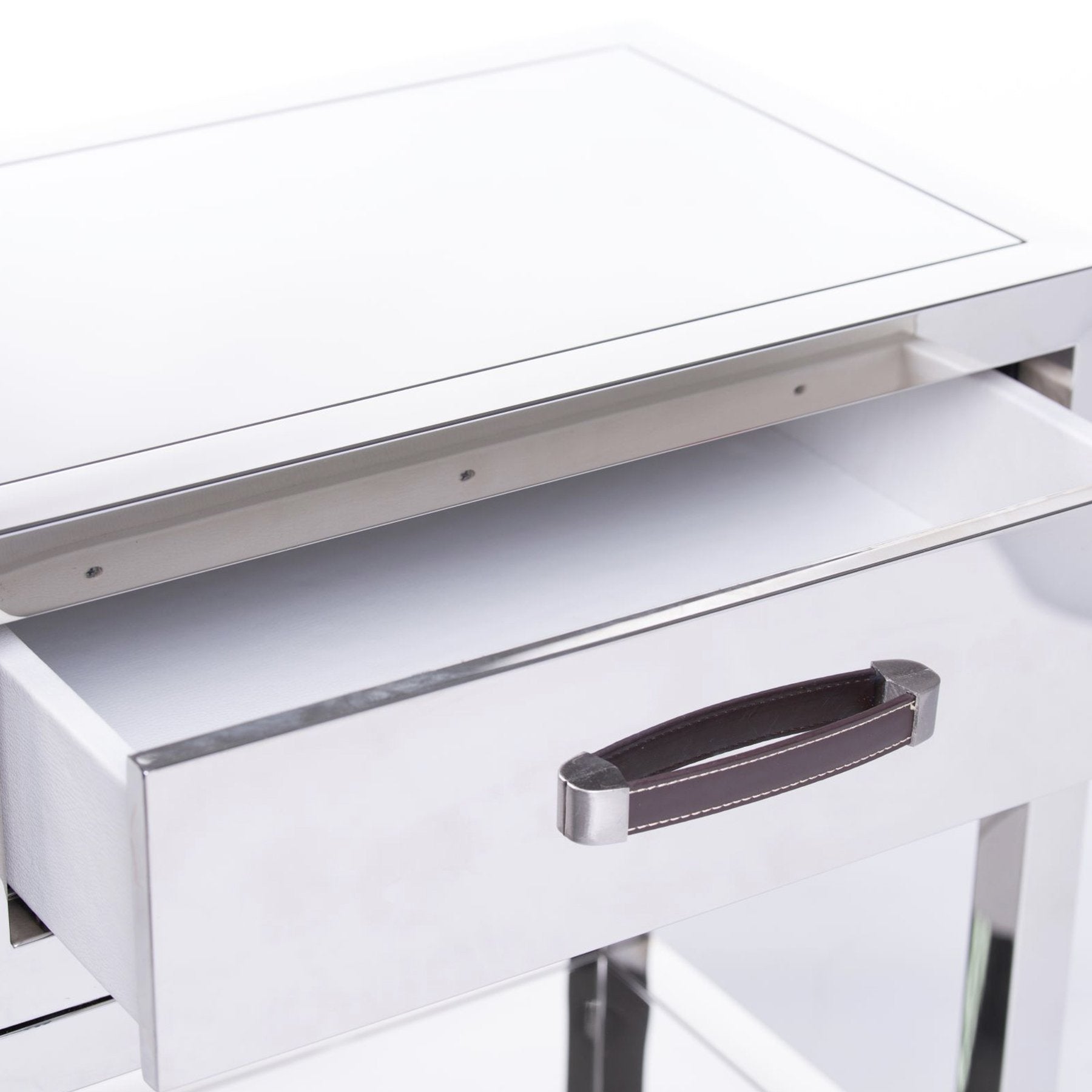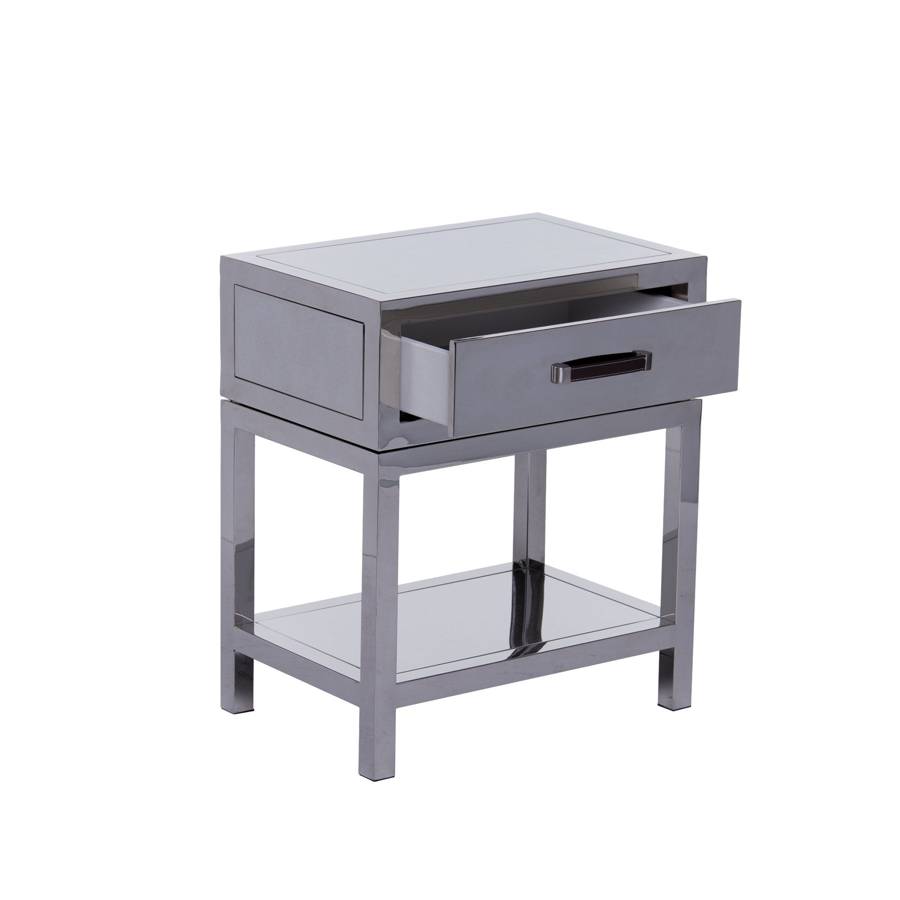[description]La table d'appoint Sendai dispose d'un tiroir et d'une étagère. Elle est fabriquée en acier inoxydable poli et dotée d'une poignée de tiroir en cuir marron. Elle est idéale pour les salons et les chambres modernes. Associez-la au lit Elysee pour un espace luxueux.[/description]