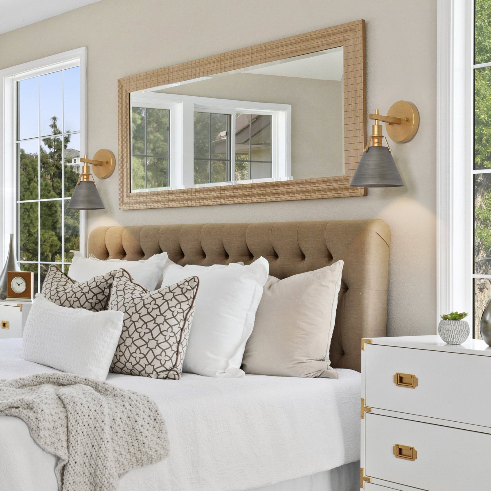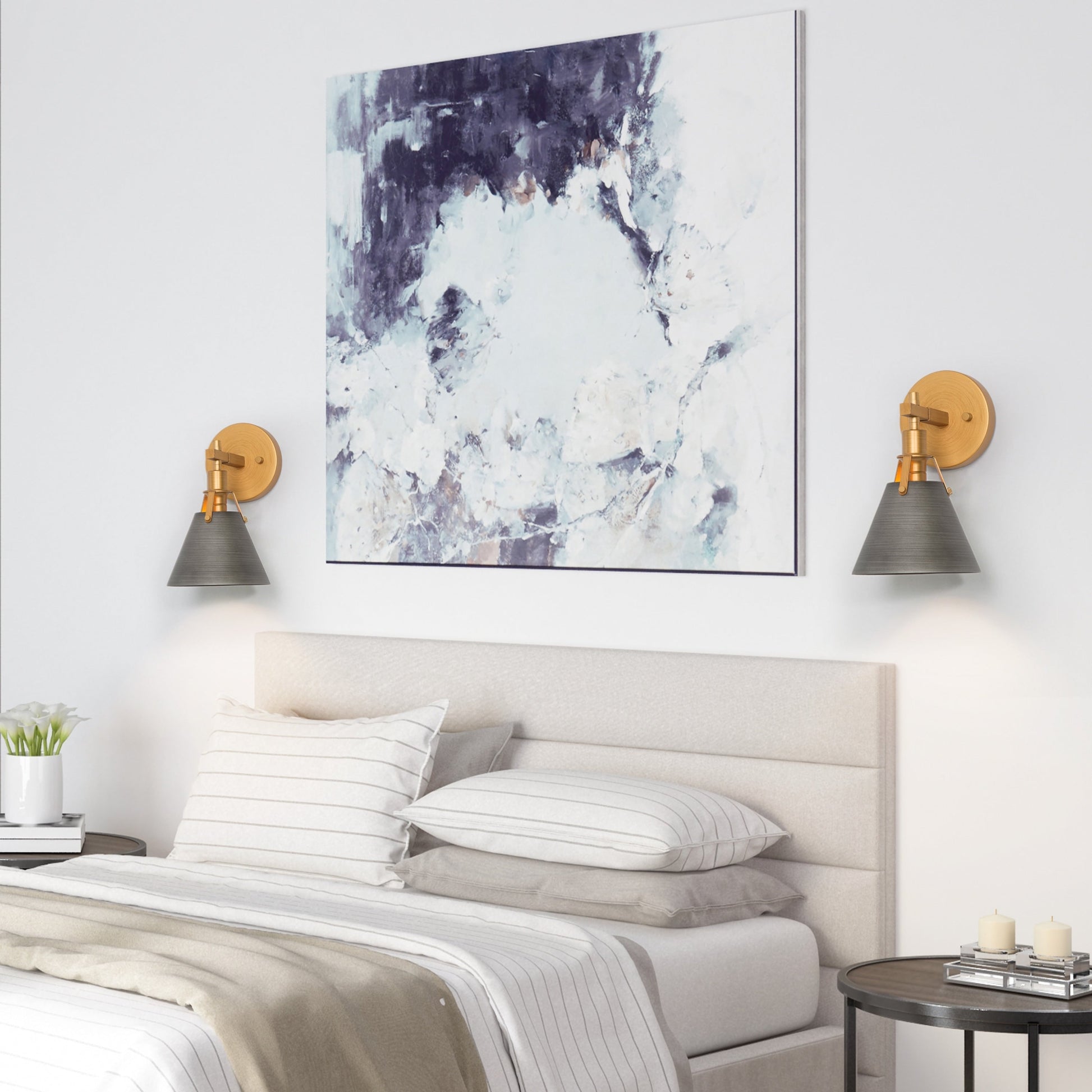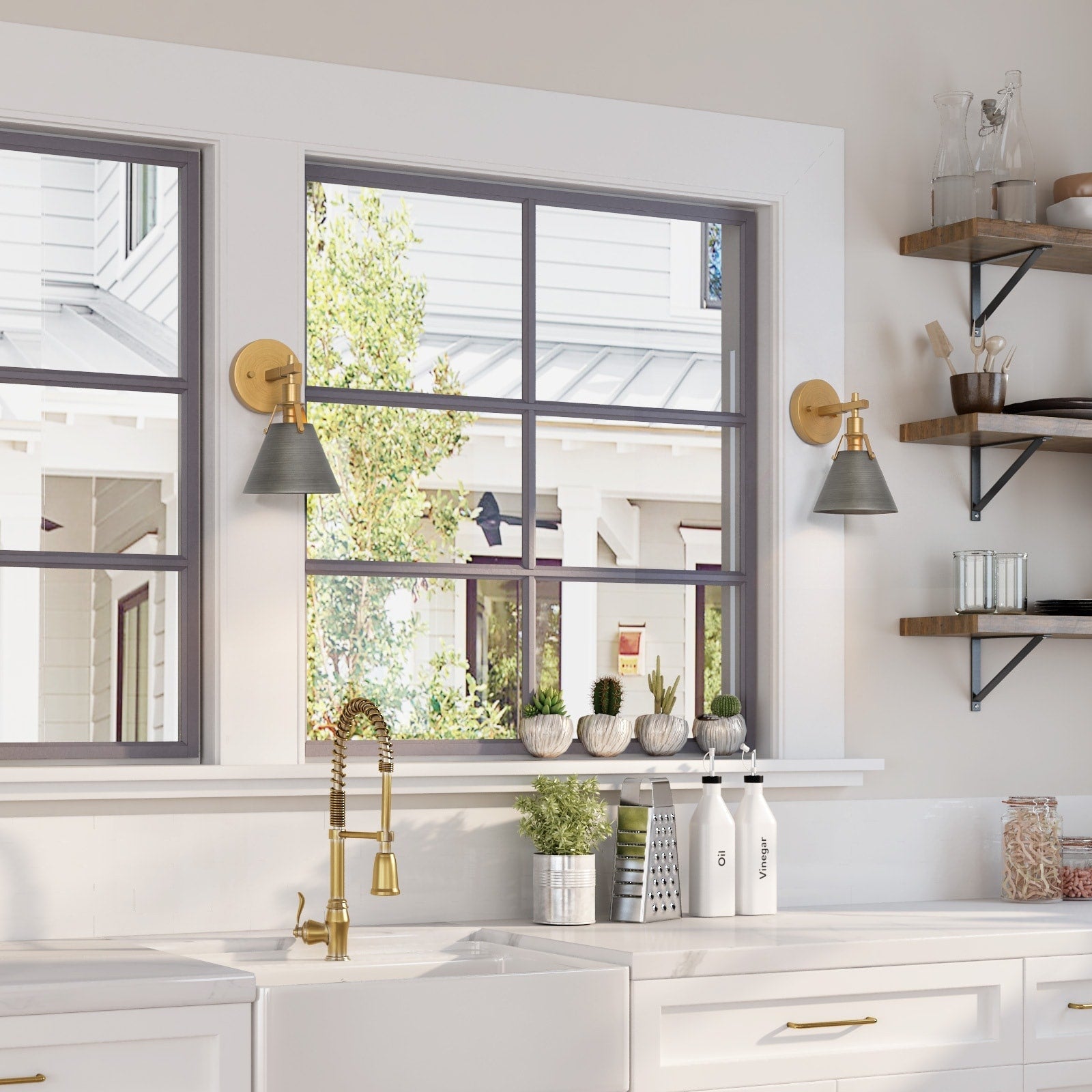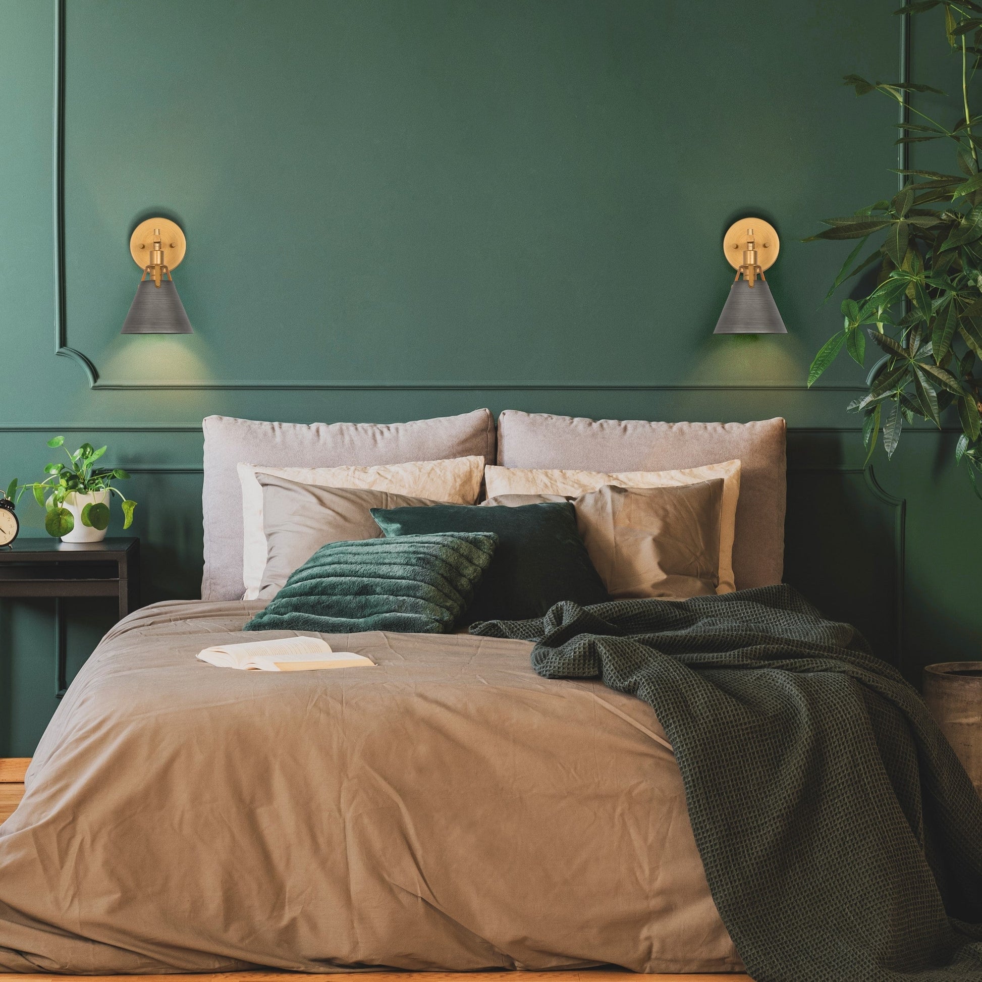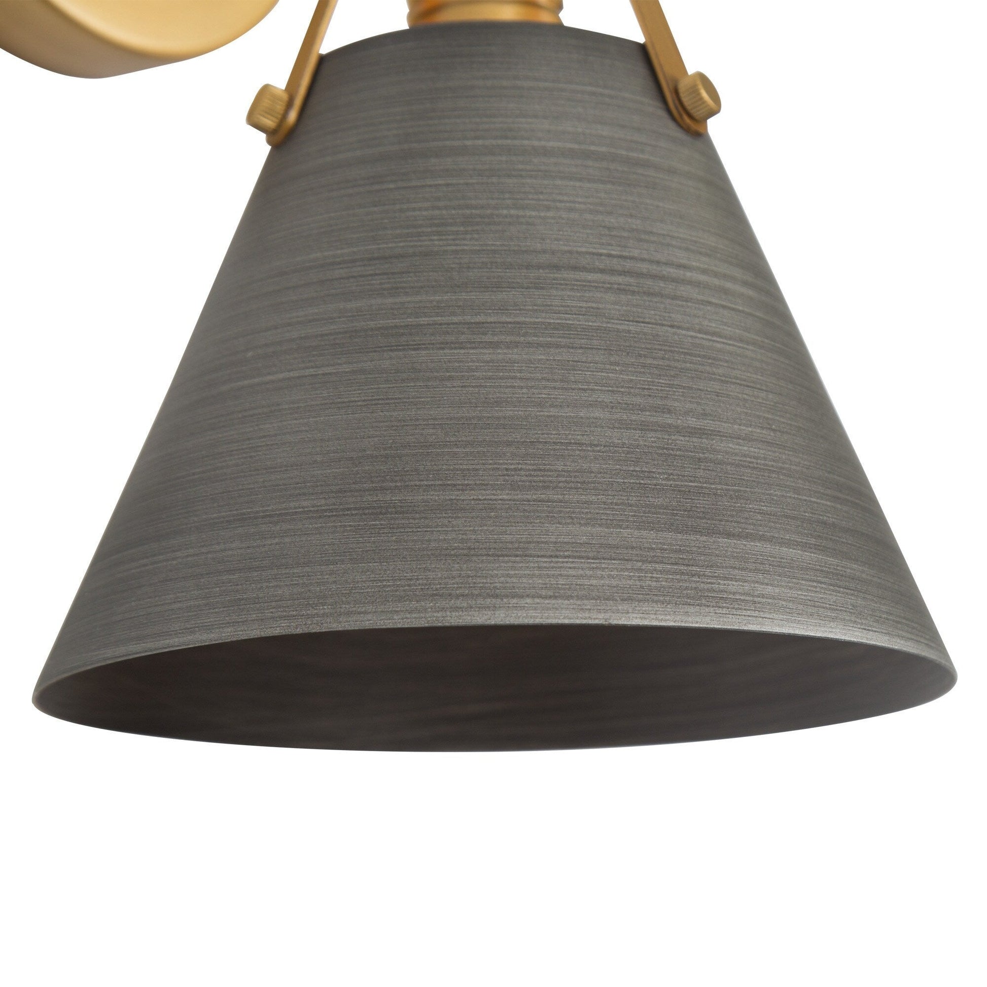 Industrial and contemporary elements meet in this stunning wall light. A brilliant display of two-toned metals, this wall sconce features a classic round canopy with conical shade to create a simple yet luxurious statement, complementing your modern and contemporary decor well. Crafted from durable metal, this fixture gleams with antique gold and brushed silver finish, lending the ambiance a vintage and glam flair.