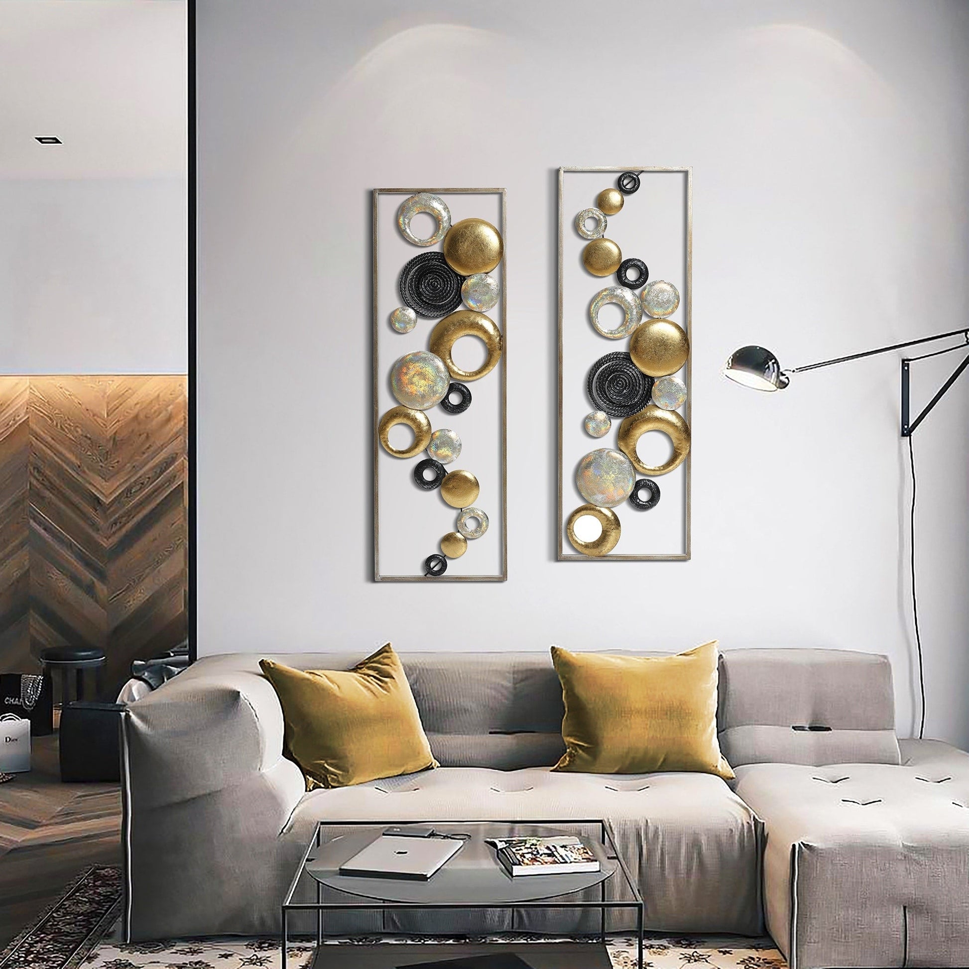 - Beautiful modern design: the artistic abstract wall decoration set features two rectangular panels with different arrangements of metal rings and discs for a unique display