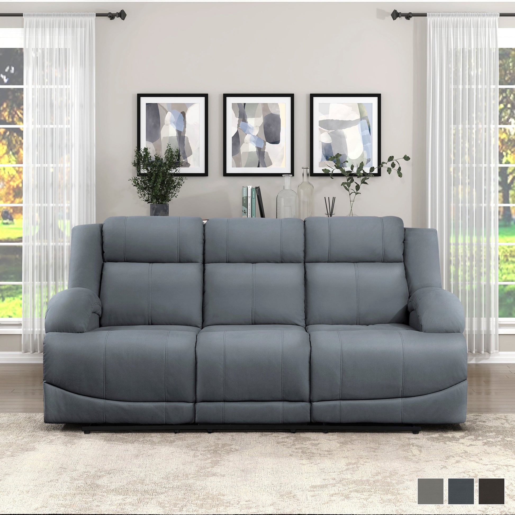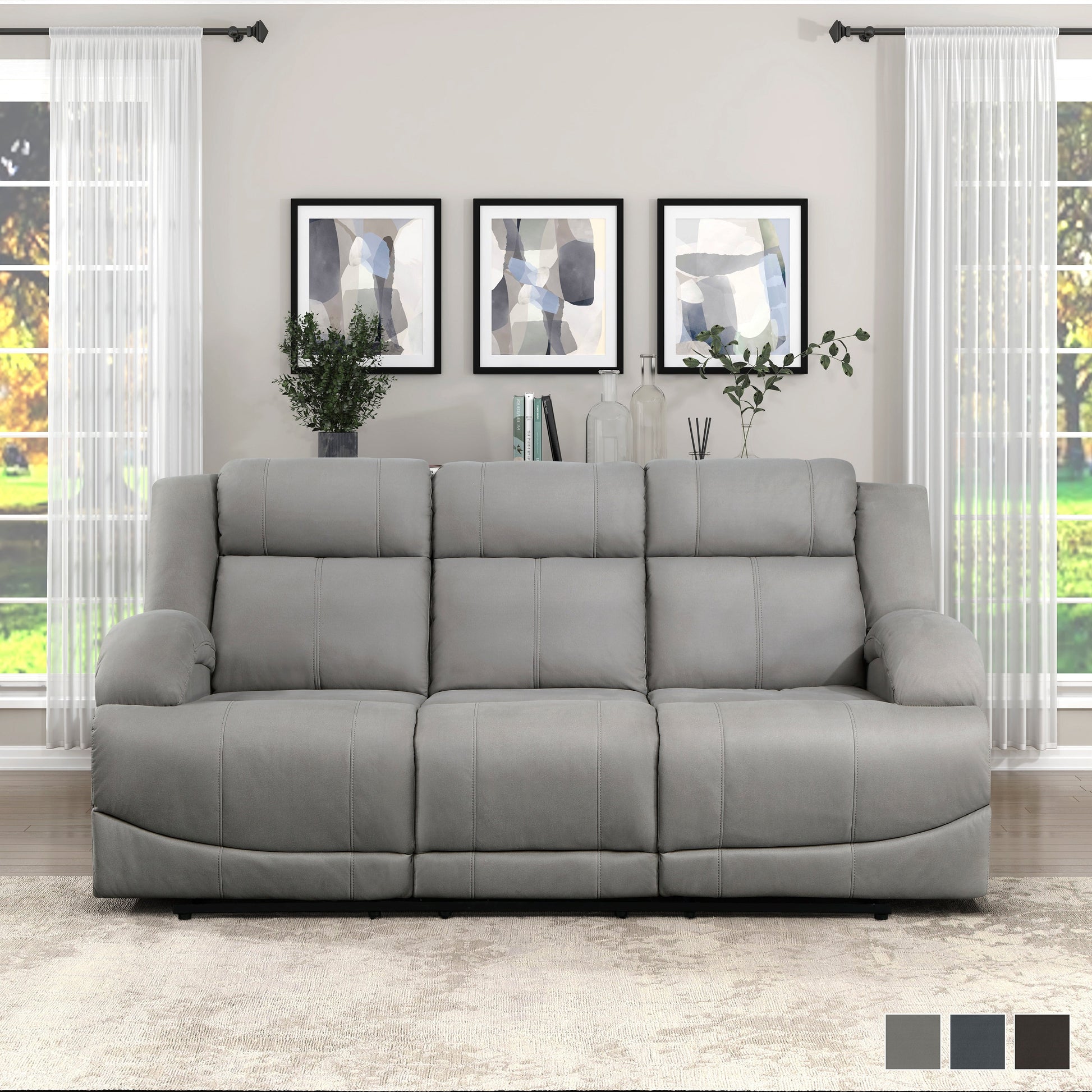 Complementing your living roomâs transitional style is the Sherwood Collection. The manual reclining mechanism of the sofa allows for ease of motion when going from seated to reclined. Contoured stitching defines the seating of the group while the Chocolate, Graphite Blue, or Gray polished microfiber upholstery that covers the collection is a subtle pop of color for your living roomâs décor.