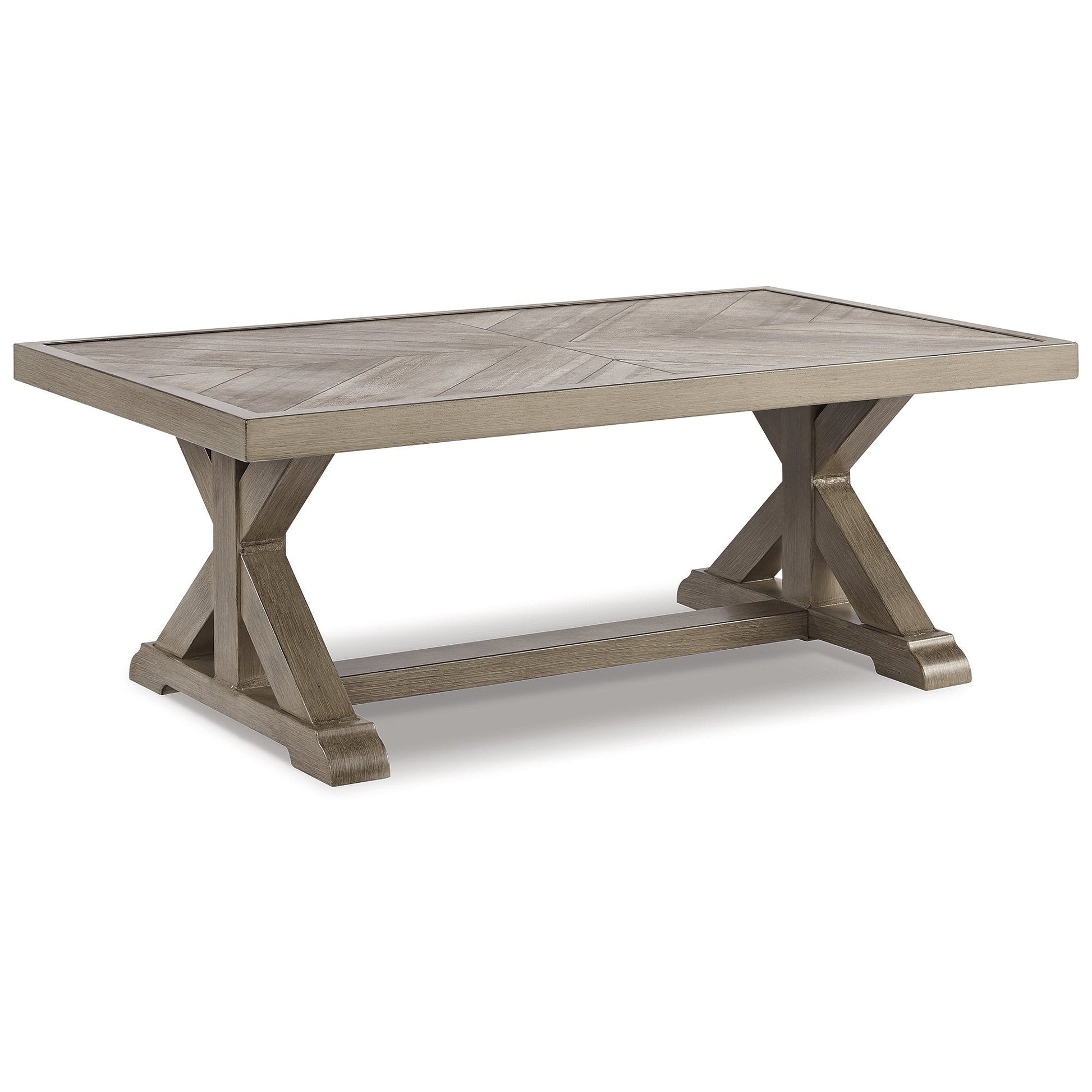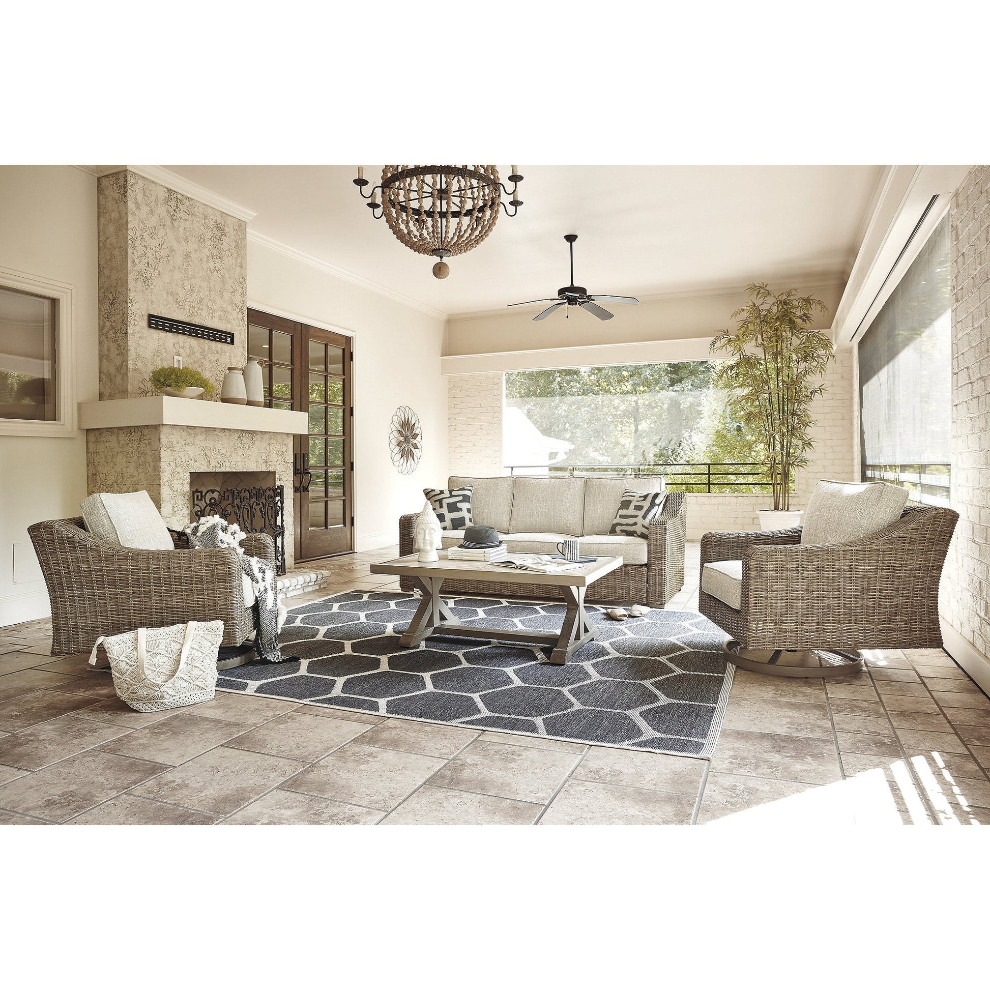 Sporting an easy-on-the-eyes look inspired by driftwood, this outdoor conversation set elevates the art of alfresco living. Beautiful and durable enough for indoor or outdoor use, the pieces blend high style with low maintenance. The coffee table charms with X-leg farmhouse styling and a thick porcelain top that's a natural complement. The sofa and swivel lounge chairs entice with plush, removable cushions wrapped in Nuvella? fabric that's a breeze to keep clean.
