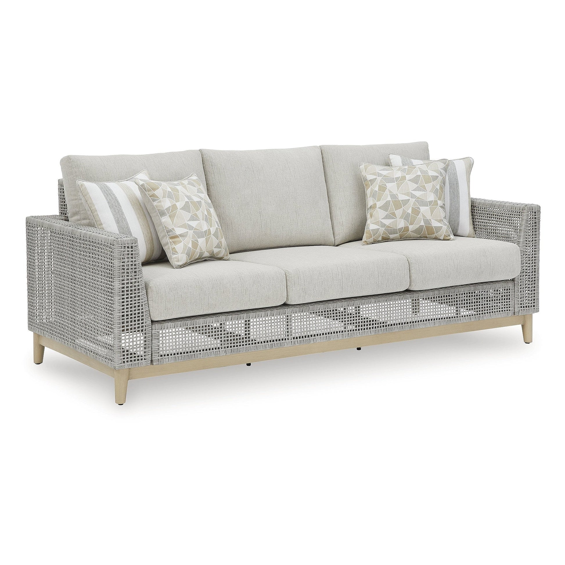 This sofa invites your casual contemporary style outdoors. With its resin wicker in a chic neutral hue, it expertly marries refined design with durability. Breezy summer mornings and cold winter nights are made all the more comfortable with high-performance Nuvella+? fabric covering the cushion.